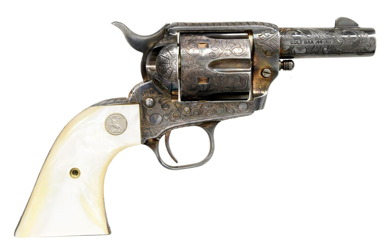 Cal. 44-40. S# SA38933. Bbl. 3". Round blade front sight. Fixed rear sight. 3rd generation Colt SAA. Mfg. 1980 the first year of 3rd Gen Sheriff's Model production. Silver plate finish w/ floral engraving on about 75% of surfaces. No visible signature to denote who did the engraving. Factory faux Mother of Pearl grips w/ silver Rampant Colt medallions. CONDITION: grips show a couple light dings, scratches & some handling wear. Metal is starting to flake inside grip frame & may benefit from a professional cleaning. Metal also shows a few external spots of flaking, some edge wear & a few spots of light oxidation. Very good bore. (23-4964/MJC). MODERN. $3000-5000.