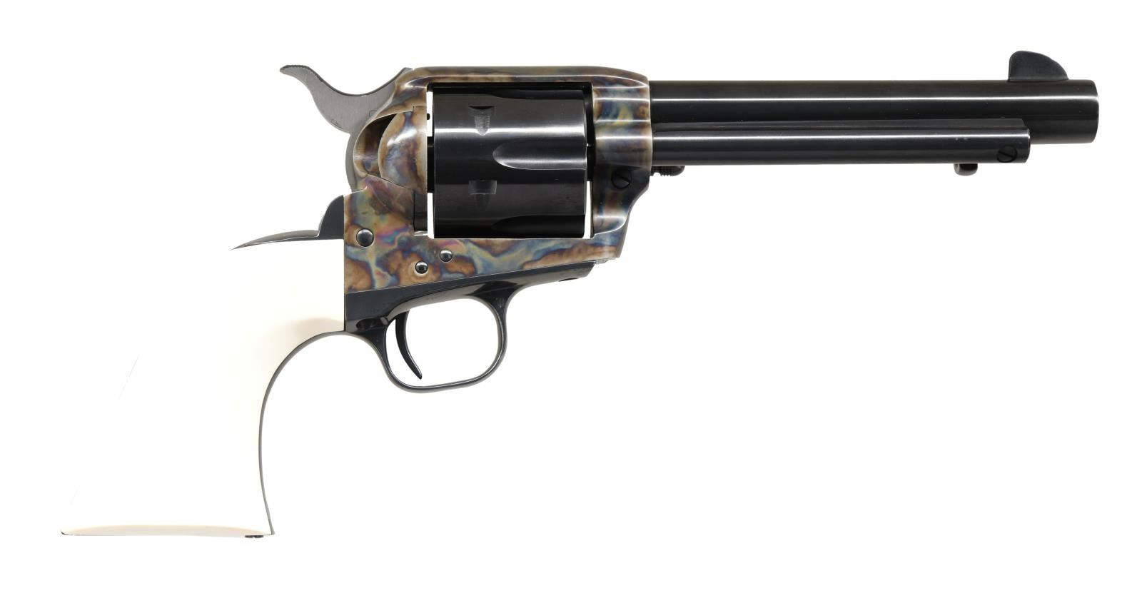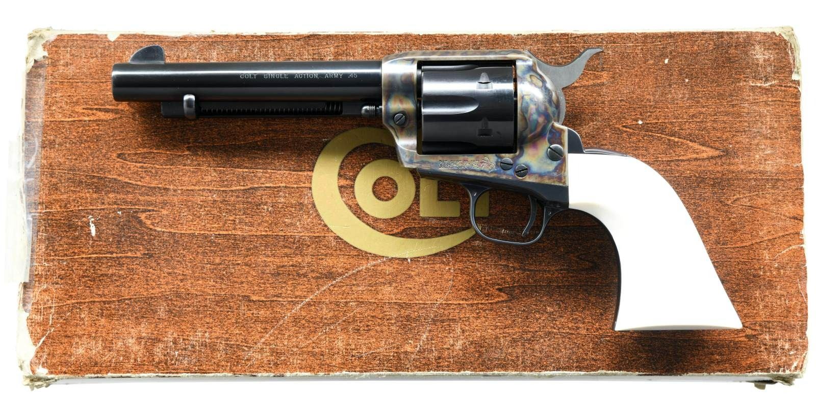ARMY REVOLVER WITH BOX. Cal. 45 Colt. S# 85671SA. Bbl 5 1/2". Third generation Single Action Army revolver manufactured by Colt in 1977. The left side of the barrel is stamped "COLT SINGLE ACTION ARMY .45", with Colt's single line address across the top. Left side of frame bears patent information, followed by the Rampant Colt logo. Frame exhibit a case color hardened finish, with the cylinder, barrel, ejector rod housing, and grip straps exhibiting a blued finish. Frame is mounted with a 1 piece faux ivory grip. All numbers are matching and are present on the frame, cylinder, grip straps, and are handwritten on the interior of the grip. UNATTACHED ACCESSORIES: matching factory cardboard box containing its factory insert and a pair of non-matching 2 piece Colt checkered black plastic grips. CONDITION: excellent, with the frame retaining bountiful amounts of its original vibrant case coloring, and with blued components showing few superficial marks from handling and storage overall. Cylinder bears an extremely light dragline. Mirror bore, exhibiting well defined rifling throughout. Grip is excellent. Box shows exterior wear, with some mild tearing and losses at some corners, some taped repairs, as well as one end flap having torn off but remaining present. (23-1787/MLW). MODERN. $2,250-3,500
