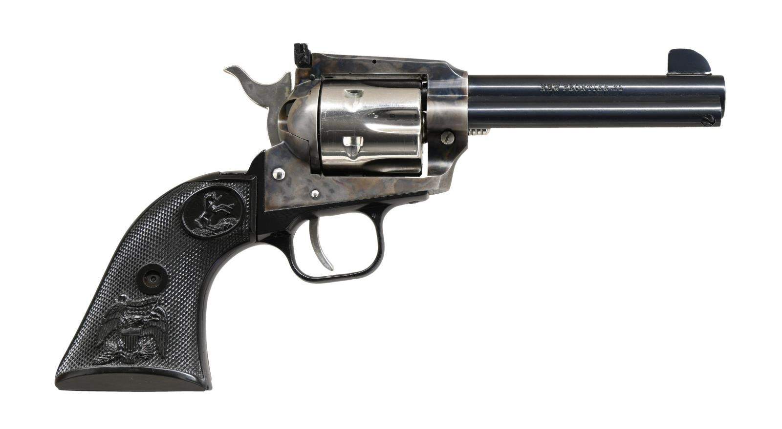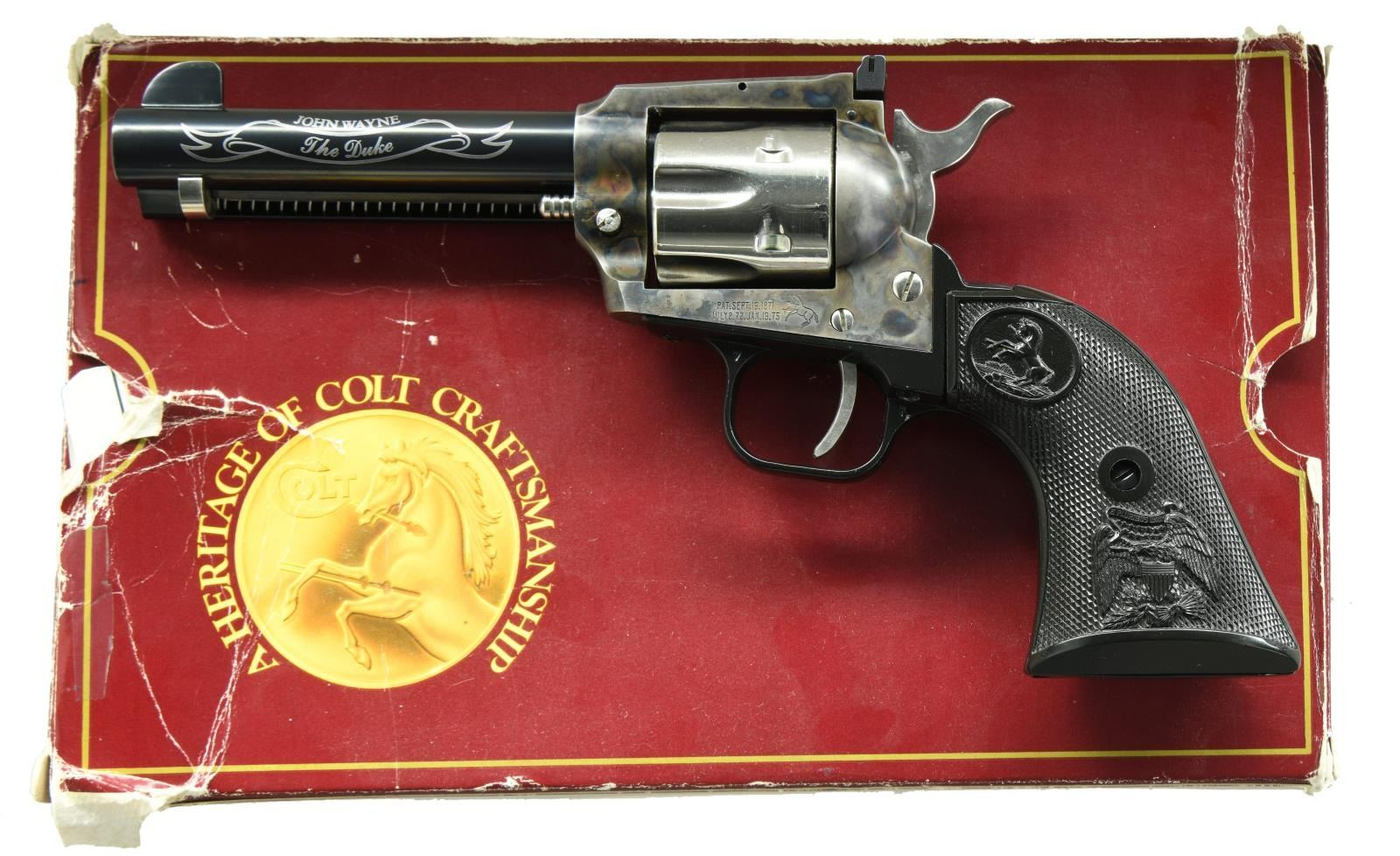 NEW FRONTIER REVOLVER WITH FACTORY BOX. Cal. 22 LR. S# G212726. Bbl 4 3/8". John Wayne "The Duke" commemorative New Frontier revolver manufactured by Colt in 1984. The left side of the barrel is marked "JOHN WAYNE" above a banner reading "The Duke" in silver, with Colt's single line address across the top, and "NEW FRONTIER .22" stamped on the right. Left side of frame bears patent information, followed by the Rampant Colt logo. Frame exhibits a case color hardened finish, with the cylinder & cylinder pin being nickeled, the barrel being blued, and with the grip aluminum grip straps exhibiting a black anodized finish. Frame is mounted with 2 piece Colt checkered black plastic grips. UNATTACHED ACCESSORIES: matching Colt factory box containing its styrofoam insert and factory paperwork. CONDITION: excellent, with metal components retaining bountiful amounts of their original factory applied finishes. Frame retains strong and vibrant case coloring overall. Cylinder bears a light dragline. Mirror bore, exhibiting well defined rifling throughout. Grips are excellent. Box show some exterior wear, with some areas of tearing, but otherwise remains sturdy and serviceable. (23-1772/MLW). MODERN. $600-900.