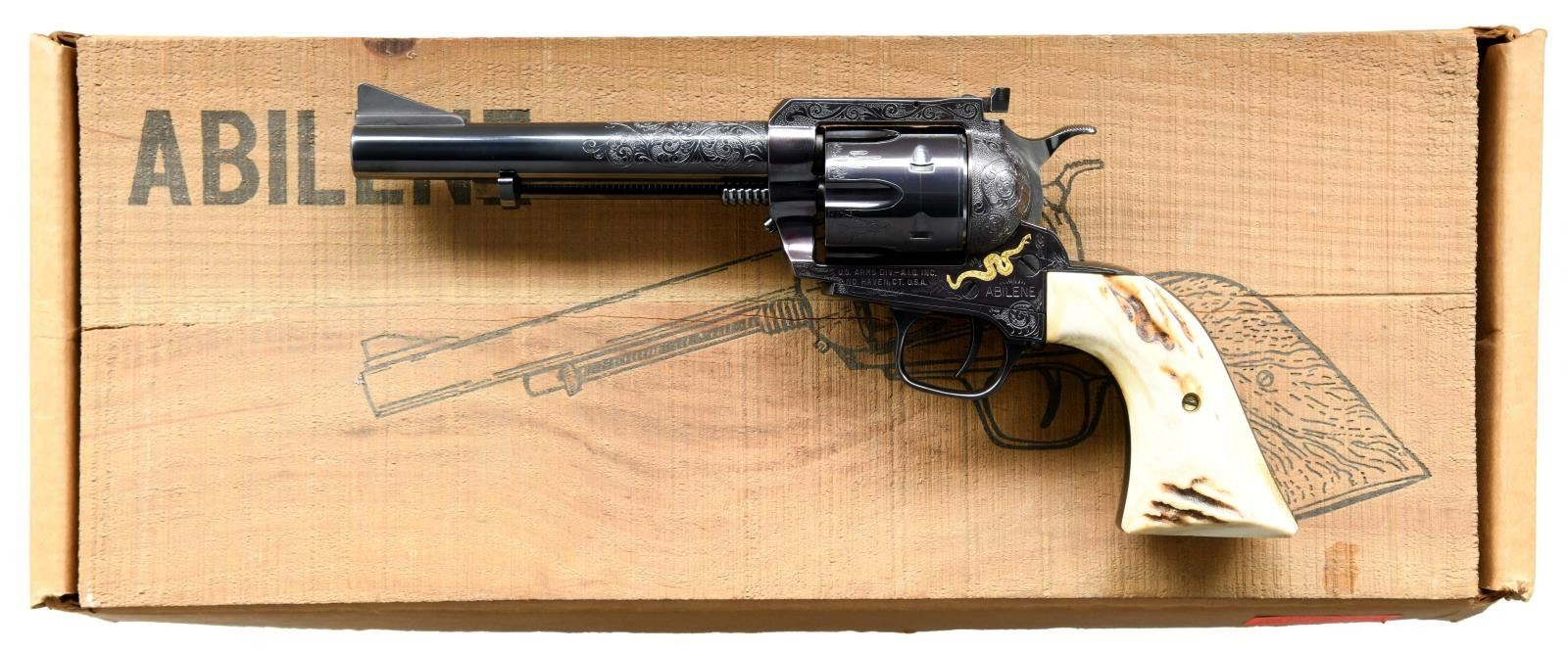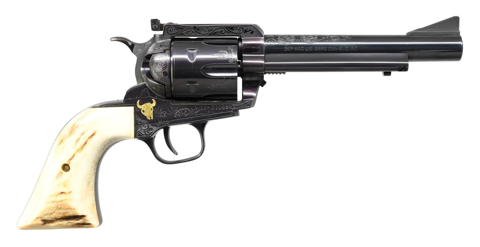 REVOLVER WITH BOX. Cal. 357 Mag. S# 10-010688. Bbl 6". Abilene single action revolver manufactured by US Firearms of North Haven, CT. Right side of barrel is stamped "357 MAG U.S. ARMS DIV-A.I.G. INC.", with additional manufacturer information stamped on the left side of the frame, followed by "ABILENE". Frame and barrel exhibit scroll engraving on a punch dot background, with the left side exhibiting a scene of a gold snake, and the right a scene of a bison skull. Bottom of trigger guard exhibits a gold Ace of Spades playing card. Rear face of cylinder is stamped "AMZ". Metal components are blued, with the frame being mounted with 2 piece stag grips. UNATTACHED ACCESSORIES: factory box containing its factory manual. CONDITION: excellent, with metal components retaining bountiful amounts of their blue finish, exhibiting few minor marks from handling and storage. Cylinder bears a very light dragline. Very bright bore, exhibiting some mild surface oxidation and strong rifling throughout. Grips are very good overall. Box shows some minor exterior wear, but otherwise remains sturdy and serviceable. (23-1769/MLW). MODERN. $1,000-1,500.