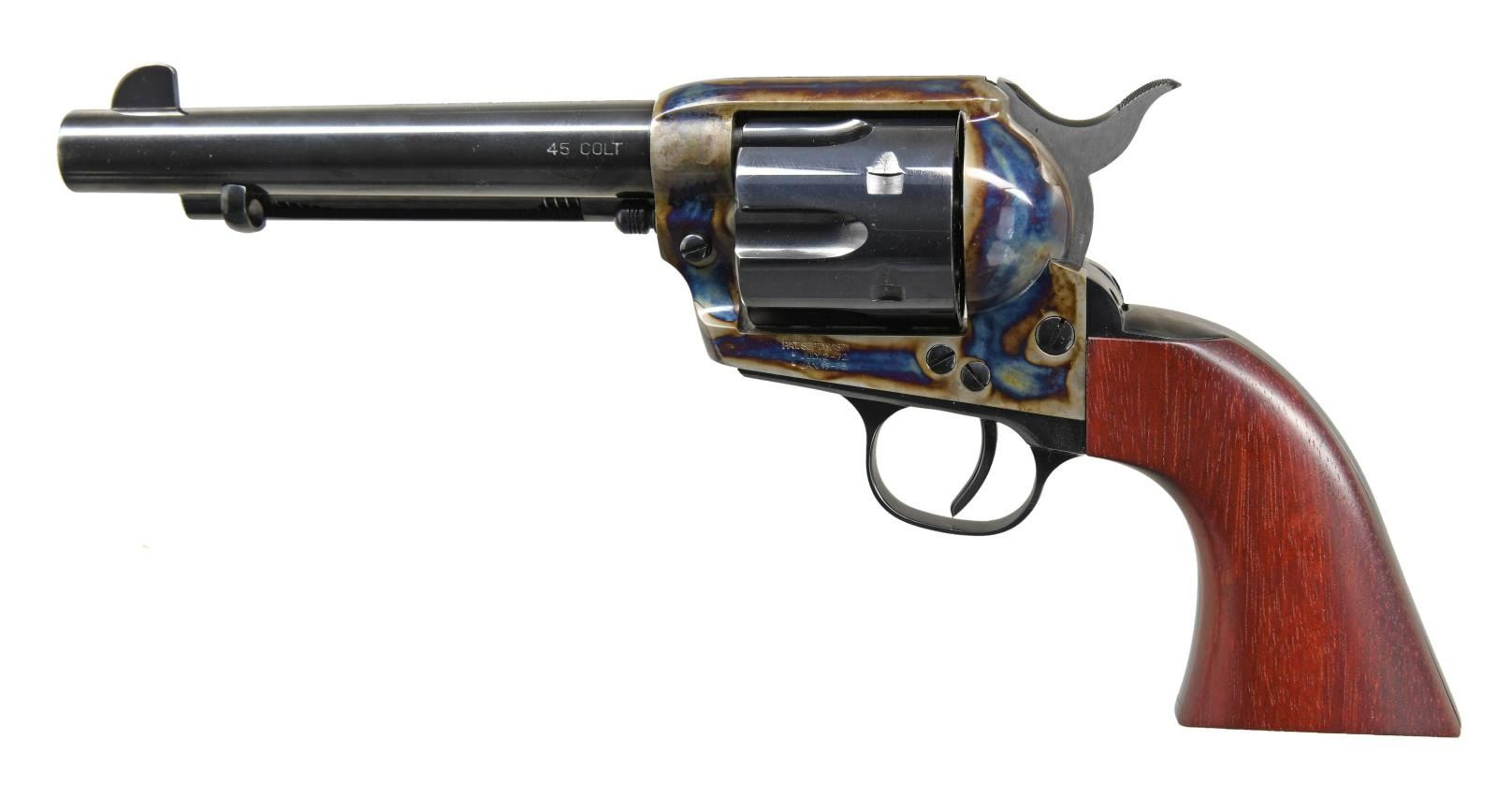 ARMY REVOLVER WITH FACTORY BOX. Cal. 45 Colt. S# 28569. Bbl 5 1/2". Single Action Army revolver manufactured by US Patent Firearms Manufacturing Company of Hartford, CT. The left side of the barrel is stamped "45 COLT", with US Patent Firearms Manufacturing Company's single line address across the top. Left side of frame is stamped with 3 line patent information. Frame exhibits a case color hardened finish, with the cylinder, barrel, ejector rod housing, and grip straps being blued. Matching numbers are present on the frame, cylinder, and interior of the grip. UNATTACHED ACCESSORIES: factory box and box sleeve, containing a matching box, box sleeve, US Patent Firearms brown checkered plastic grips, as well as a spare cylinder and factory paperwork. CONDITION: very good overall, with metal components retaining the vast majority of their original factory applied finishes overlal, with some mild wear at the muzzle and a small area of loss on the left side of the frame, appearing to be from cleaned oxidation. Mirror bore, exhibiting well defined rifling throughout. Right grip panel has come unglued, but otherwise grips show few minor marks from storage and handling overall. Box is very good. (23-1734/MLW). MODERN. $1,000-1,500.