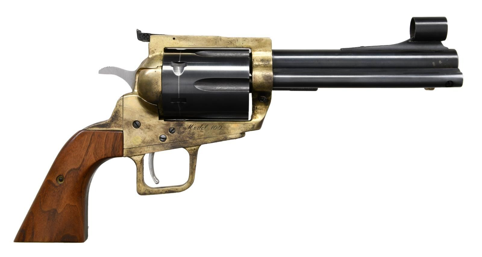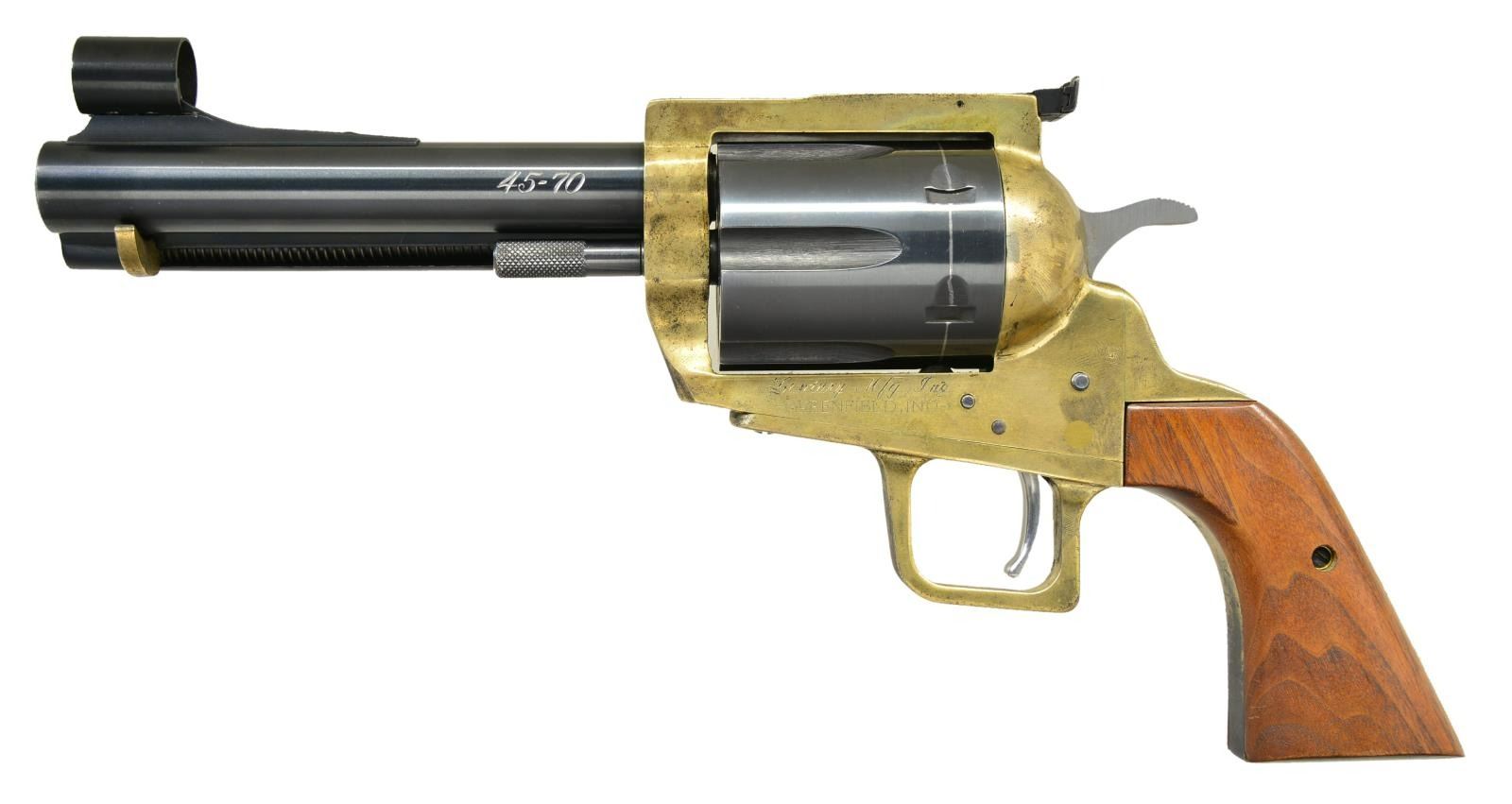 SINGLE ACTION REVOLVER. Cal. 45-70. S# 1014. Bbl. 6.5". These single action revolvers were manufactured in several configurations from 1973-1999. This is the version w/o a crossbolt safety. Sand cast bronze frame. Blued steel, round barrel w/ blued steel 6 shot fluted cylinder. Hooded, drift windage adjustable front blade & elevation adjustable rear sights. Serrated hammer spur. Weighs in at 5lbs, 14oz. 2 piece hardwood grips. CONDITION: Bronze frame demonstrates elements of natural patina, staining & some cleaned areas. Blued finish is complete & consistent w/ some tiny spots of thinning & a drag line on cylinder. Cylinder is slightly out of time, though so slight that normal functioning overcomes it easily. Bore is bright w/ strong rifling. PROVENANCE: From the Lifelong Collection of Glen E. Mattox. (23-78/JZ). MODERN. $700-1,100.
