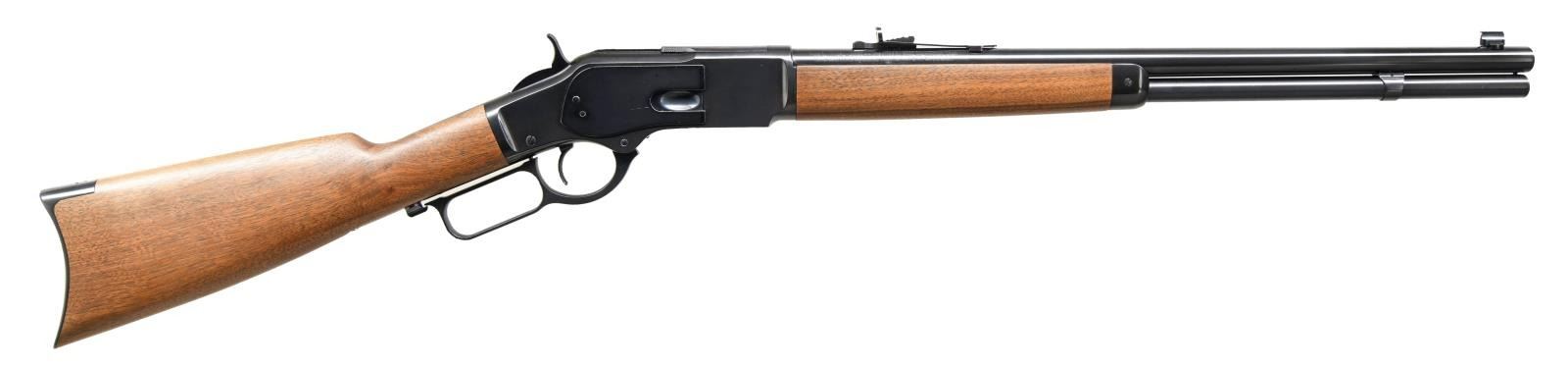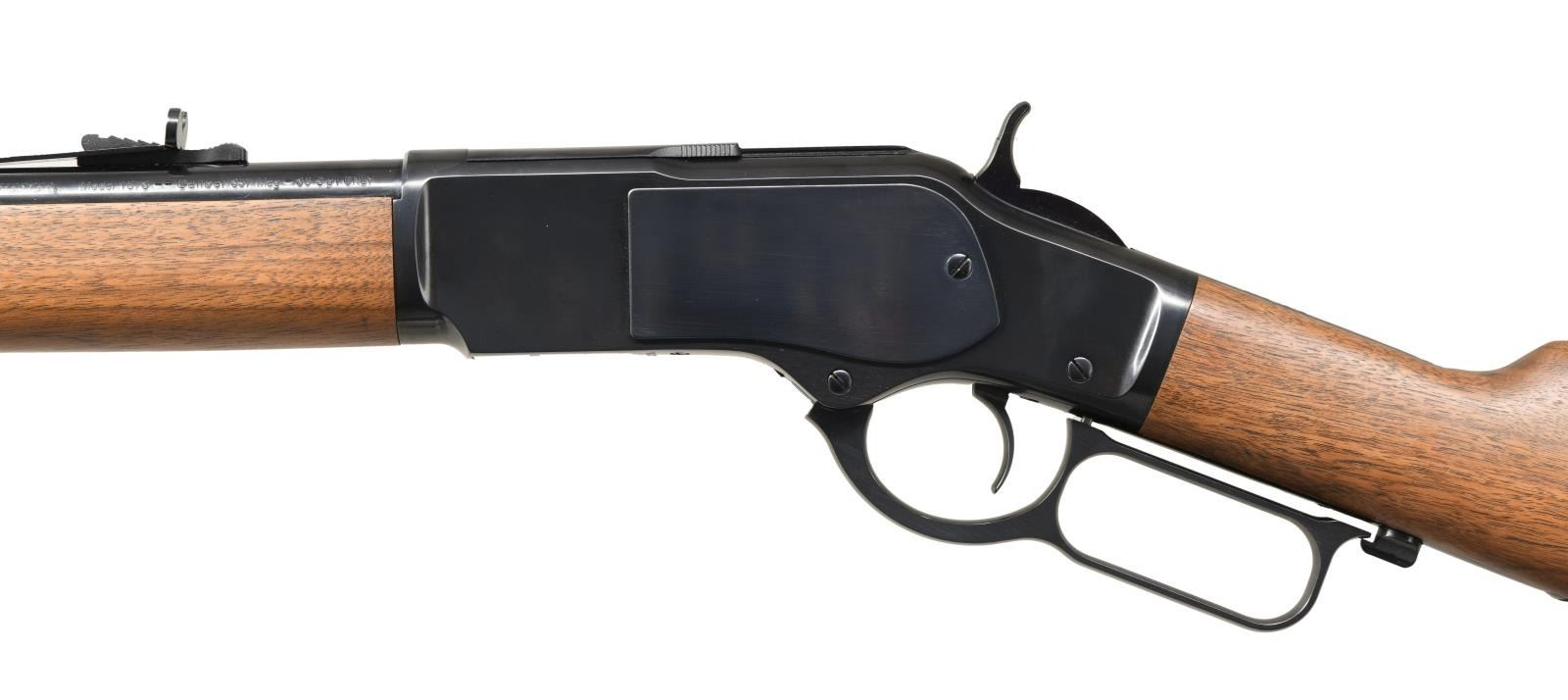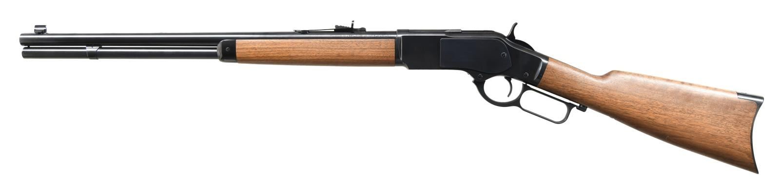MATCHING FACTORY BOX. Cal. 357 Mag. S# 00039ZX73A. Bbl 20 1/4". Model 1873 lever action rifle manufactured by Miroku and imported by BACO Inc. of Morgan, UT. The left side of the barrel is stamped with the Winchester trademark logo, followed by the model designation and "- Caliber 357 Mag - 38 Spl ONLY", with BACO Inc.'s importer information on the right. Metal components exhibit a blued finish. Smooth plain straight grip wood buttstock with plain forend. Brass beaded blade front sight with semi-buckhorn U-notch rear sight. UNATTACHED ACCESSORIES: matching factory box containing its factory styrofoam insert. CONDITION: near new, with metal components retaining virtually all of their original factory blue finish overall. Brilliant mirror bore, exhibiting well defined rifling throughout. Wood furniture is excellent overall. Box shows some mild exterior wear from handling and storage, but otherwise is very good overall. PROVENANCE: The Collection of Gun Sport Ltd. owned by Jon R. Thomas. (23-3249/MLW). MODERN. $1,000-1,500.