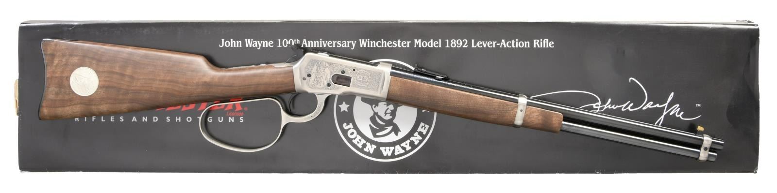 CENTENNIAL HIGH GRADE LEVER ACTION RIFLE RIFLE WITH FACTORY BOX. Cal. 44-40. S# JW100H2463. Bbl 18 1/2". Model 1892 John Wayne Centennial rifle manufactured by Miroku and imported by BACO Inc. of Morgan, UT. Left side of barrel bears the Winchester trademark logo, followed by stampings stipulating the model and caliber designations, with the right side bearing BACO Inc.'s importer information. Top of barrel bears John Wayne's signature. Left side of receiver exhibits scroll engraving on a punch dot background, with a portrait of John Wayne sitting atop a horse within a rope border followed by a banner reading "1907", "JOHN WAYNE AMERICAN", and "2007". Right side of receiver bears matching scroll engraving with a portrait of John Wayne within a rope border, with a banner reading "COURAGE", "STRENGTH", and "GRIT", followed by a banner reading "JOHN WAYNE" above "JW" and an additional banner reading "CENTENNIAL". Large loop lever features light scrollwork on the left and right sides. Receiver, lever, and barrel bands are polished in the white, with the barrel, hammer, trigger, and buttplate exhibiting a blued finish. Smooth wood buttstock and forend. Right side of buttstock is inlaid with a John Wayne medallion. Additional features include a receiver mounted saddle ring, tang safety, brass blade front sight, with a flip-up U-notch rear sight. UNATTACHED ACCESSORIES: factory box with commemorative sleeve, containing styrofoam insert and factory paperwork. CONDITION: extremely fine, with metal components retaining bountiful amounts of their original factory applied finish overall. Brilliant mirror bore, exhibiting well defined rifling throughout. Wood furniture is excellent overall. Box and sleeve exhibit some mild external wear, but otherwise remain sturdy and serviceable. An extremely fine example of a Winchester Model 1892 John Wayne Centennial rifle. (23-2355/MLW). MODERN. $1,200-1,800.