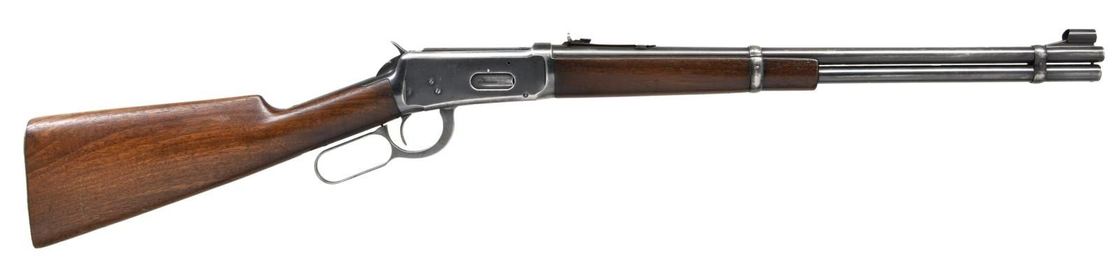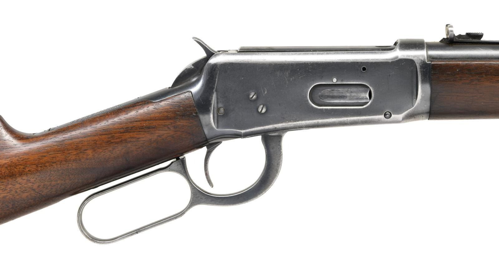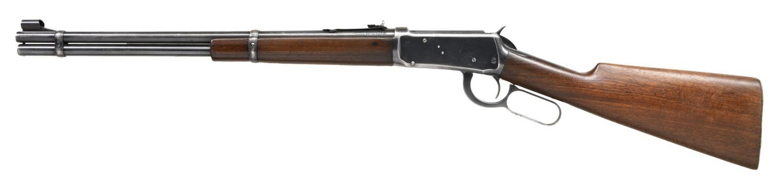 Cal. 30 WCF. S# 1304540. Bbl. 20" rnd. Mfg. 1942-1948 era. Ramped bead front sight w/ hood. Sporting rear sight. Blue finish. Straight grip walnut stock & forend. Serrated steel buttplate. CONDITON: stock shows the remnants of an added finish that has mostly flaked off, scattered dings & handling wear. Metal retains 50% original blue w/ scattered light oxidation, edge & handling wear. Very good plus bright bore. (23-4860/MJC). CURIO. $400-550.