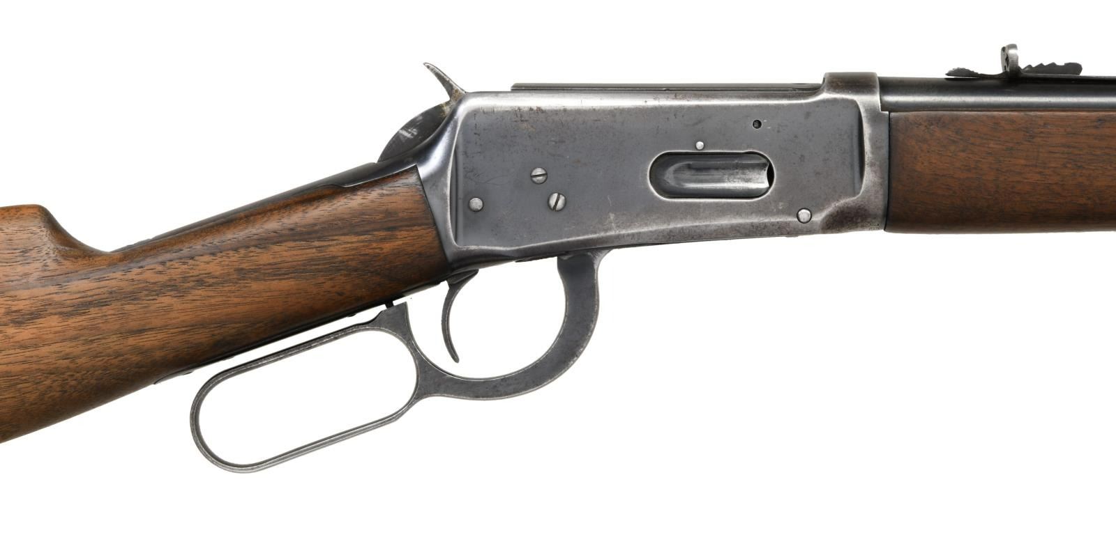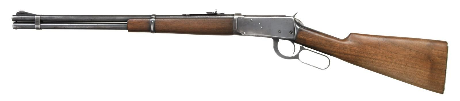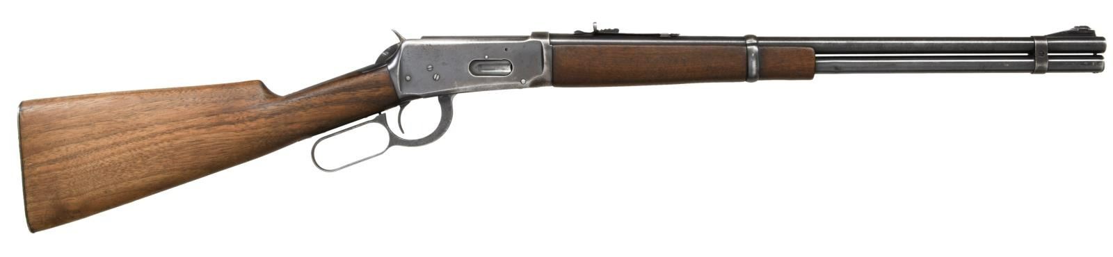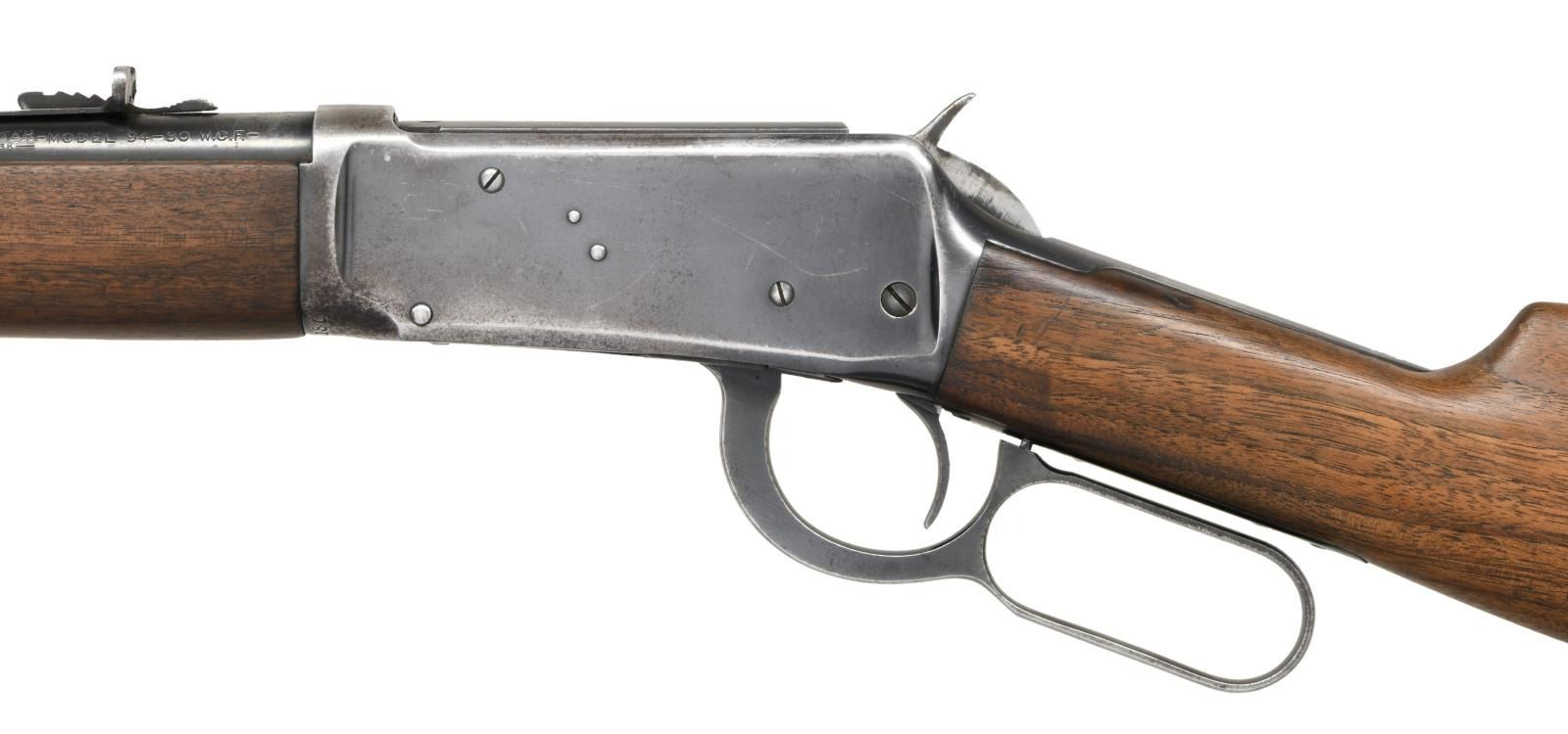 CARBINE. Cal. 30 WCF. S# 1382150. Bbl 20". Model 1894 lever action carbine manufactured by Winchester in 1942. Left side of the barrel exhibits stampings stipulating Winchester's manufacturer information, as well as the model and caliber designations. Metal components exhibit a blued finish overall. Plain straight grip buttstock with flat checkered metal buttplate, and plain wood forend. Ramped blade front sight with U-notch rear sight. Flat front barrel band. CONDITION: metal components retain large amounts of their original factory blue finish, exhibiting areas of wear and thinning overall that show through to pleasant brown and gray patinas. Very bright bore, exhibiting some scattered spots of light pitting and well defined rifling throughout. Wood furniture shows some scattered marks from handling and storage, but is otherwise good overall. (23-3042/MLW). CURIO. $800-1,200.