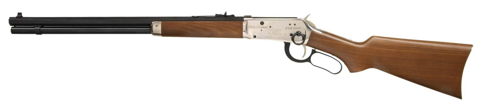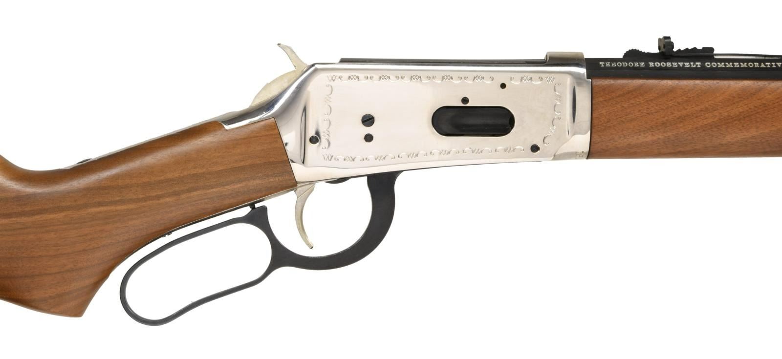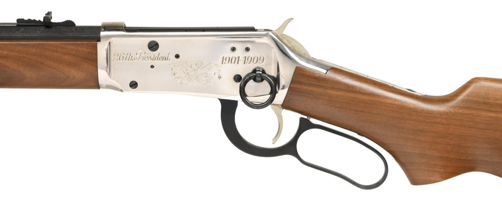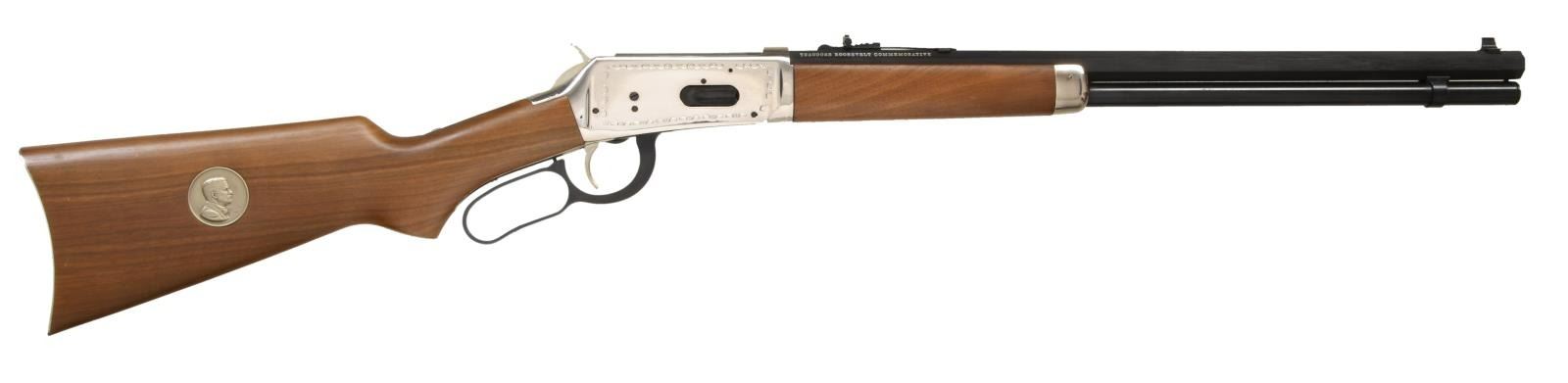 THEODORE ROOSEVELT COMMEMORATIVE LEVER ACTION RIFLES WITH BOXES. Cal. 30-30. S# TR16781. Bbl 20". Model 94 saddle ring carbine manufactured by Winchester commemorating Theodore Roosevelt. Left side of barrel is stamped with the Winchester trademark logo followed by stampings stipulating the model and caliber designations, with the right side being stamped "THEODORE ROOSEVELT COMMEMORATIVE". The left side of the receiver is marked "26th President" followed by a patriotic eagle and "1901-1909", with a lightly engraved decorative border on the right. Receiver is nickel plated, with the barrel and lever being blued. Smooth wood buttstock features a Theodore Roosevelt medallion inlaid on the right side, with the smooth wood forend exhibiting a nickel plated nosecap. Beaded blade front sight with U-notch rear sight. UNATTACHED ACCESSORIES: original factory box with commemorative cardboard sleeve. CONDITION: excellent, with metal components retaining bountiful amounts of their factory nickel and blue finish overall. Mirror bore, exhibiting well defined rifling throughout. Wood furniture is very excellent overall. Box exhibits wear, some tearing, as well as some staining overall. Sleeve exhibits exterior wear with tearing, wear, and no longer retains its end flaps. (23-2357) Cal. 30-30. S# TR16780. Bbl 26". Model 94 saddle ring lever action rifle manufactured by Winchester commemorating Theodore Roosevelt. Rifle exhibits matching stampings and engravings to the carbine. right. Receiver is nickel plated, with the barrel and lever being blued. Smooth wood buttstock features a Theodore Roosevelt medallion inlaid on the right side, with the smooth wood forend exhibiting a nickel plated nosecap. Beaded blade front sight with U-notch rear sight. UNATTACHED ACCESSORIES: original factory box and commemorative sleeve. CONDITION: excellent, with metal components retaining bountiful amounts of their original factory nickel and blue finish. Mirror bore, exhibiting well defined rifling throughout. Wood furniture is excellent. Box shows some mild wear, with minor tearing, and some staining. Sleeve exhibits some tearing at the corners, wear overall, taped repairs, and no longer retains its end flaps, but otherwise retains a good graphic. (23-2358/MLW). BOTH MODERN. $1,200-2,000.