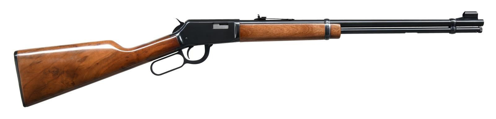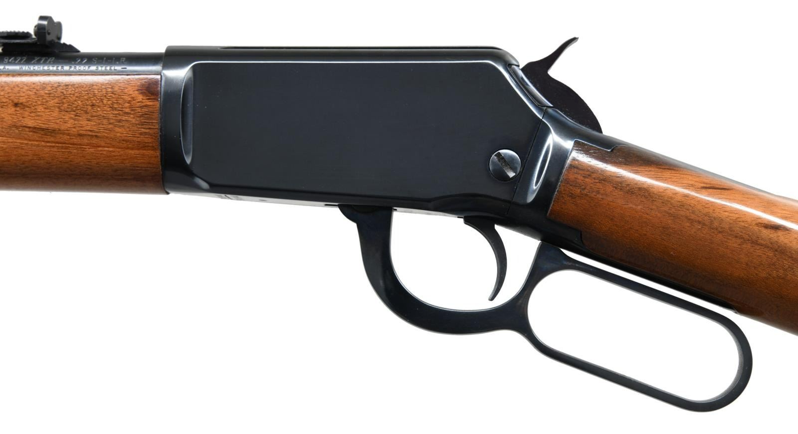 Cal. 22 S, L & LR. S# F340844. Bbl. 20". Ramp mounted bead front sight w/ hood. Adjustable sporting rear sight. Grooved receiver. Blued finish. Walnut straight grip stock & forend. Black checkered factory buttplate. CONDIITON: left side of butt shows a couple spots of filler repair, stock set otherwise shows a few light handling marks. Other aspects rate near excellent. (23-863/MJC). MODERN. $1000-1500.