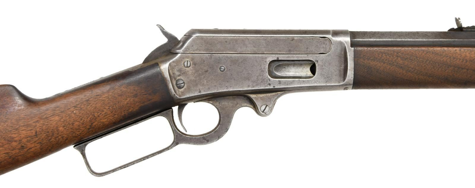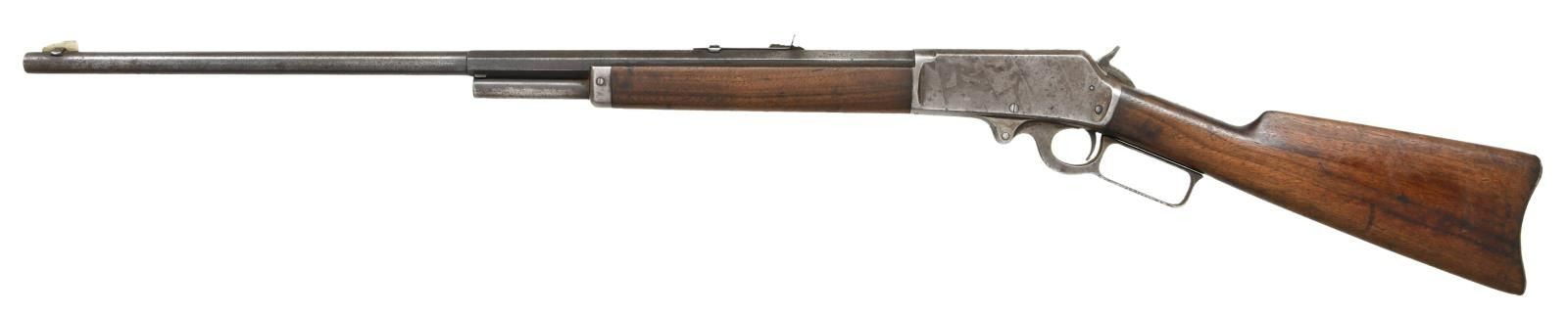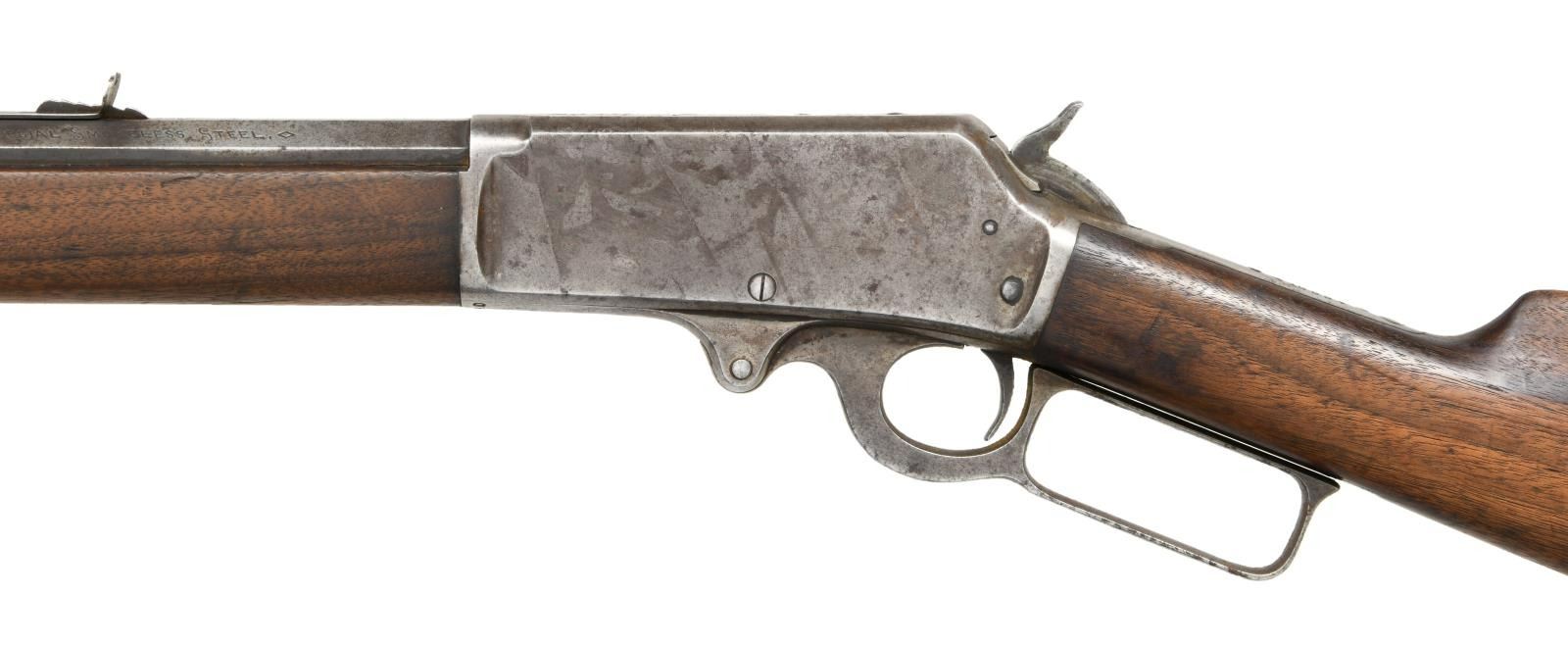 Cal. 30-30. S# 438490. Bbl. 26" octagon to round. Rocky mountain front sight w/ replacement rear sight. 1/2 length mag. Blue & case colored finish. Walnut forearm & straight grip stock w/ crescent steel buttplate. CONDITION: metal retains 30% dull fading worn finish showing spots of corrosion & light pitting. Wood has dark worn appearance w/ scratches, marks & small dents. Dark lightly pitted bore. (23-4826/DS). CURIO. $700-1000.