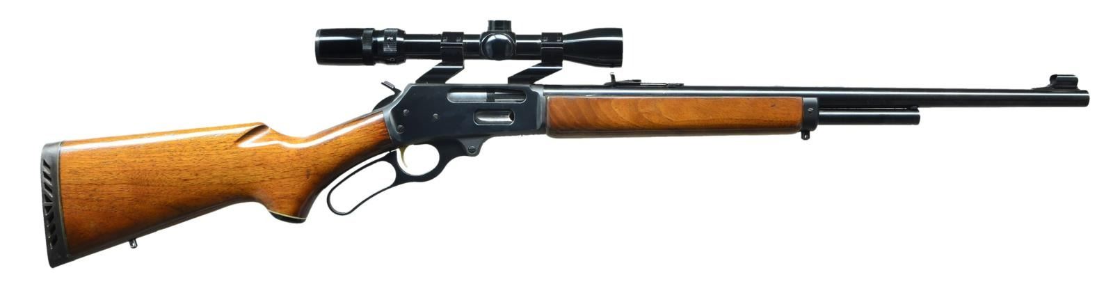 Cal. 444 Marlin. S# 22086383. Bbl. 22". Mfg. 1978. Blued finish. Hooded front blade w/ elevation adjustable rear sight. Hardwood forend & stock w/ white spacer & black end cap on pistol grip. Rubber recoil pad in place of butt plate. Gold colored trigger. Micro groove rifling. Drilled & tapped receiver currently hosting O/U rings & Bushnell 3-9x Banner scope w/ duplex reticle. Checkered thumb extension on hammer. CONDITION: finish is complete & consistent. Wood demonstrates use in gentle finish thinning w/ a few small impressions. Scope glass is clear w/ sharp reticle. Bright bore w/ strong rifling. (23-532/JZ). MODERN. $500-700.