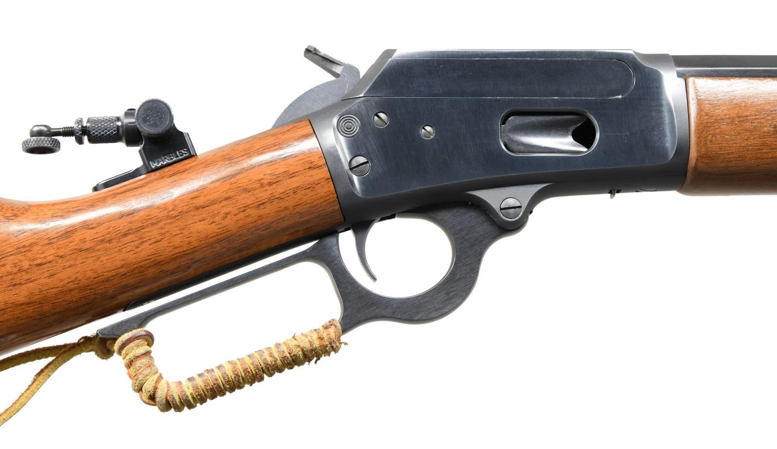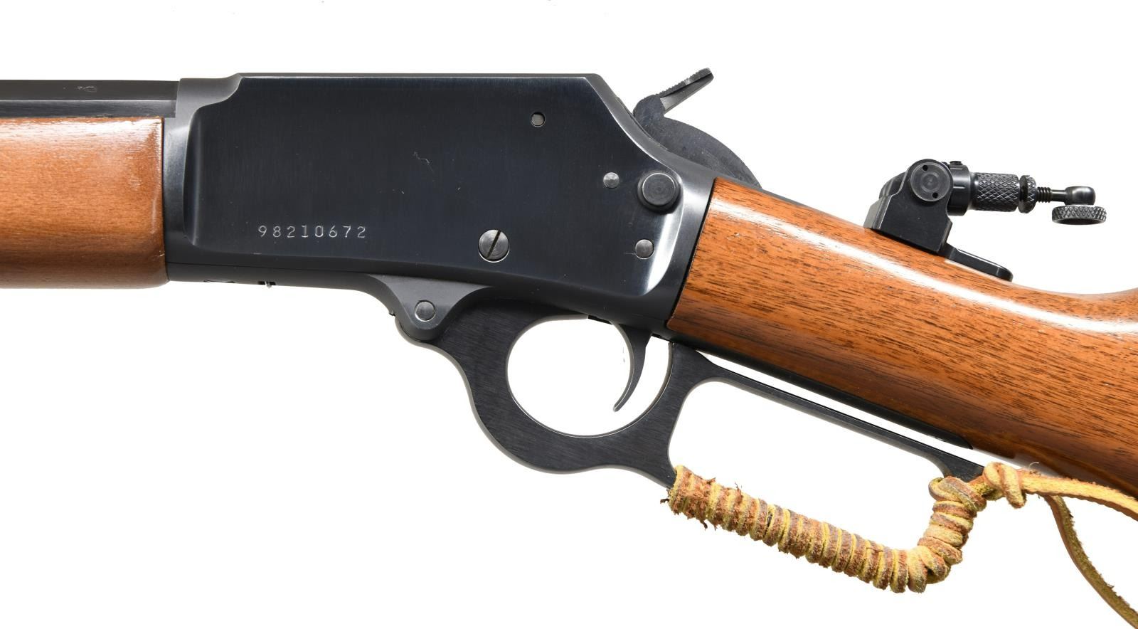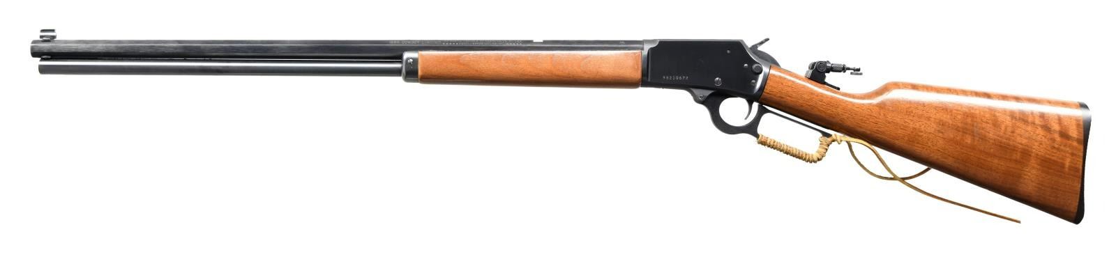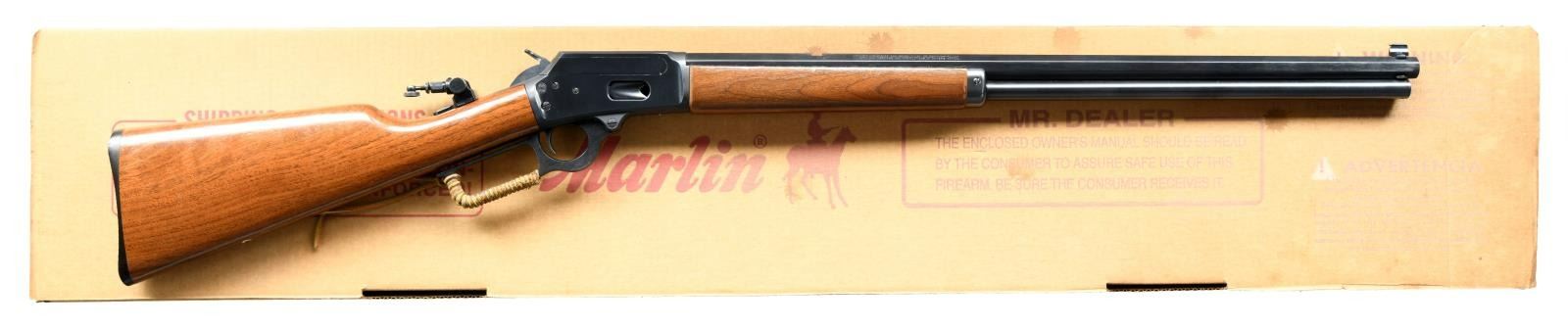 Cal. 45 Colt. S# 98210672. Bbl. 24" oct. Gold bead front sight. Tang mounted Marbles folding aperture rear sight. Bbl. sight slot is vacant. North Haven mfg. Marlin w/ crossbolt safety. Leather wrap present on lever. Plain walnut stock & forend w/ factory buttplate. UNATTACHED ACCESSORIES: factory box that is missing the lid where the serial number was, factory warranty card, NRA $10 off membership coupon, original gun shop receipt & other handwritten notes on the rifle. CONDITION: stock set has added varnish w/ some handling marks & light dings. Metal retains 97% original blue w/ some minor handling wear. Bright very good plus bore. (23-4936/MJC). MODERN. $1000-1500.