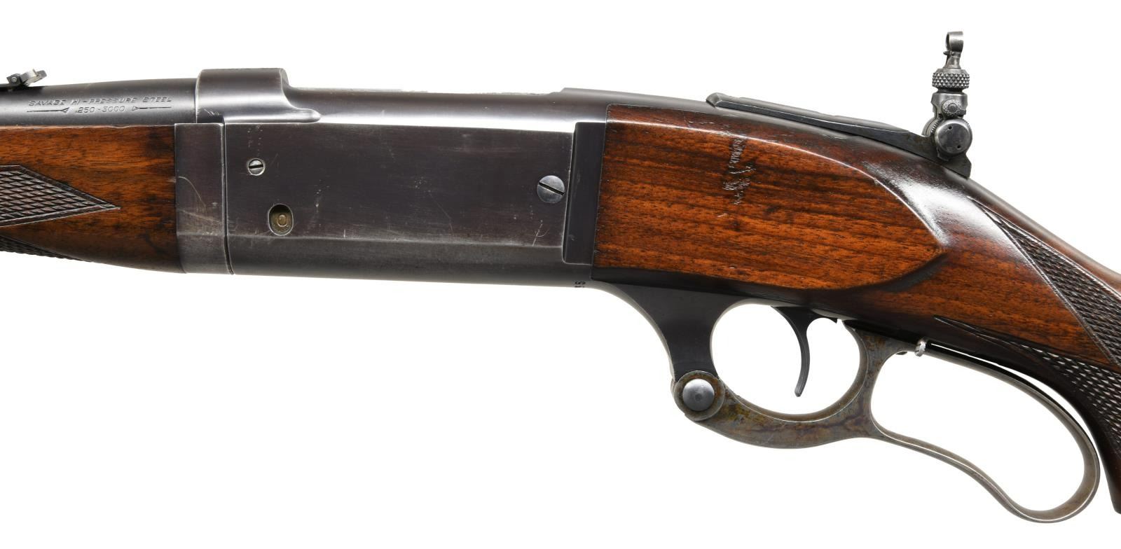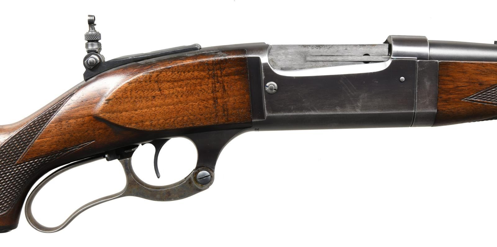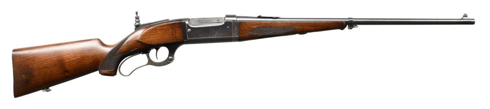 Cal. 250-3000. S# 228895. Bbl. 22". Bead front sight. Marbles folding leaf rear sight. Additional tang mounted folding Lyman aperture rear sight .Blue finish. Case colored lever. Checkered walnut stock w/ serrated steel buttplate, black grip cap & schnabel tipped takedown forend. Sling swivels present on bottom of butt & bbl. band. CONDITION: stock set shows a light chip in tip of forend, scattered handling marks & some dings. Lever retains strong amounts of case colors w/ scattered fading to gray & some light oxidation. Balance of metal retains 60% original blue w/ most wear on receiver due to carry, scattered edge wear, fading & freckling. Very good plus bright bore. PROVENANCE: The Collection of Gun Sport Ltd. owned by Jon R. Thomas. (23-3456/MJC). CURIO. $1,600-2,400.