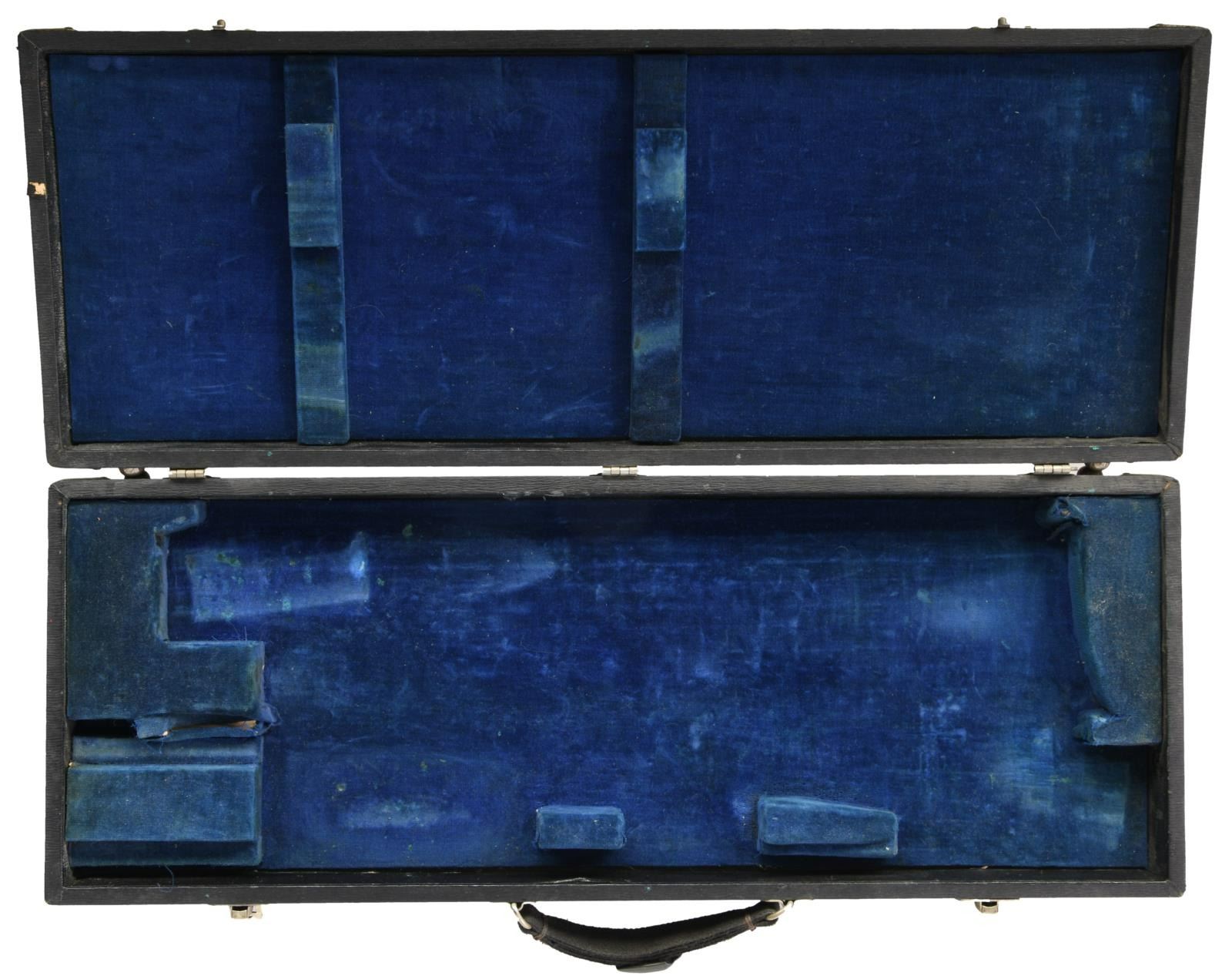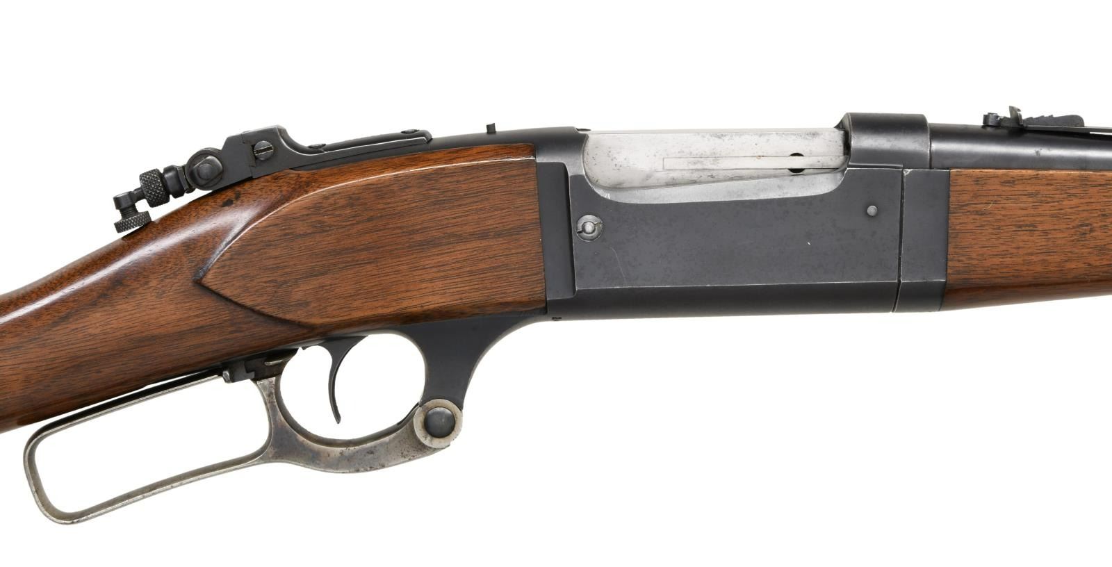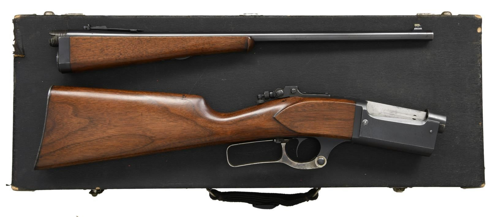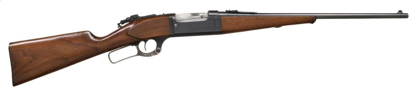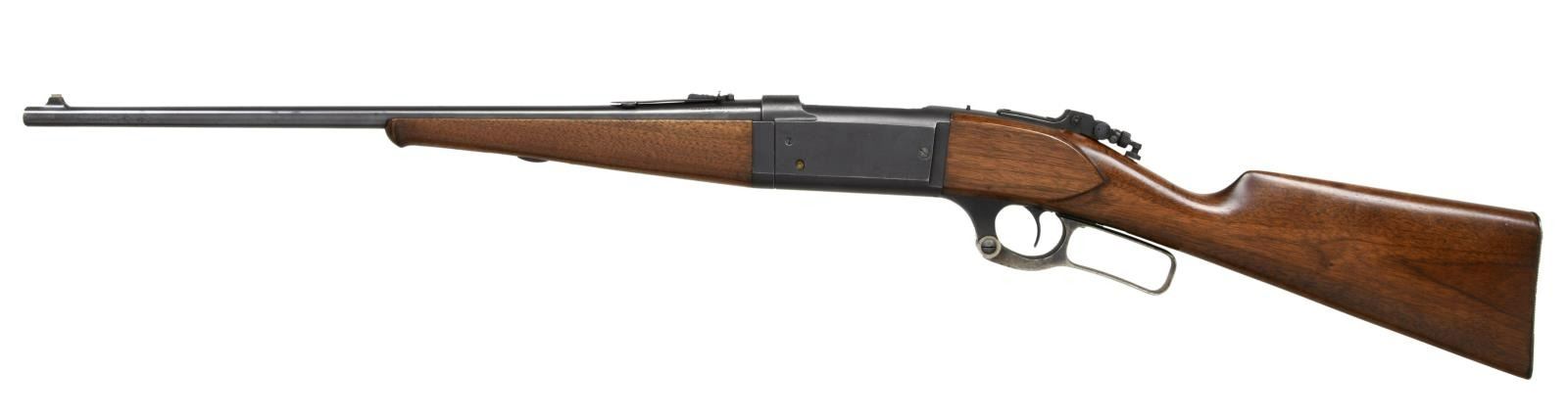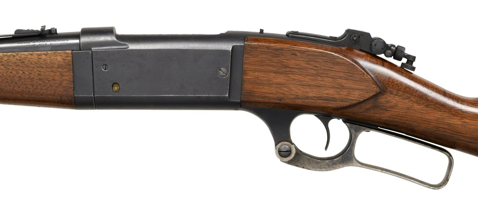 Cal. 303 SAV. S# 240040. Bbl 20". Model 1899 takedown lever action rifle manufactured by Savage in 1922. Top of barrel is stamped with Savage's 2 line address, with the caliber designation stamped on the left side at the breech. Receiver is stamped "SAVAGE/ 1899 MODEL" over the chamber. Metal components are blued, with furniture consisting of a plain wood straight grip buttstock and plain schnabel tip forend. Factory blade front sight, with Savage U-notch rear sight, and Lyman tang rear sights. UNATTACHED ACCESSORIES: black leatherette case featuring a blue velvet lining and containing 1 box of 20 rounds of Winchester 303 Savage Super Speed ammunition. CONDITION: metal components retain the majority of their original factory blue finish, exhibiting areas of wear and thinning, as well as areas of light surface oxidation overall. Lever retains fair amounts of its original case color hardened finish, exhibiting scattered spots of discoloration. Bright bore, exhibiting some scattered spots of pitting and retaining strong rifling throughout. Wood furniture shows some scattered marks from handling and storage, but is otherwise very good overall. Case shows some exterior wear and some losses to its leatherette exterior at the edges, but otherwise remains sturdy and serviceable. PROVENANCE: From the Estate of Jon Thomas. (23-1663/MLW). CURIO. $1,000-1,500.