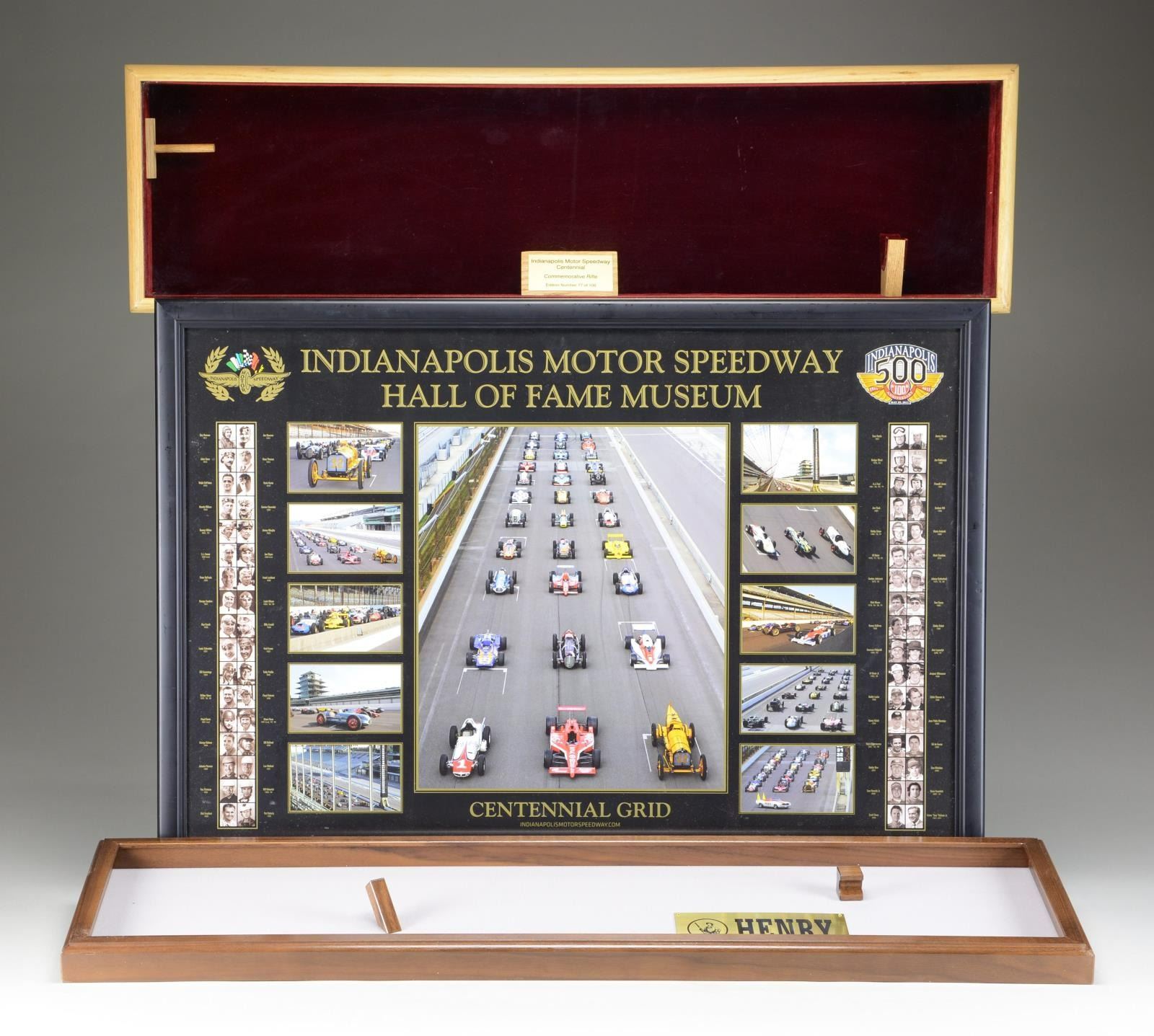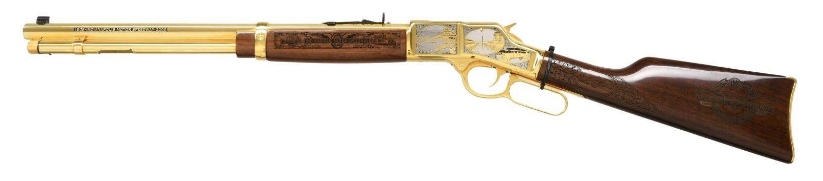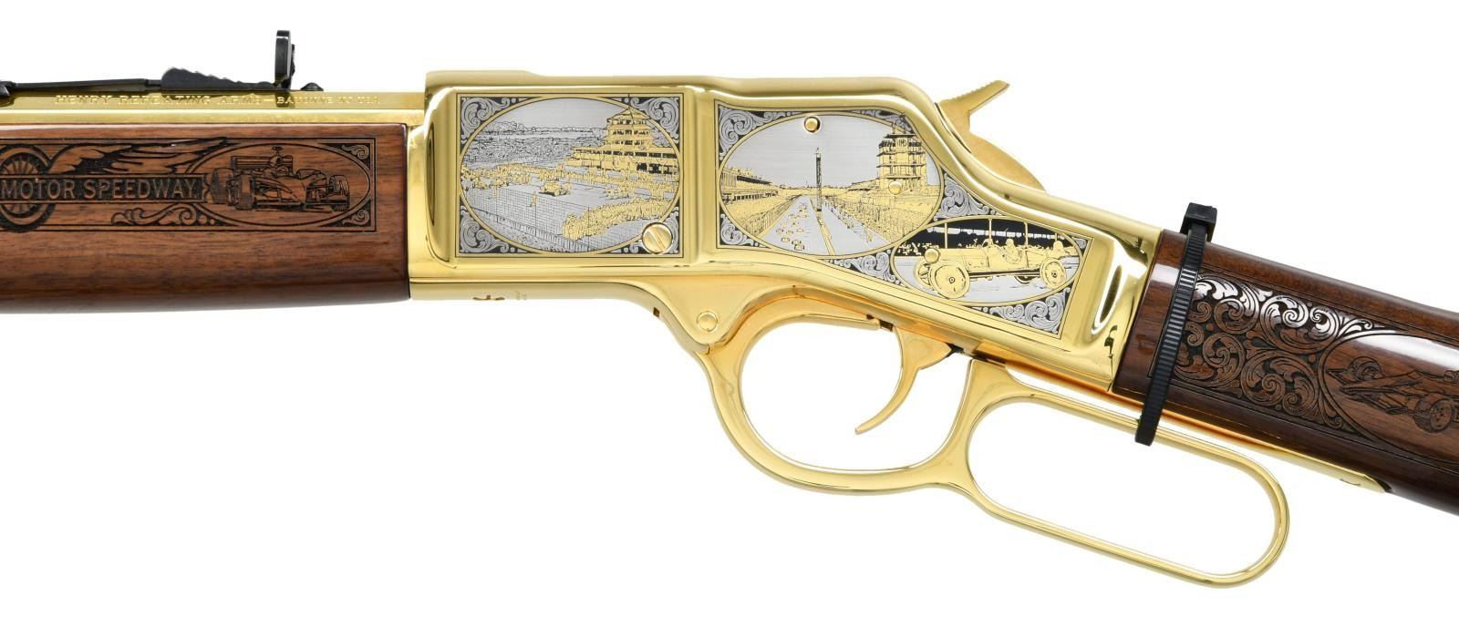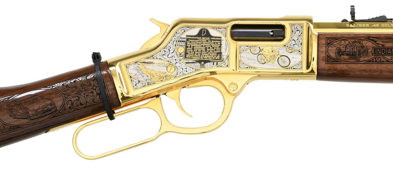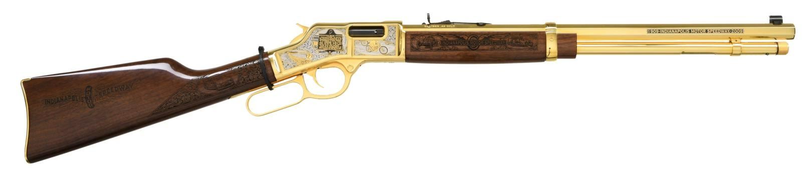 LEVER ACTION RIFLE. Cal. 45 Colt. S# BB0016748C. Bbl. 20" oct. Gold bead front sight. Sporting rear sight. Gold finished commemorative to the Indianapolis Motor Speedway. Numbered 77 out of 100 made by A&A Engraving of Rapid City, SD. Receiver has floral engraving w/ several scenes of racing including vintage motorcycling & automobile racing. Right side of receiver also has a plaque telling the history of the speedway. Both sides of bbl. have "1909 INDIANAPOLIS MOTOR SPEEDWAY 2009" markings. Top of bbl. marked "THE GREATEST RACE COURSE IN THE WORLD". Tang of buttplate has Culver Block brick engraving. Plastic band present on lever likely indicating this rifle is unfired. Walnut stock has several carvings of racing including vintage cars, NASCAR & open cockpit race cars. Butt & forend also have carvings of the Indianapolis Speedway logo. UNATTACHED ACCESSORIES: factory box matching numbered to gun, manual, gun sock w/ A&A Engraving sticker, a certificate of authenticity, a framed photo of the Indy 500 hall of fame w/ every winner from 1911 until 2008, a matching numbered wooden display case, factory display stand & paperwork from A&A Engraving. CONDITION: all aspects near new in box. (23-4795/MJC). MODERN. $10,000-15,000.