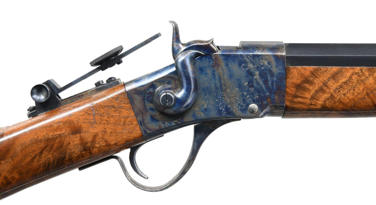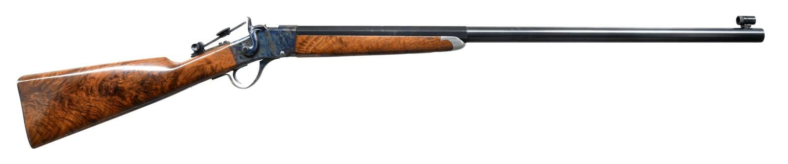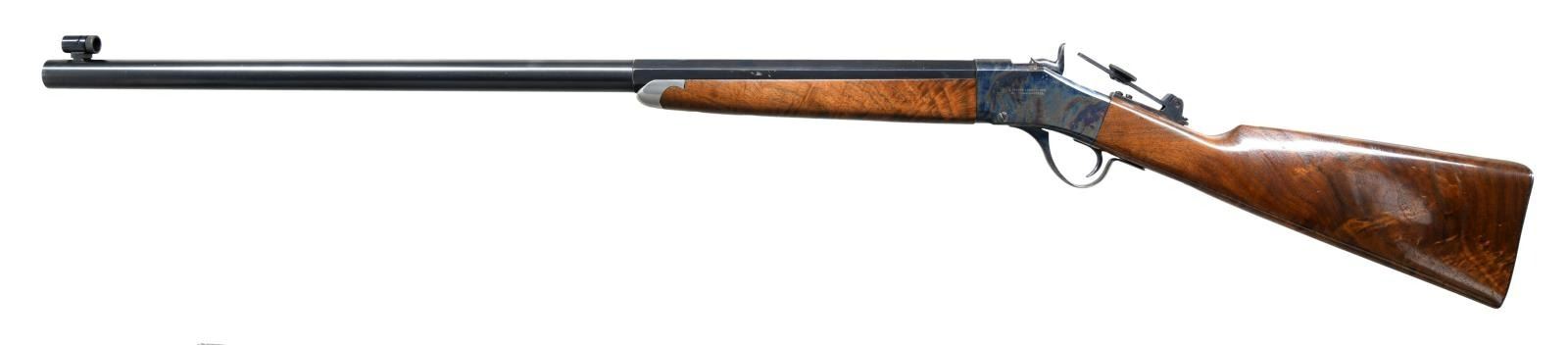 RIFLE. Cal. 40-65. S# 0-923. Bbl. 31" half-oct half-rnd. Globe front sight. Tang mounted folding aperture rear sight. Timbercreek, Montana made rifle. Bbl. marked "OLD RELIABLE". Case colored action. Blued bbl. Nicely figured straight walnut buttstock & forend w/ silver nosecap. CONDITION: walnut stock set shows some light handling wear. Action retains 90% original case colors w/ some light fading & spotty oxidation. Bbl. retains 93% original blue w/ some light edge wear. Very good bright bore. (23-359/MJC). MODERN. $1500-2000.