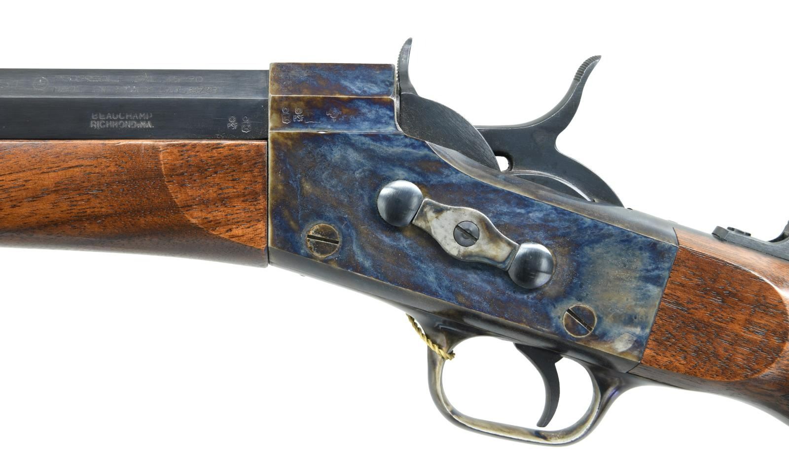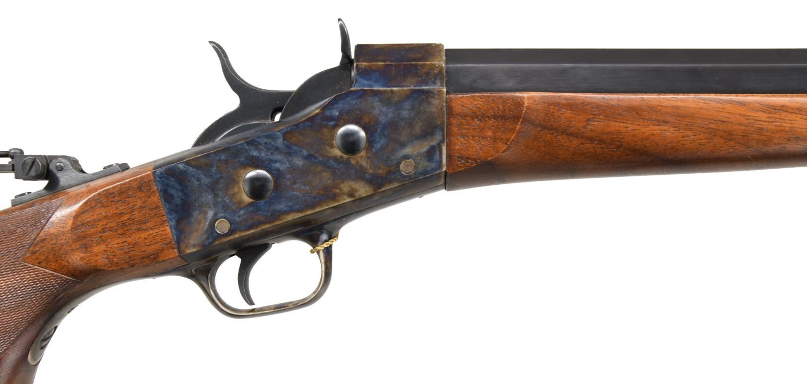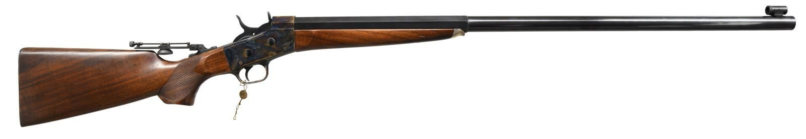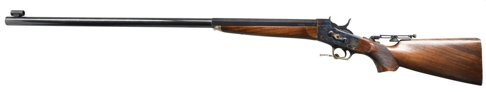 Cal. 45-70. S# R09151. Bbl. 34" half-oct half-rnd. Appears to be a Pedersoli "Super Match" model Rolling Block. Tunnel front sight. Tang mounted aperture rear sight. Case colored action & buttplate. Blued bbl. Checkered walnut pistol grip stock & walnut forend w/ German silver cap. CONDITION: all aspects very good plus or better w/ some light handling wear. (23-1946/MJC). MODERN. $600-1000.