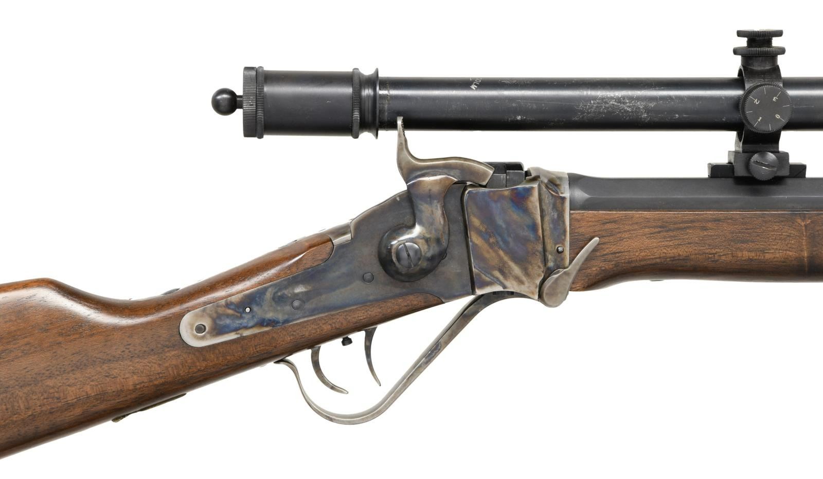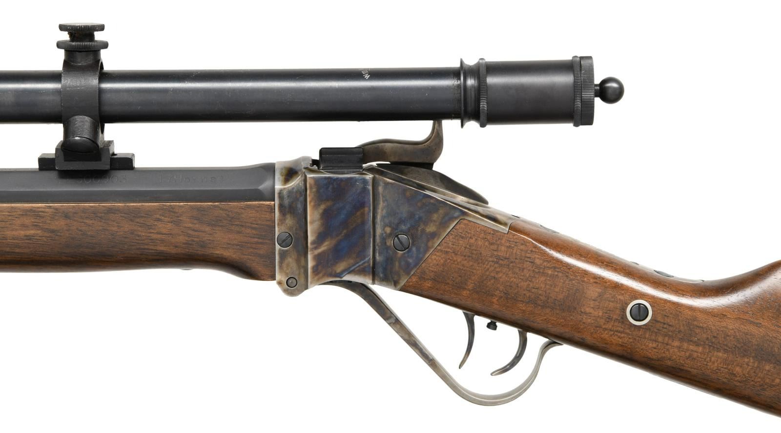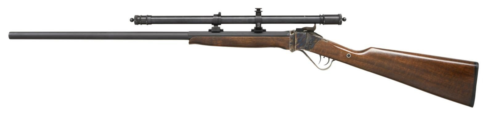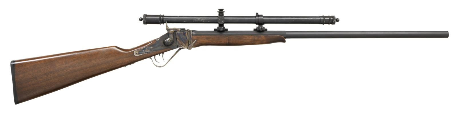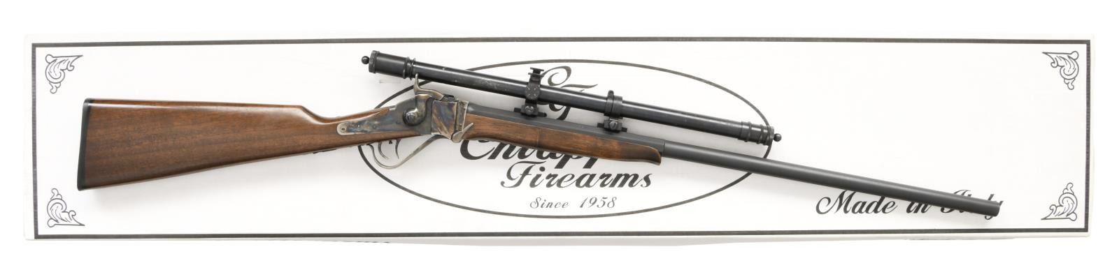 WITH MATCHING FACTORY BOX. Cal. 17 Hornet. S# LS00903. Bbl 24 1/4". Little Sharps Hunter manufactured by Chiappa Firearms in Italy and imported by Chiappa Firearms LTD. of Dayton, OH. The left side of the barrel is stamped with Chiappa's manufacturer information, followed by the serial number and caliber designation, with Chiappa's importer information stamped on the right. Frame, lever, hammer, and double set triggers exhibit a case color hardened finish, with matte blued barrel, and blued breechblock. Plain wood straight grip buttstock with plain wood schnabel tip forend. Barrel is fitted with a Wm Malcolm 3x scope. UNATTACHED ACCESSORIES: matching factory box. CONDITION: very good overall, with metal components retaining bountiful amounts of their original factory finishes overall. Exterior of scope exhibits scattered marks from handling and storage that show through to silvering. Mirror bore with strong rifling throughout. Wood furniture is very good overall. Box shows some mild exterior wear, but otherwise remains sturdy and serviceable. PROVENANCE: The Collection of Gun Sport Ltd. owned by Jon R. Thomas. (23-3681/MLW). MODERN. $1,000-1,500.