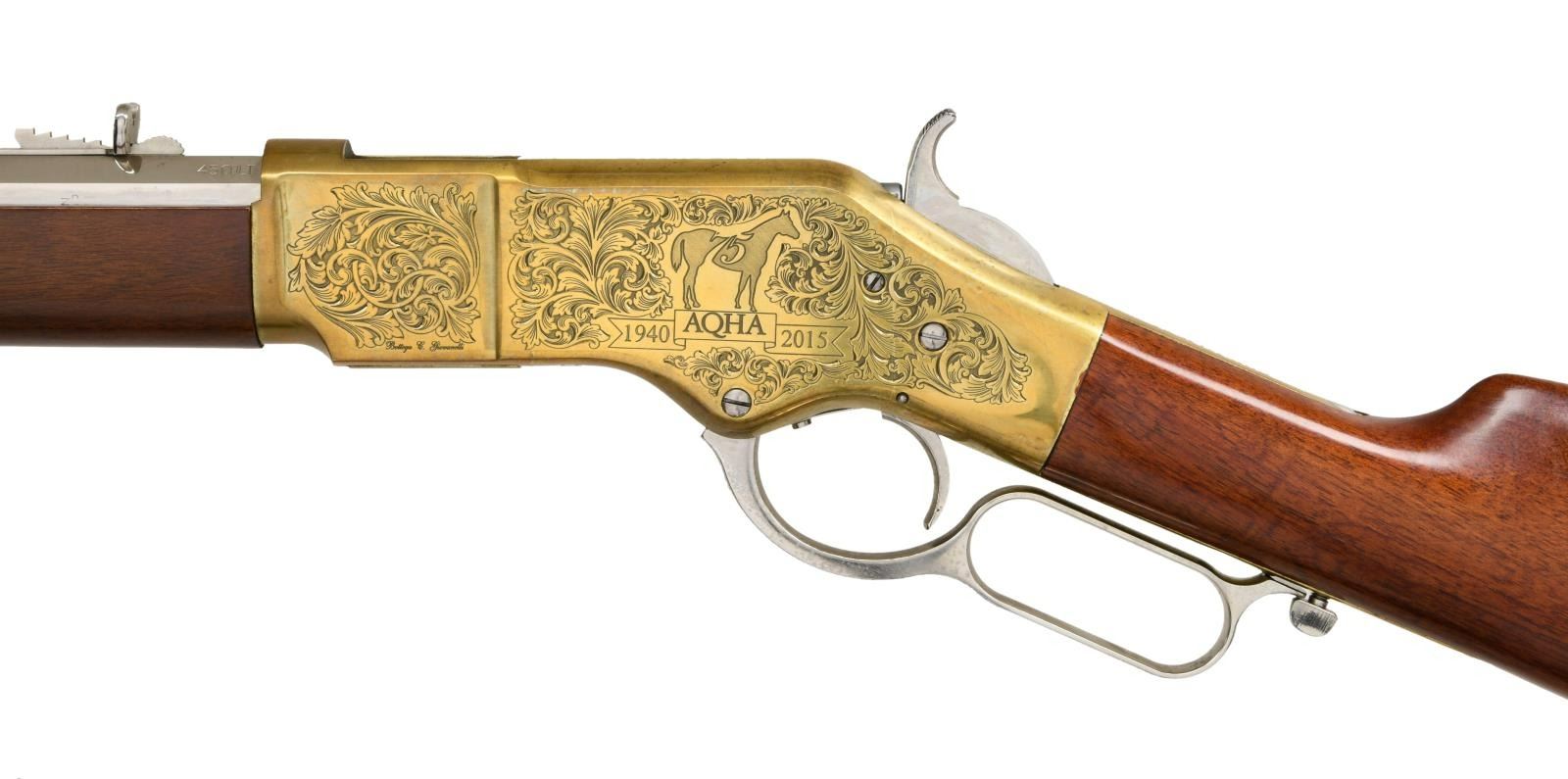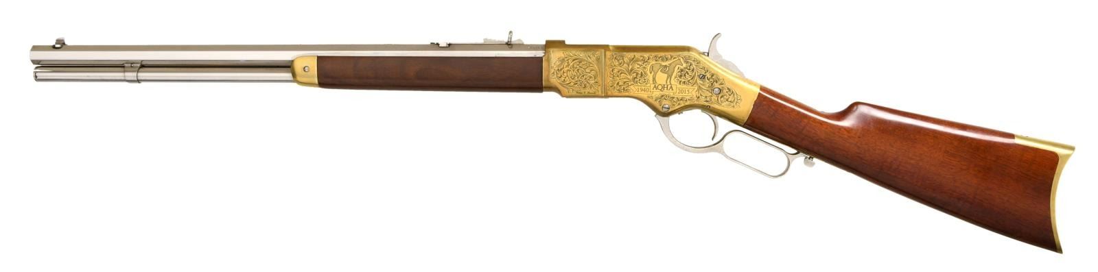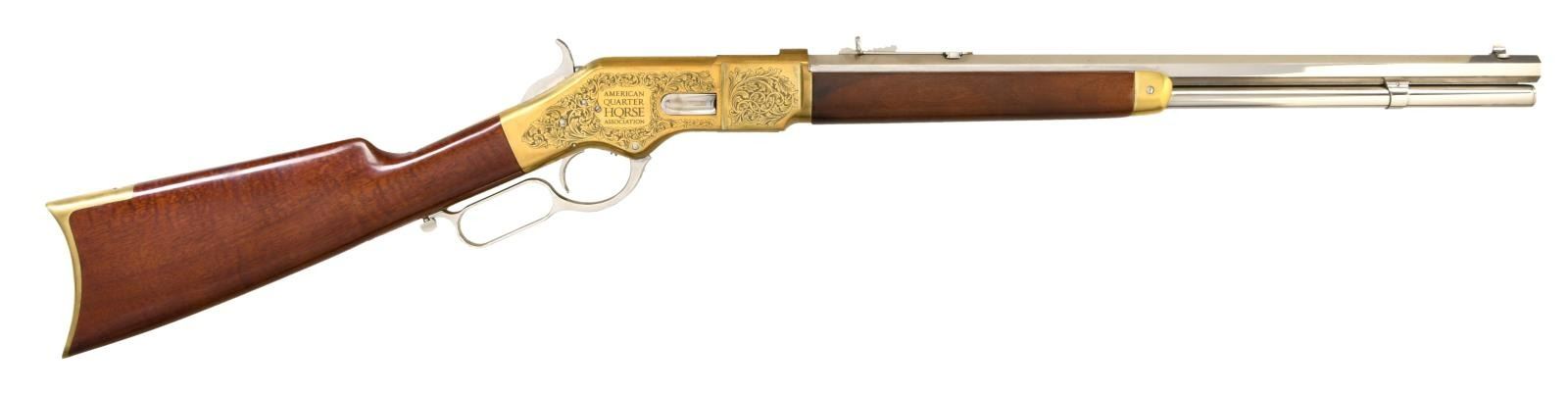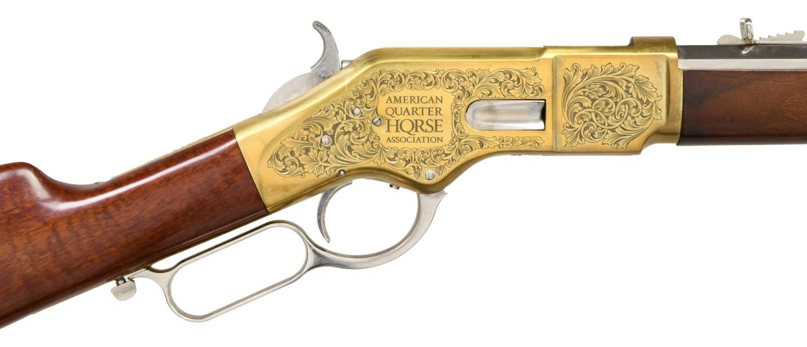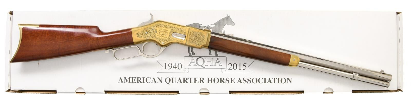 LEVER ACTION SHORT RIFLE WITH MATCHING FACTORY BOX. Cal. 45 Colt. S# W63354. Bbl 20". Model 1866 short rifle manufactured by Uberti in Italy and imported by Cimarron Firearms of Fredericksburg, TX, commemorating the 75th anniversary of the American Quarter Horse Association. The octagonal bbl is stamped with Cimarron's importer information over the top flat, with the caliber designation stamped on the left at the breech. The receiver features beautiful acanthus leaf scroll engraving by Bottega C. Giovanelli, with "75" within the silhouette of a horse above a banner reading "1940 AQHA 2015" on the left side, and with "AMERICAN/ QUARTER/ HQRSE/ ASSOCIATION" engraved on the right. Brass frame exhibits a bright polished finish, with the bbl, sights, mag tube, lever, and hammer exhibiting a nickel plated finish. Plain wood straight grip buttstock and forend. Dovetailed blade front sight with dovetailed semi-buckhorn square notch rear sight. UNATTACHED ACCESSORIES: matching factory box. CONDITION: extremely fine, with metal components retaining bountiful amounts of their original factory finishes. Underside of receiver and sides of lever exhibit some scattered spots of discoloration, but are otherwise fine. Brilliant mirror bore, exhibiting well defined rifling throughout. Wood furniture is excellent. Box shows some mild exterior wear, with a couple tears, but otherwise remains sturdy and serviceable. (23-4901/MLW). MODERN. $1,000-1,500.