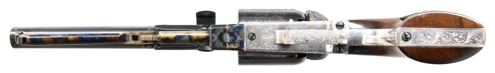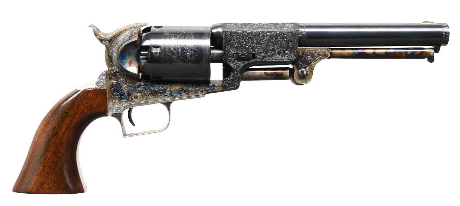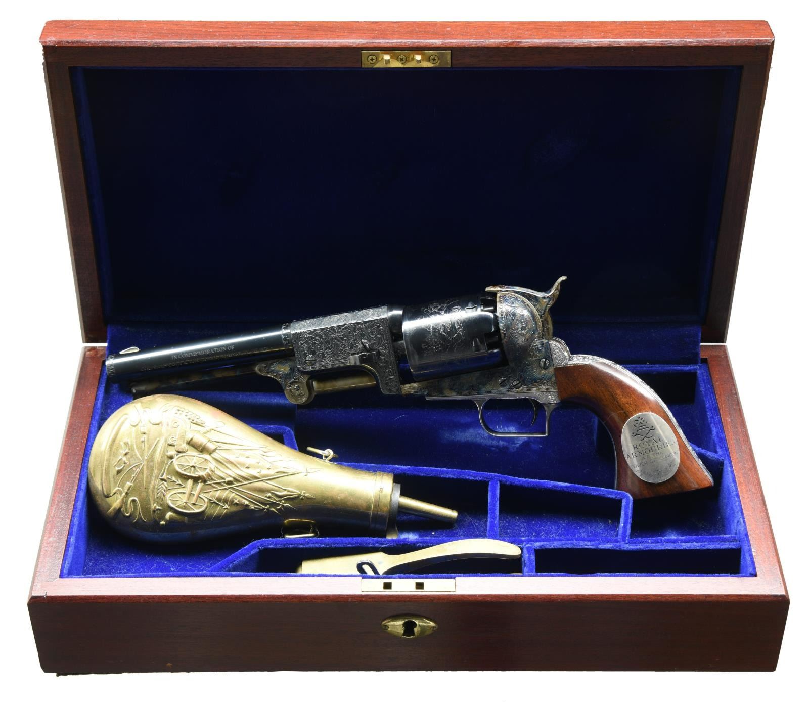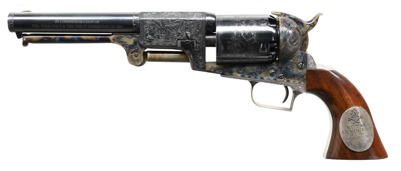 COMMEMORATIVE REVOLVER. Cal. 44. S# 9. Bbl. 7 1/2" half rnd. half oct. Brass blade front sight. Scarce commemorative revolver w/ only 200 mfg. This revolver was a joint project by the Royal Armouries H.M. Tower of London & the U.S. Historical society to commemorate the Dragoon that was displayed at the Great Exhibition of 1851 in London. These revolvers were originally sold by subscription for the high price of $2250 in 1989. Case colored ejector rod, hammer & frame. Blued bbl. & cyl. Cyl. has engraved battle scene. Silver plated trigger guard & grip frame. Floral engraving throughout. Walnut grips w/ silver plaque marked "ROYAL ARMOURIES AT THE TOWER OF LONDON". UNATTACHED ACCESSORIES: presentation case w/ key, powder flask, bullet mould, nipple tool & cap tin. CONDITION: all aspects near excellent. (01-23823/MJC). ANTIQUE. $1000-2000.