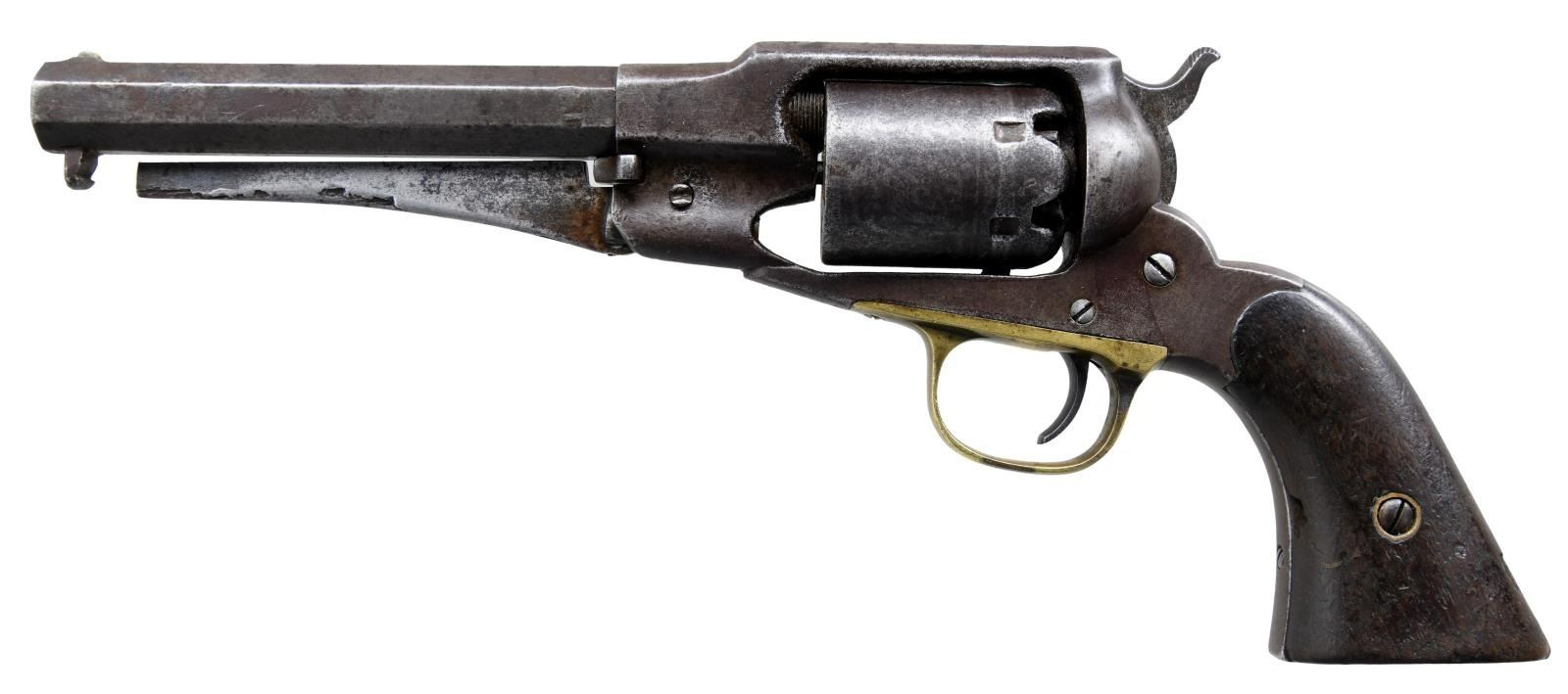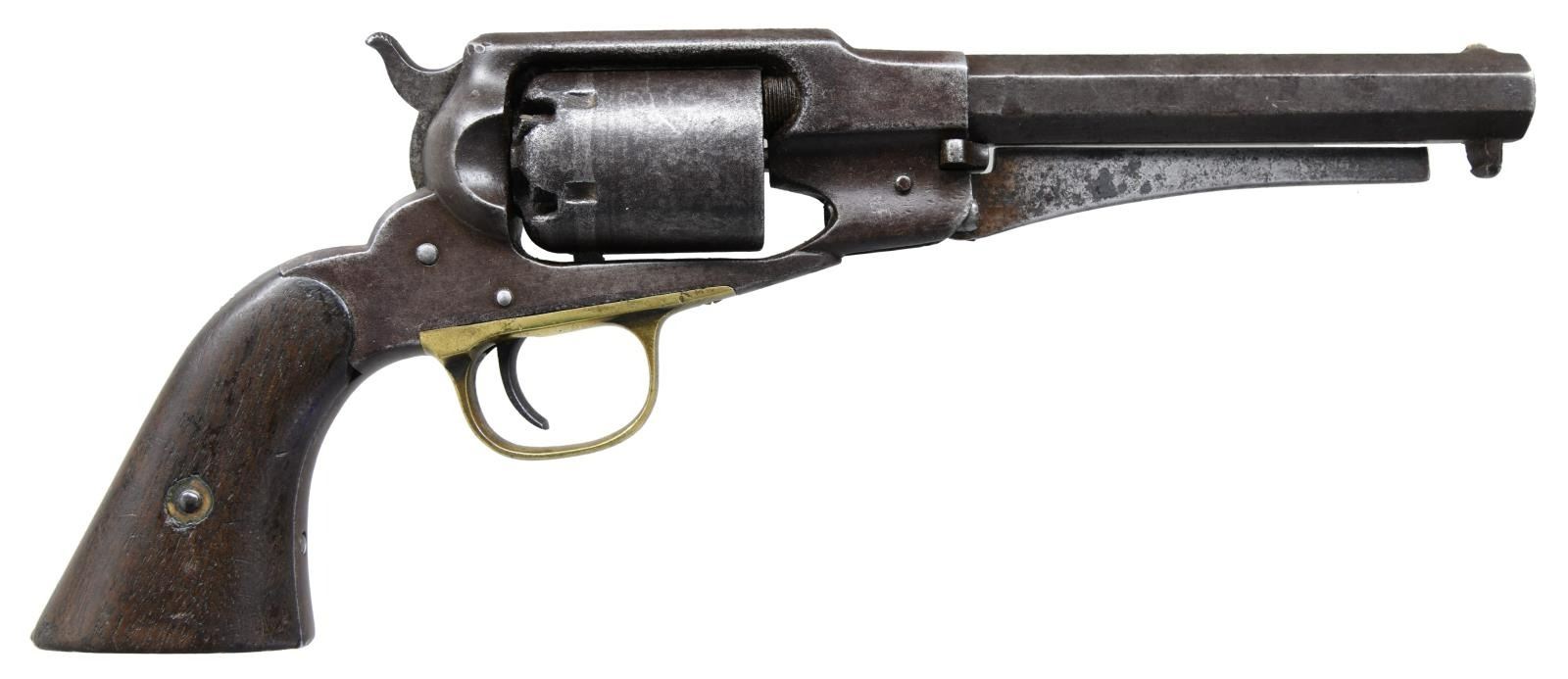 Cal. 32. NSN. Bbl. 6 1/4" oct. Brass blade front sight. Fixed rear sight. Unmarked vintage clone of a Remington New Model cap & ball revolver in a smaller cal. Brass trigger guard. End of ejector rod appears to be chipped off & ejector rod is loose. Hammer not holding at full cock & will require attention. Walnut grips. CONDITION: grips show a couple notable chips, scattered dings & handling wear. Brass trigger guard is a dull yellow patina w/ scattered oxidation. Balance of metal is a dull gray patina w/ scattered pitting, dings & oxidation. Pitted & oxidized bore. (01-23644/MJC). ANTIQUE. $300-500.