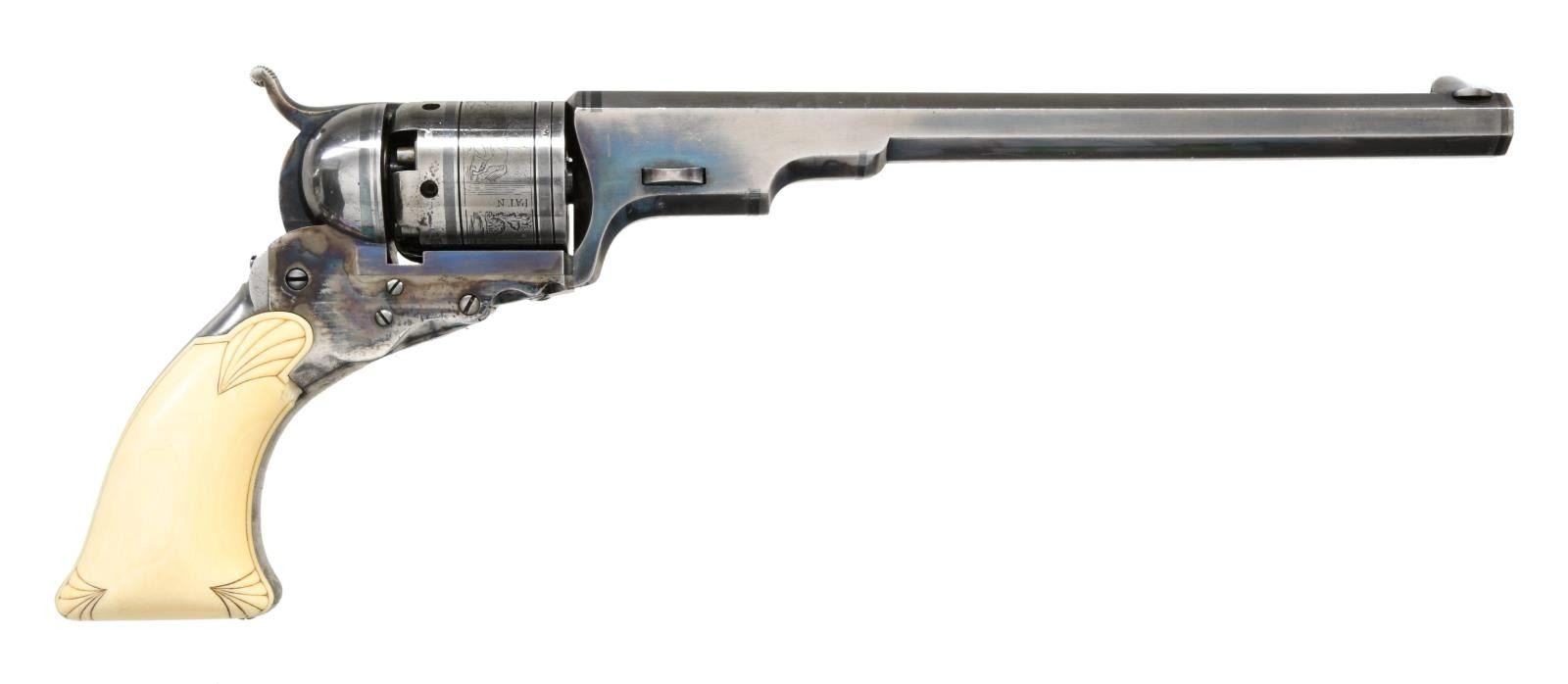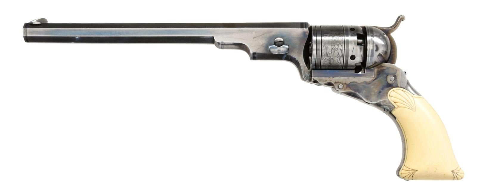 ACCESSORIES. Cal. 36. NSN. Bbl 9". Reproduction Colt Paterson revolver manufactured in Italy and finished in the United States. The top of the barrel is marked "Patent Arms M'g. Co. Paterson, N.J.-Colt's Pt." over the top flat, with "7" stamped on the underside. Cylinder is engraved with a stagecoach scene and is stamped with an Italian proof. Frame, hammer, and trigger exhibit a case color hardened finish, with the cylinder and barrel exhibiting a polished gray patina. Rear of frame exhibits 2 silver bands, with 2 bands on the cylinder, an additional silver band present around the muzzle, as well as 2 silver inlays present on the underside of the barrel at the rear. Frame is mounted with a 1 piece, lightly embellished, ivory grip. Dovetailed blade front sight with hammer notched rear sight. UNATTACHED ACCESSORIES: leather holster with spare cylinder. CONDITION: frame retains good amounts of its original factory case color hardening, exhibiting areas of wear and thinning that show through to a gray patina, with areas of oxidation and discoloration on the grip straps. Barrel and cylinder retain a pleasant gray patina. Mirror bore, exhibiting sharp and well defined rifling throughout. Ivory grips exhibit some yellowing and a couple losses at the edges. Holster shows age related wear, but is otherwise sturdy and serviceable. Spare cylinder is very good overall. A very attractive reproduction Colt Paterson revolver. (01-21934/MLW). ANTIQUE. $2,000-3,000.