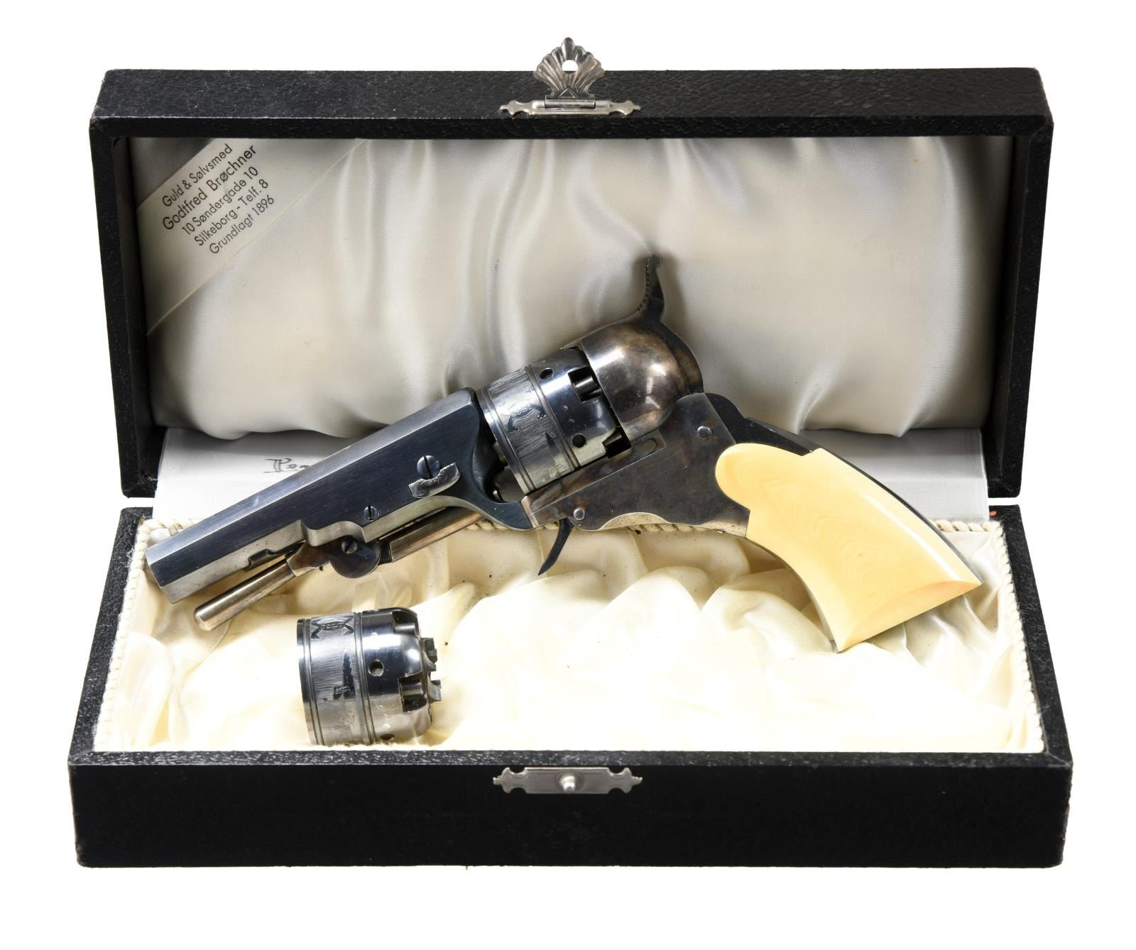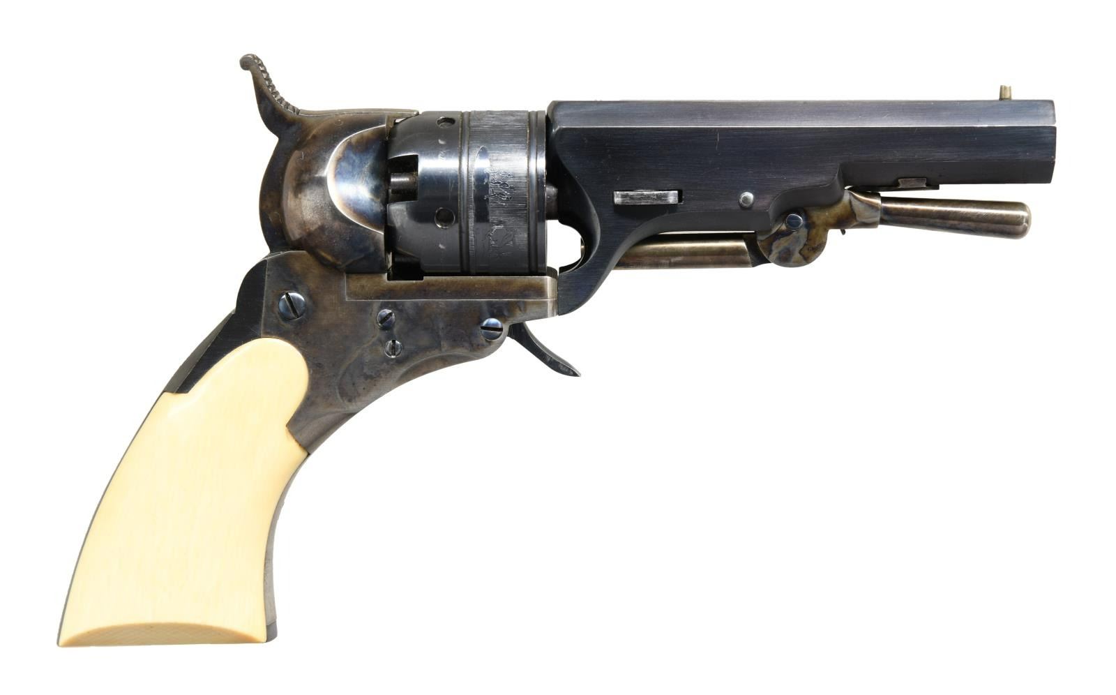 PERCUSSION SINGLE ACTION REVOLVER WITH ACCESSORIES. Cal. 31. NSN. Bbl 3 1/2". Reproduction Baby Paterson Ehlers model revolver produced by an unknown manufacturer. The barrel is marked "Patent Arms M'g Co Paterson NJ Colt's Pt." over the top flat. Cylinder is engraved with a Centaur scene. Frame, hammer, and loading lever exhibit a case color hardened finish, with the rear grip strap, cylinder, and barrel being blued. Frame is mounted with a 1 piece smooth ivory grip. Brass front sight with hammer notched rear sight. UNATTACHED ACCESSORIES: non-original black leatherette case containing a spare cylinder. CONDITION: frame retains the majority of its vibrant case coloring overall, with some areas of mild wear, as well as some areas of fading. Blued components are very good overall, exhibiting some light wear and some superficial marks from handling and storage. Very bright bore, exhibiting some spots of pitting on the lands and retaining well defined rifling throughout. Ivory grips retain a pleasing yellow patina, with some scattered marks from handling and storage. Leatherette case shows moderate exterior wear overall, with a couple spots of tearing on the interior, but otherwise remains sturdy and serviceable. Spare cylinder is very good overall. (01-21853/MLW). ANTIQUE. $2,000-3,000.