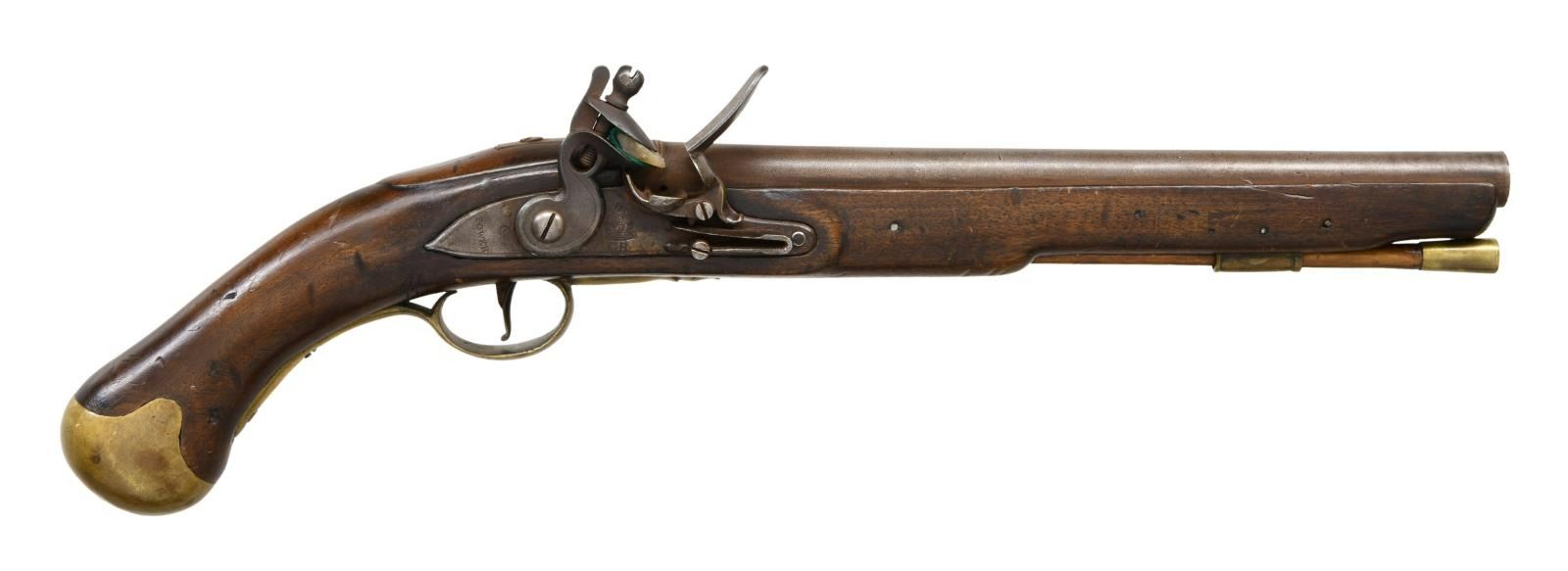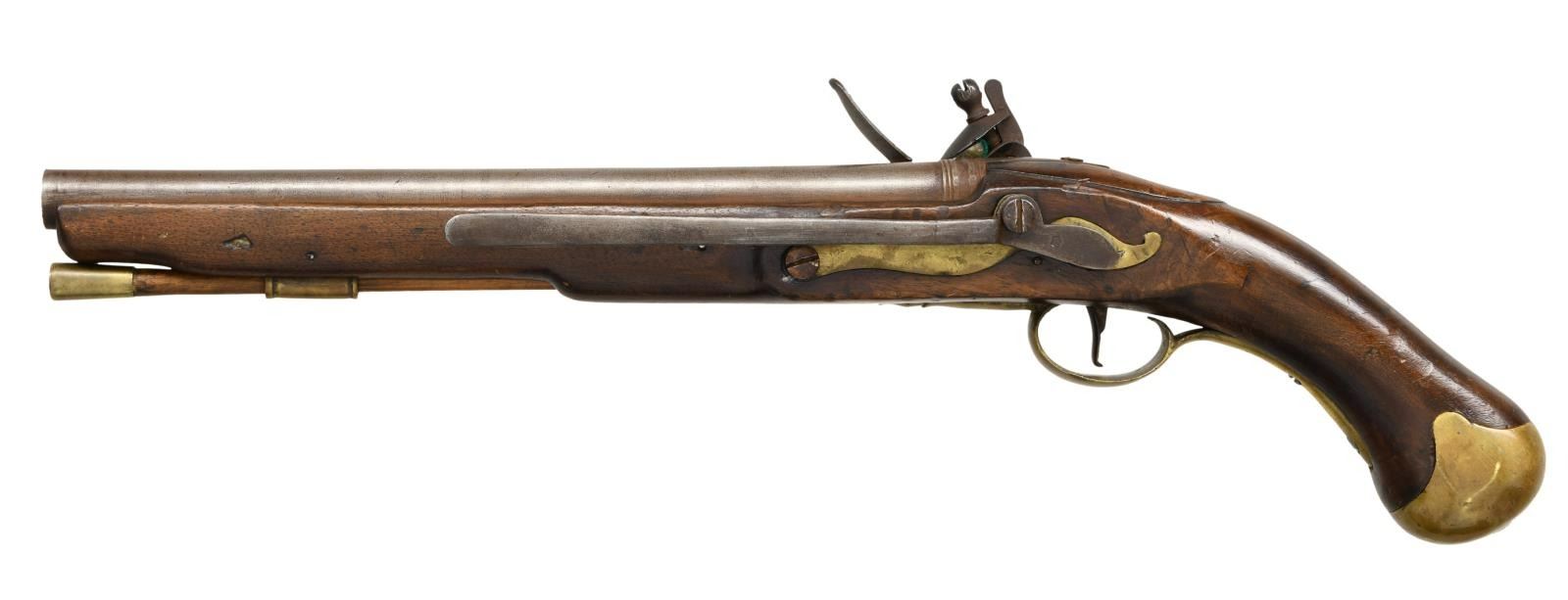 Cal. 62. NSN. Bbl. 12". A fine quality reproduction of an 18th century British sea service belt pistol. Barrel is unmarked with decorative rings near the breech. Iron lock has a crowned "GR" under the cock with a small crowned broad arrow under the pan. The rear of the lock reads "TOWER". Brass trigger guard, buttcap, side plate, ramrod thimble, and ramrod cap. Oddly, the long iron belt hook attached to the side plate appears to be original. CONDITION: all iron parts have a similar artificial gray patina. Brass parts have an aged mustard patina. Wood shows several minor dents & dings. Action needs adjustment. Good but dirty bore. (01-24083/BF). $200-400.