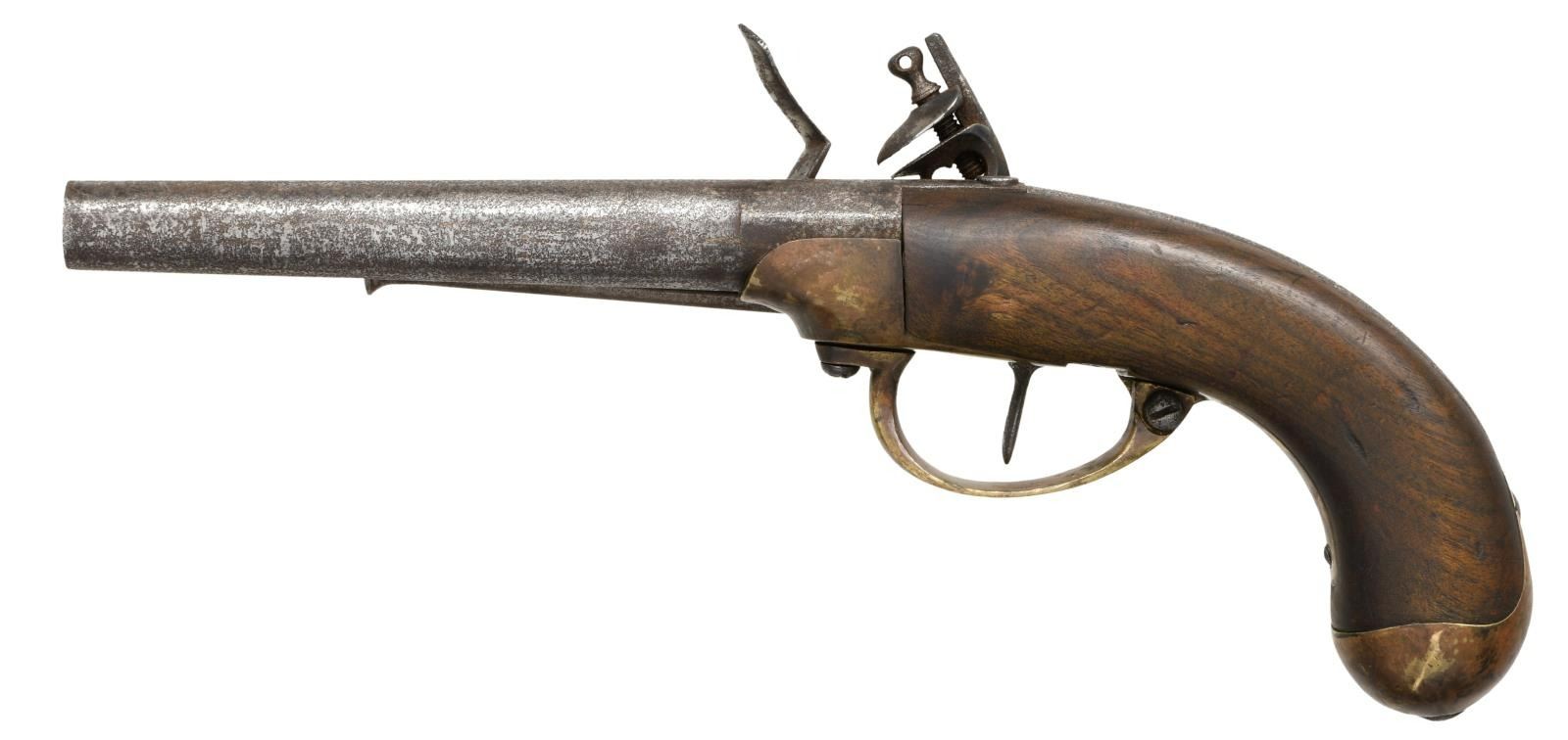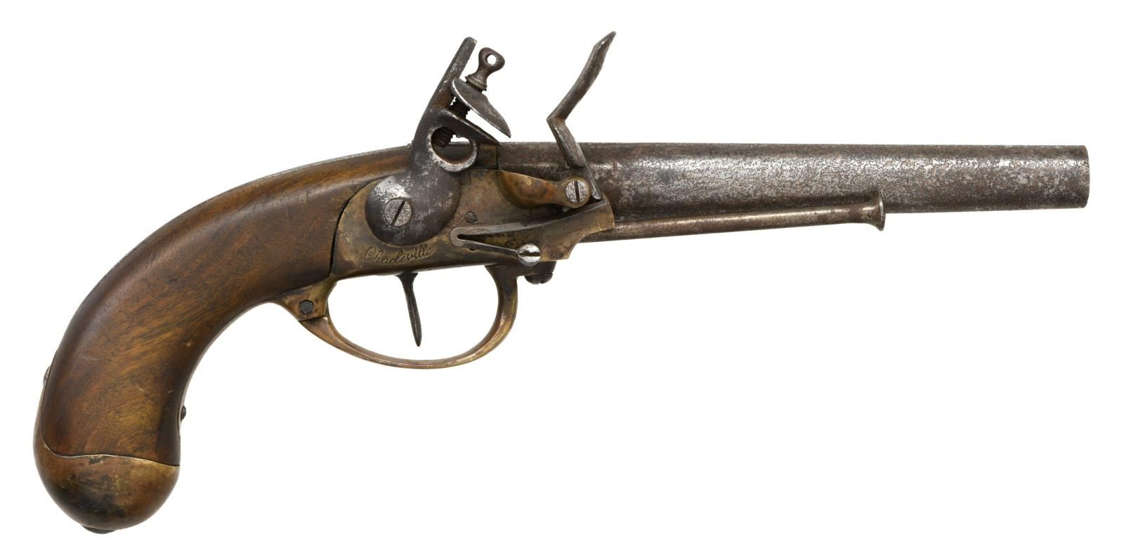 PISTOL. Cal. 69. NSN. Bbl. 7 1/2". A good quality reproduction Charleville pistol of a type that originally saw service during the American Revolution. Plain barrel lightly faceted on the sides. Brass integral lock & pan with an iron cock, frizzen, and feather spring. Brass trigger guard & buttcap with iron backstrap. Iron ramrod. CONDITION: iron parts have a lightly pitted artificial patina. Brass parts have a darkened patina that is also artificial. Fair bore could use a cleaning. (01-24078/BF). $200-400.