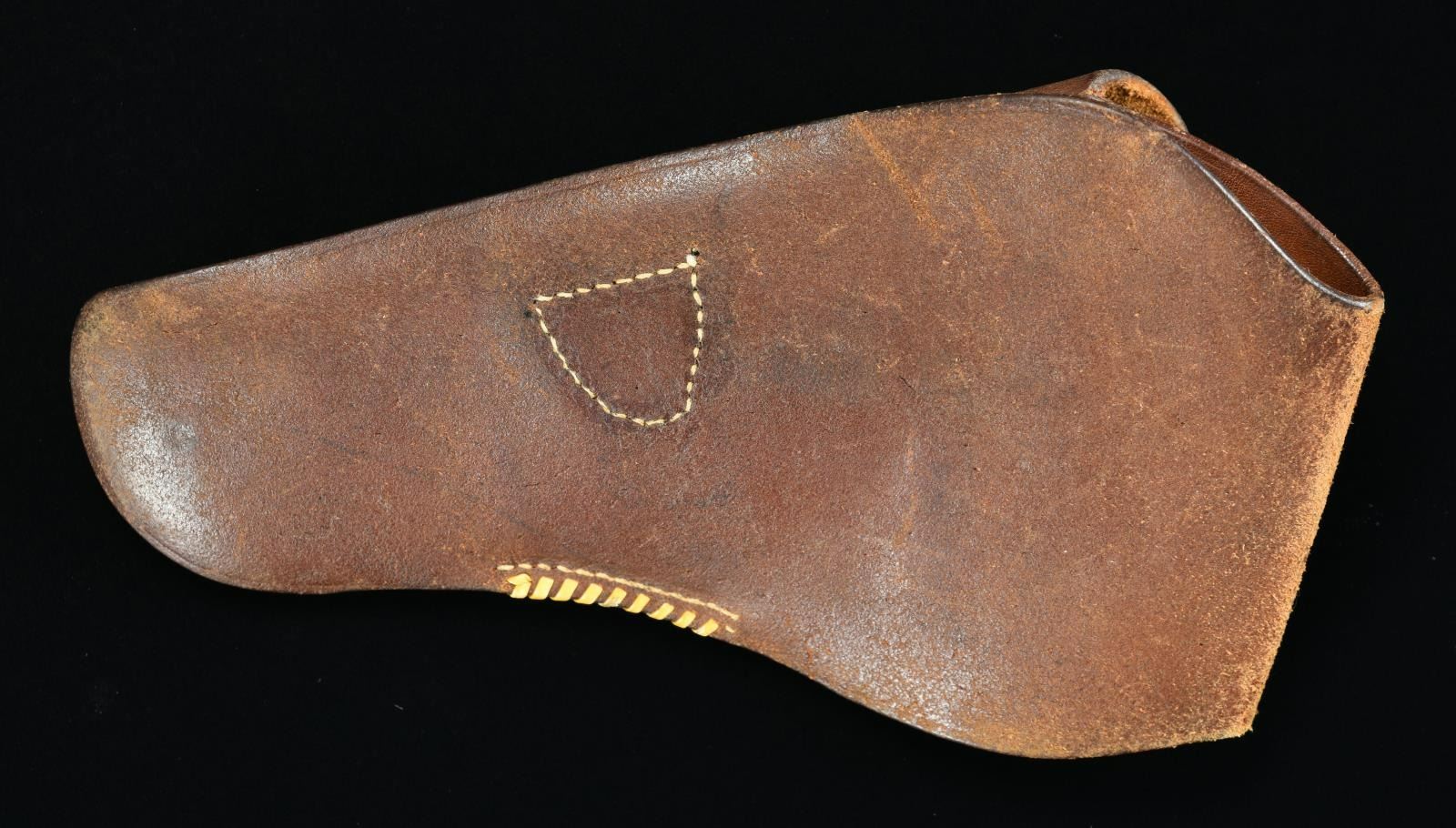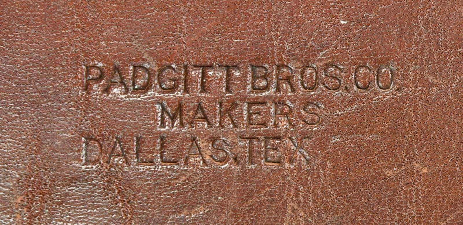 This medium brown Single Action Army 4 3/4" holster was made by the Padgitt Bros Co in Dallas, TX in the late 1890s or early 1900s. It is rawhide laced and in excellent condition. The Padgitt Brothers secured a contract with Buffalo Bill Cody's Wil West Shot to supply all saddles, belts, holsters and leather gear after Tom Padgitt sent a brights red saddle blanket to the Chief of Buffalo Bill Indians. Overnight, every Indian was lobbying for Padgitt Bros and demanding one of those red saddle pads. The contract was secured immediately. This holster is a fine example of their quality work. CONDITION: holster is in fine condition showing light flaking of leather at top of loop & a few broken stitches around opening. (02-19819). $750-850.