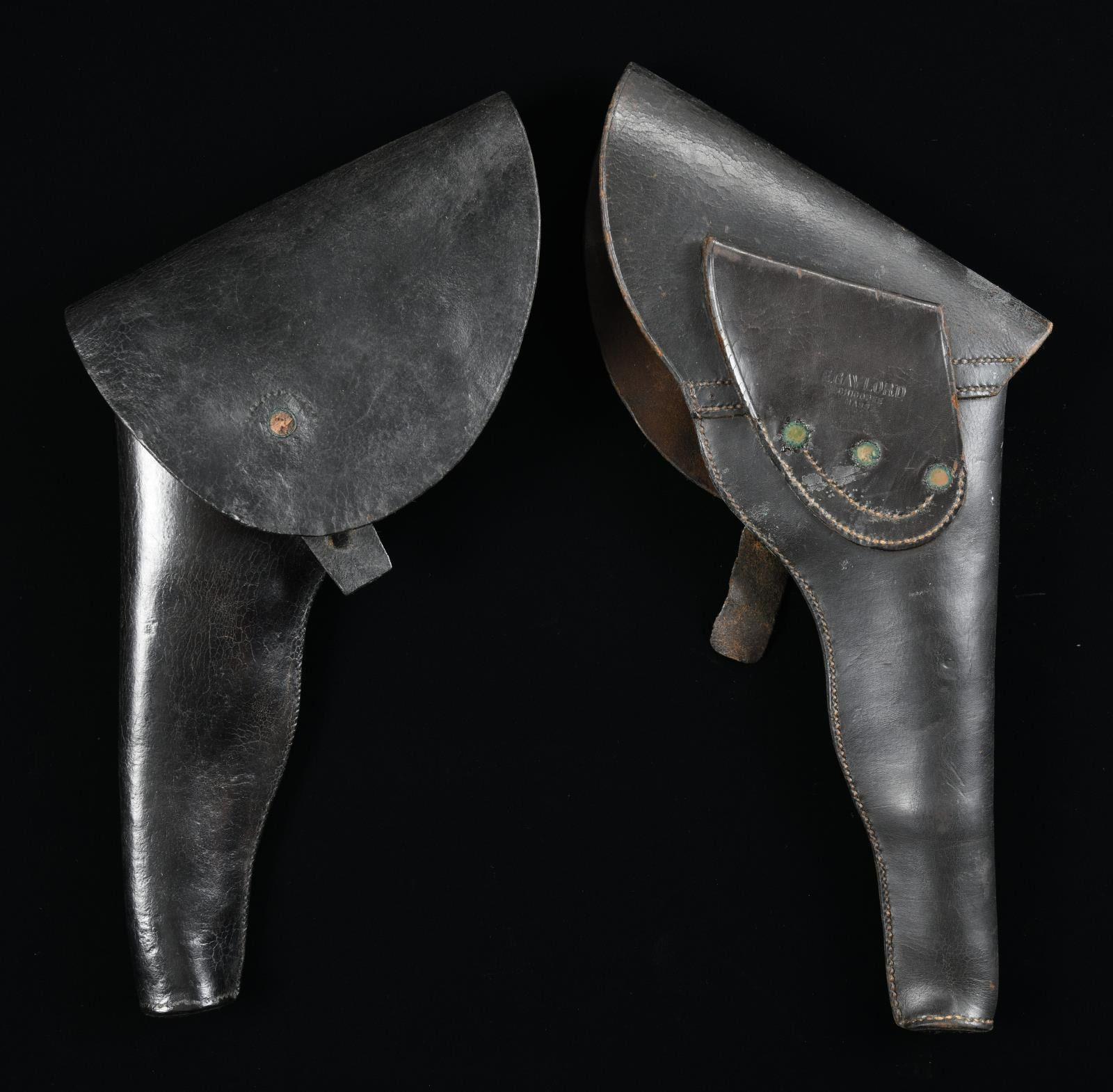 1) A black bridle leather holster for a 3rd Model Colt dragoon. Fold over flap with single copper rivet featuring arc stitching above. Leather tab is intact. Brass closure finial encircled by stitching. Belt loop attached with stitching and 3 copper rivets. Belt loop is marked "E. GAYLORD CHICOPEE MASS." Plug is intact. CONDITION: holster shows surprisingly light wear overall. Closing tab is flexed & flaked but unbroken. 2) A black bridle leather holster for a 3rd Model Colt dragoon. Fold over flap with single copper rivet featuring arc stitching above. Leather tab is intact. Brass closure finial encircled by stitching. Belt loop attached with stitching and 3 copper rivets. Belt loop is marked; however, the marking is too worn to be legible. Plug is intact. CONDITION: holster shows surprisingly light wear overall. Closing tab is lightly flexed & unbroken. PROVENANCE: From the Collection of James B. Taylor. (02-19904/BF). $1,600-2,000.