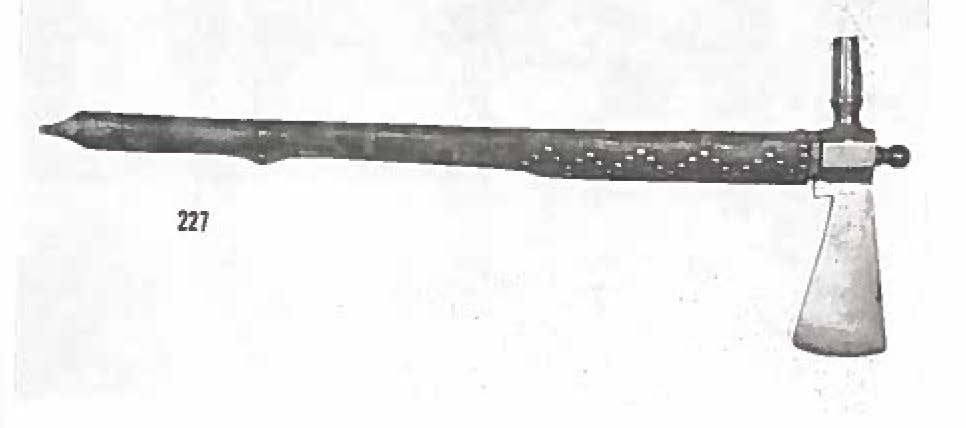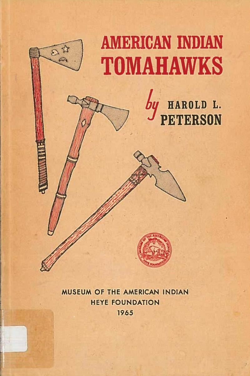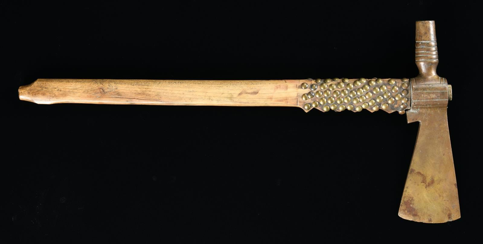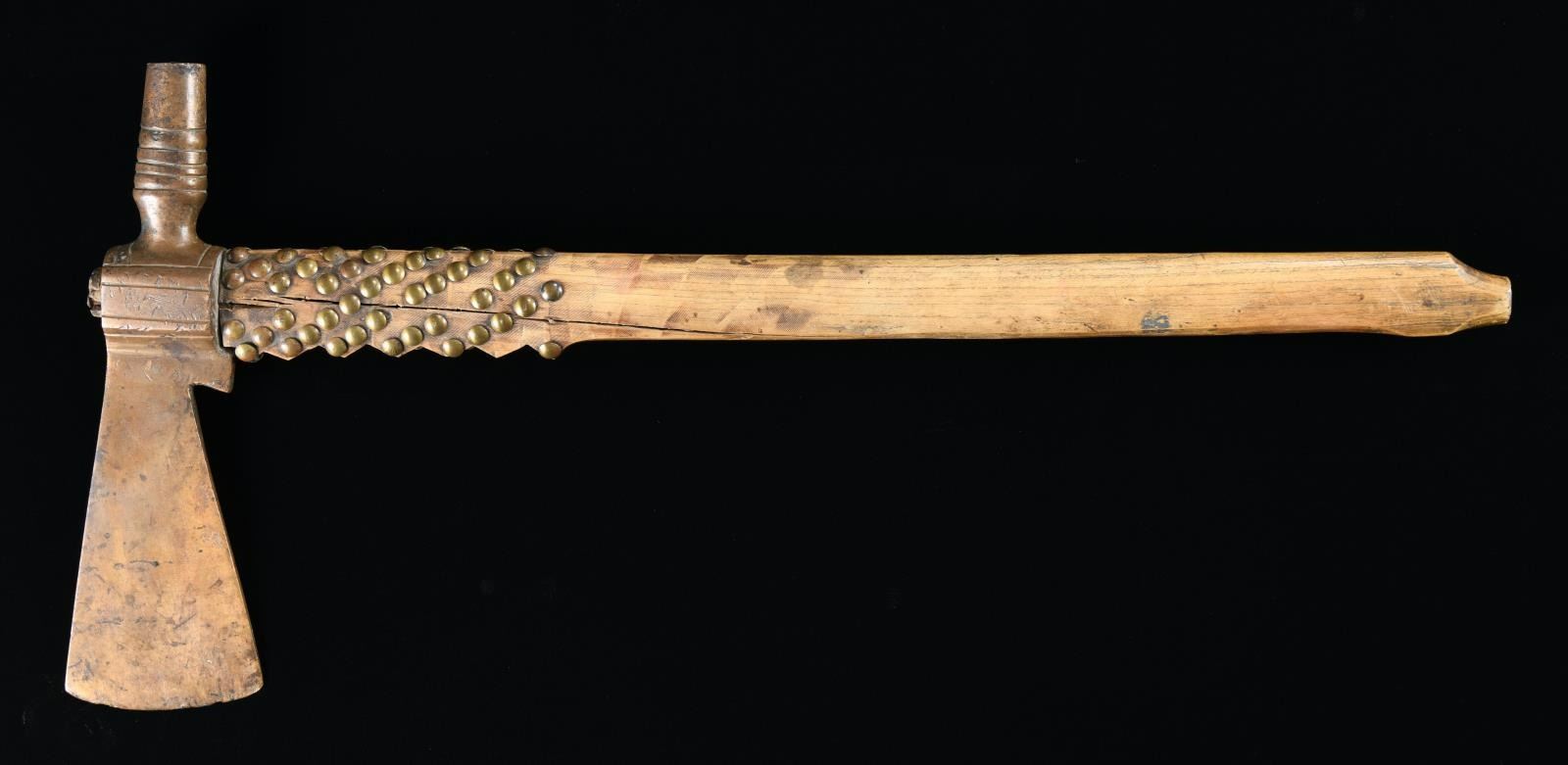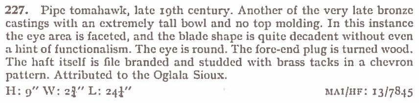Harold Peterson in his 1965 text "AMERICAN INDIAN TOMAHAWKS" shows almost identical bronze cast head with extremely tall tapered bowl with no top molding, eye area is faceted, round eye. This example has additional incised lines on bowl and eye area. The 19.5" haft is file branded and brass tack studded. UNATTACHED ACCESSORIES: copy of pages from Peterson book showing "Museum of the American Indian" example. CONDITION: very good overall. Head has light patina, scratches, dings, and dents. Haft has large age crack. PROVENANCE: From the Lifelong Collection of Glen E. Mattox. (02-18777/JS). $500-700.