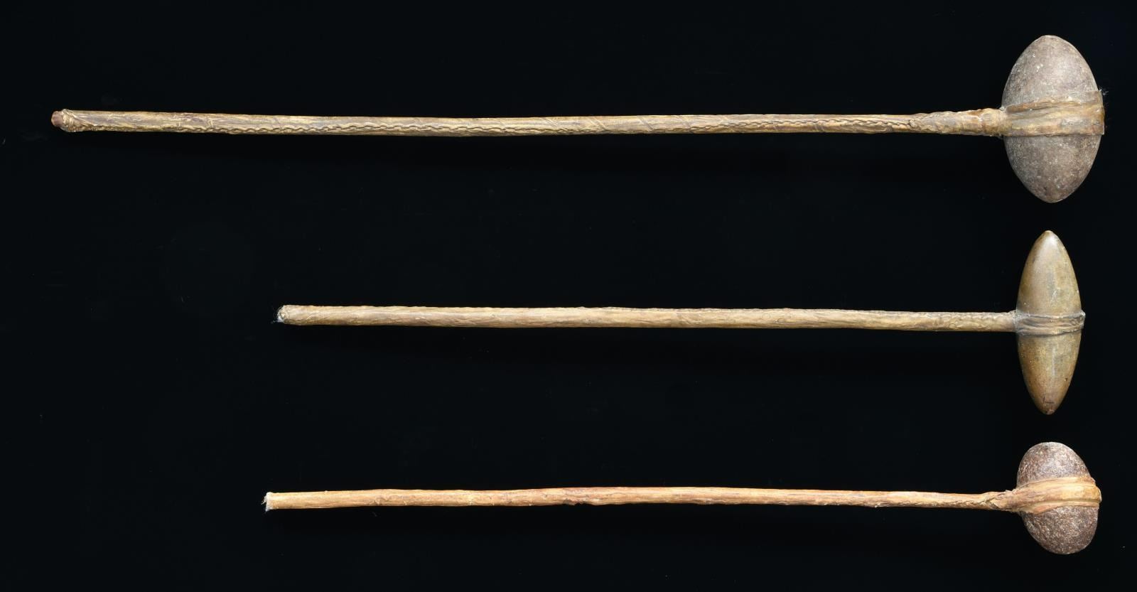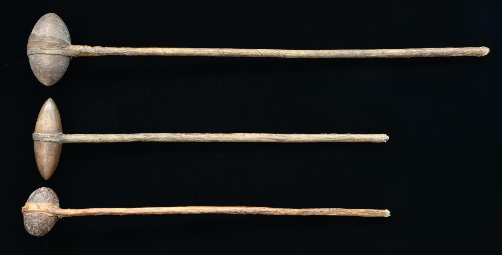 WAR CLUBS. 2 are 26" & other 34" overall, polished stone heads are different sizes, 3.5" to 6" double pointed & central grooved, secured to wooden handle with rawhide wrapping. Mr. Mattox's collection tags states clubs date 1860s-1880s. CONDITION: very good overall. PROVENANCE: From the Lifelong Collection of Glen E. Mattox. (02-18916/JS) $600-800.