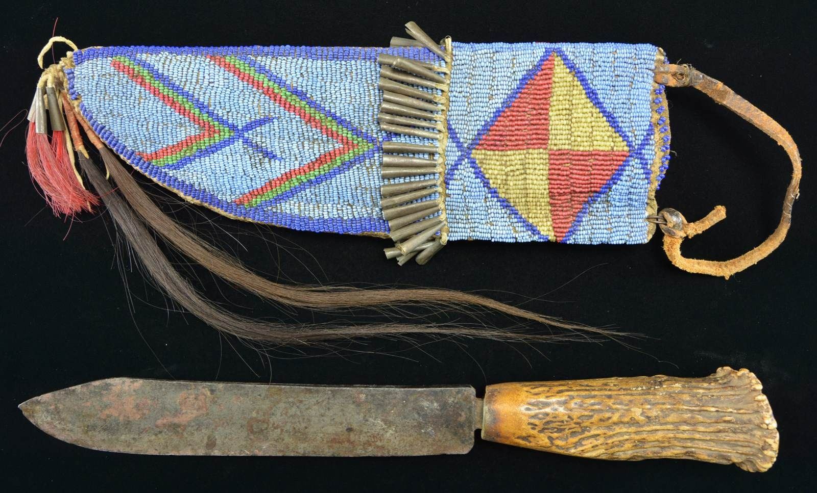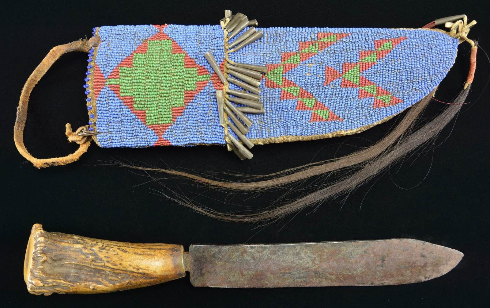 KNIFE SHEATH AND KNIFE. 10" x 3.5", Sinew sewn, full coverage both sides with white heart red, greasy yellow, dark blue & green beads on turquoise blue ground one side, the other green & white heart red on sky blue ground. Row of tinkle cone embellishments around circumference. 11" Beaded drop with tinkle cones and dyed hair. Crown stag gripped 12.5" hunting knife. Knife with 8" unmarked blade. CONDITION: very good to fine overall, complete with no losses. PROVENANCE: From the Lifelong Collection of Glen E. Mattox. (02-18335/JS). $800-1,200.