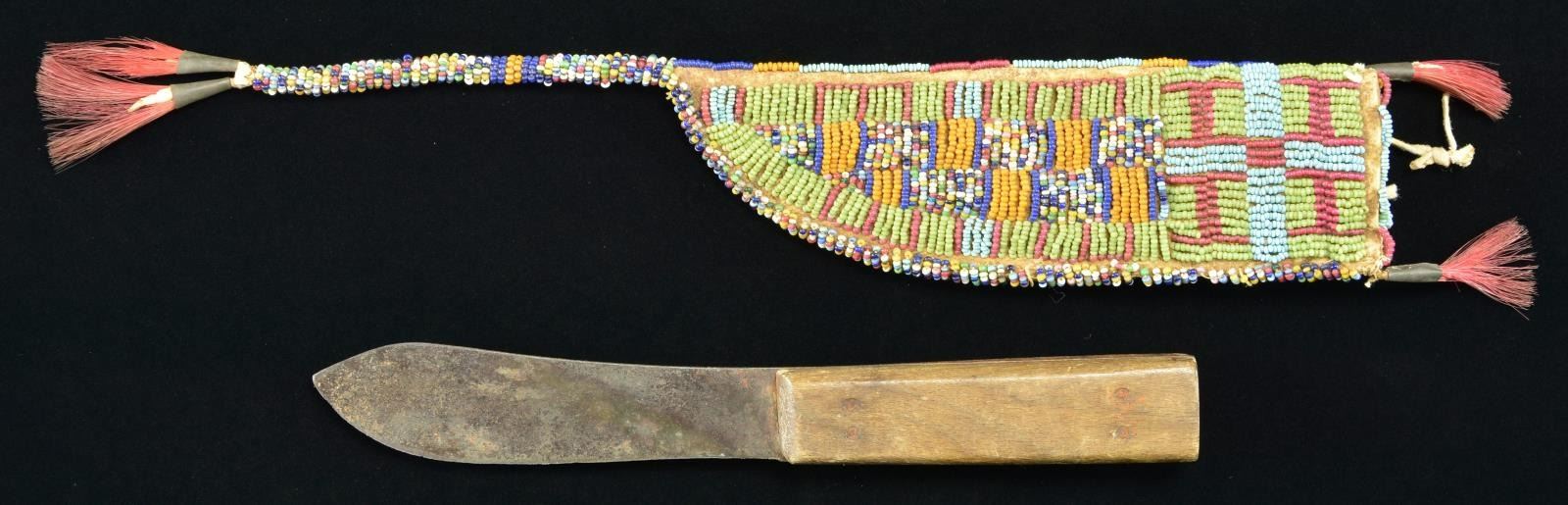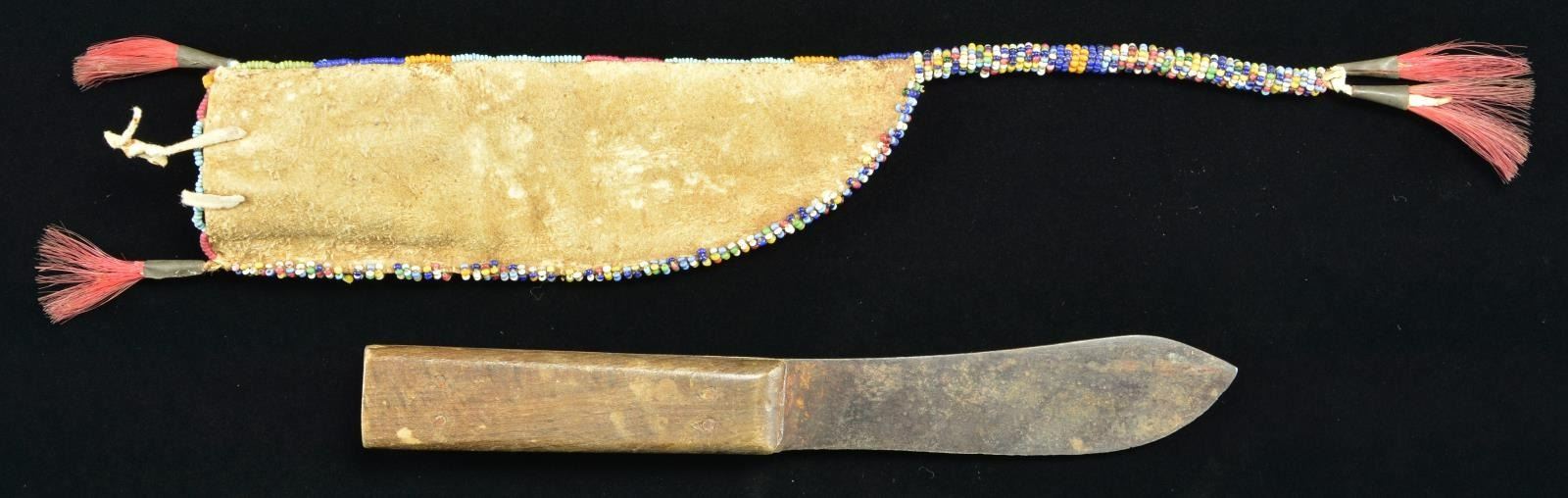 7" x 2", sinew sewn, full coverage with light blue, red, orange, navy blue and panels of multi-colors as noted on identified Sioux beadwork, 6" beaded drop and tinkle cones. 8.5" unmarked skinning knife with wood slab grips. CONDITION: very good overall. PROVENANCE: From the Lifelong Collection of Glen E. Mattox. (02-18343/JS). $600-800.