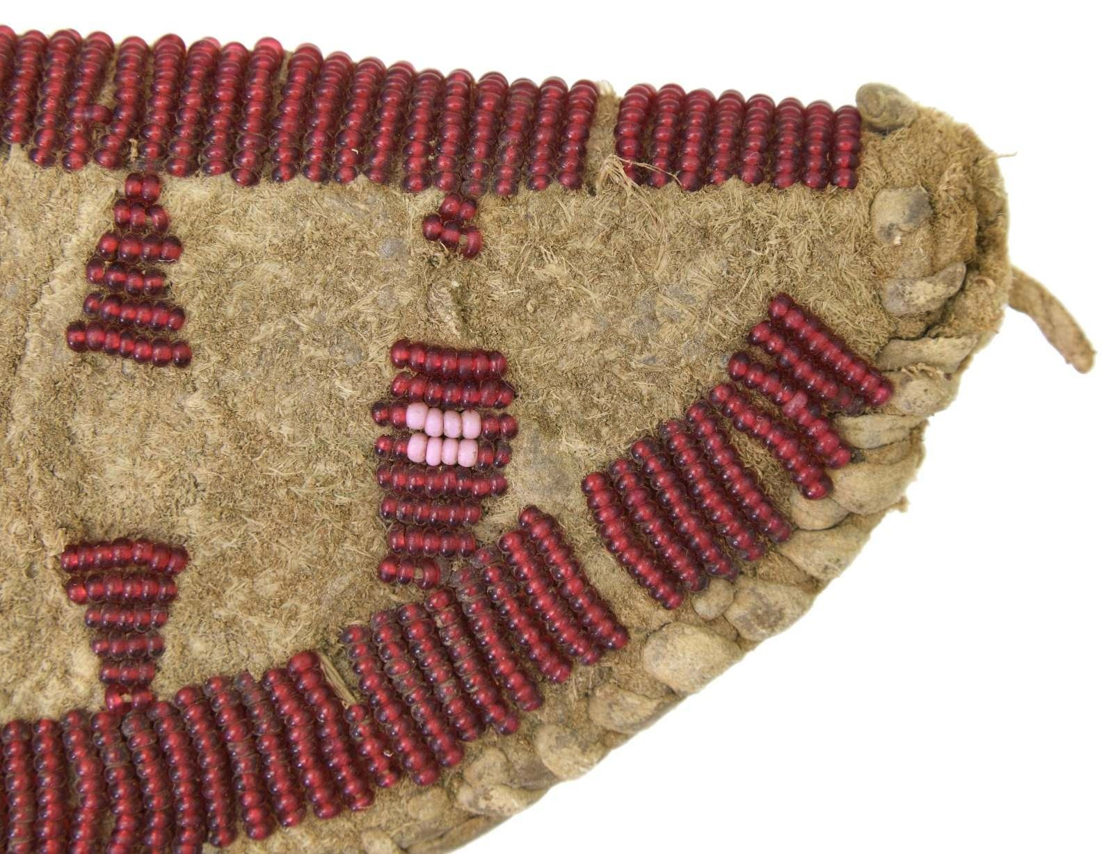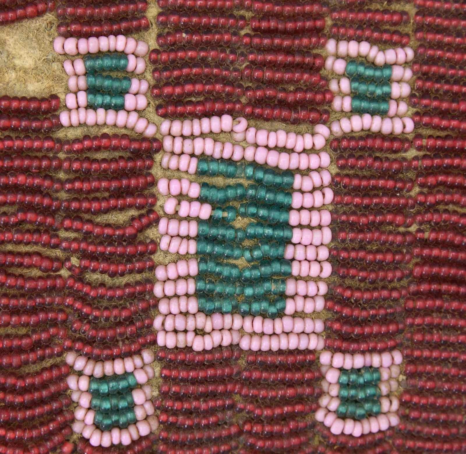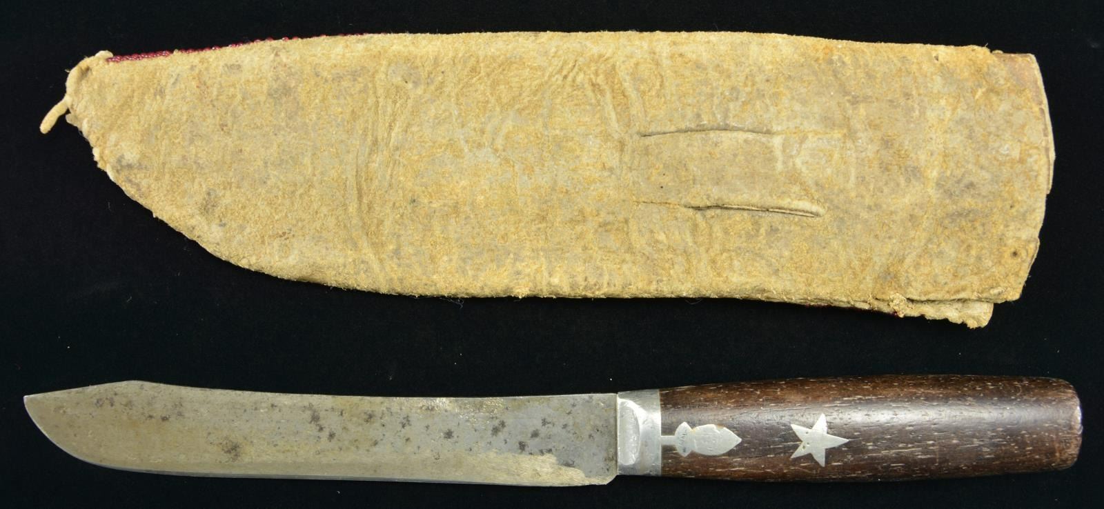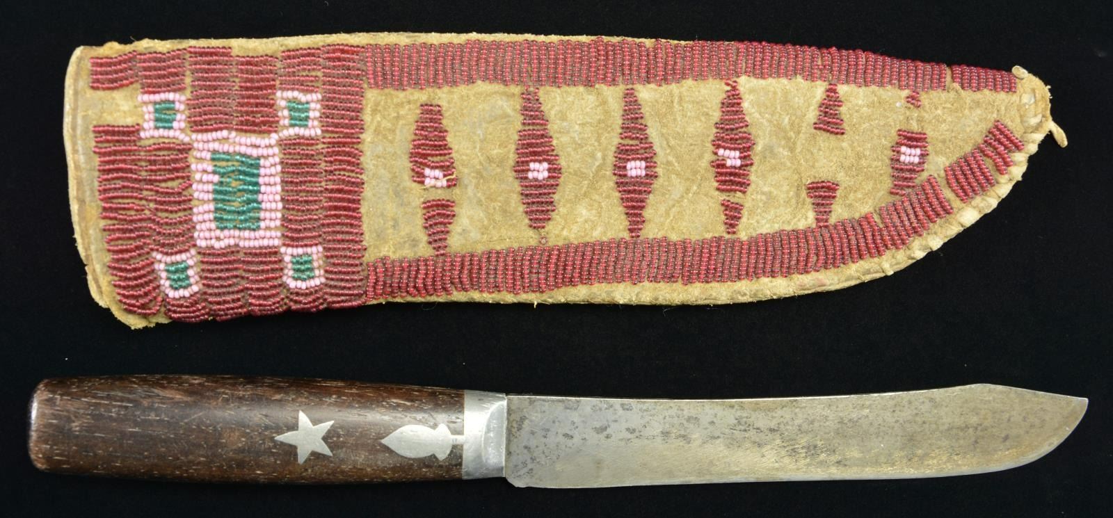 9.25" x 2.75", sinew sewn, full coverage with pink & green beads on red ground. Pewter mounted hunter/skinner knife 10.5" overall, 6.5" unmarked blade, inset pewter star in wood grip. This knife & sheath from the Floyd Ritter collection is pictured on page 3 of John Baldwin's 1997 text "EARLY KNIVES & BEADED SCABBARDS OF THE AMERICAN FRONTIER". CONDITION: very good overall, small loss of beads, old sharpening to blade. PROVENANCE: From the Lifelong Collection of Glen E. Mattox. (02-18351/JS). $600-800.
