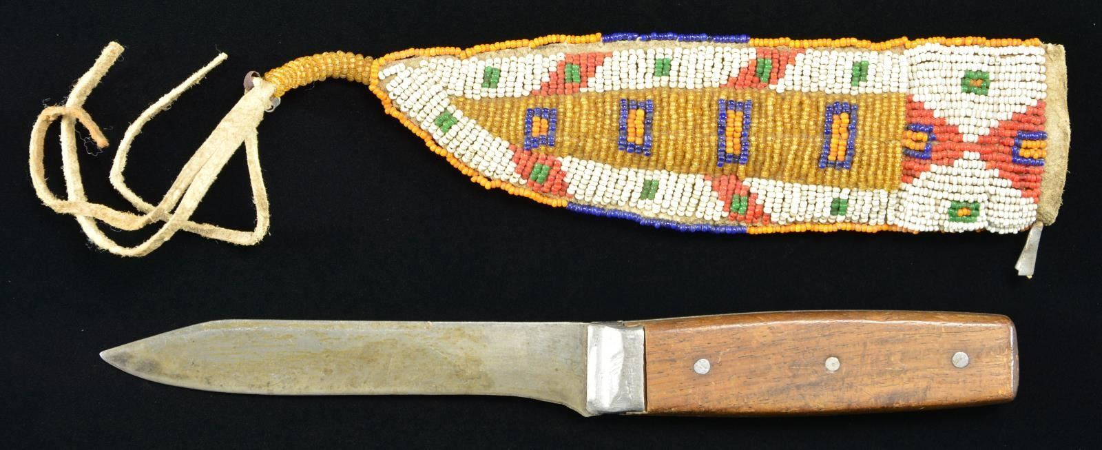 7.5" x 2", sinew sewn, full coverage with transparent yellow, orange, navy blue, red, & green beads on white ground, 6" rawhide drop with 1.5" beaded and 2 tinkle cones. Pewter bolster 9.5" mounted hunter/skinner with 6" unmarked blade. This knife & sheath from the Floyd Ritter collection is pictured on page 3 of John Baldwin's 1997 text "EARLY KNIVES & BEADED SCABBARDS OF THE AMERICAN FRONTIER". very good overall, one tinkle cone missing at throat, beads complete. CONDITION: very good overall, one tinkle cone missing at throat, beads complete. PROVENANCE: From the Lifelong Collection of Glen E. Mattox. (02-18355/JS). $300-500.