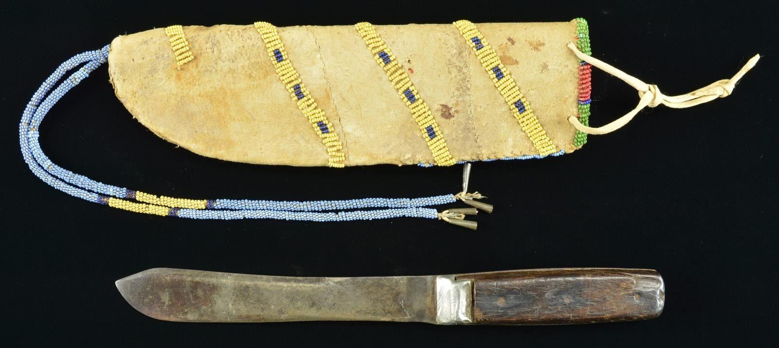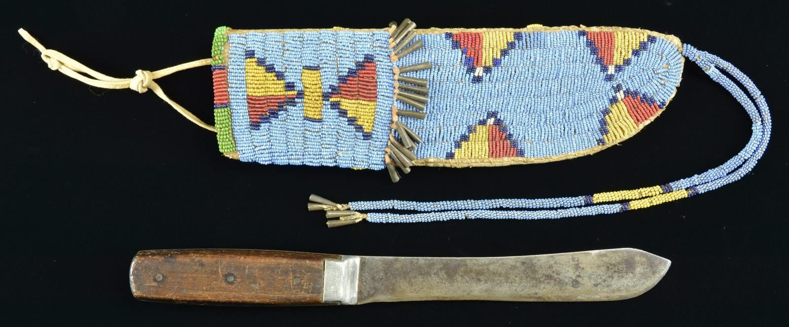 SHEATH & KNIFE. 10" x 3", sinew sewn, full coverage one side & 20% on other with navy blue, green, black, white-heart red, greasy yellow, & white beads on turquoise blue ground. Row of tinkle cone embellishments on front side. 12" beaded drop with tinkle cones. Pewter bolster hunter/skinner knife 11.5" overall, 7" unmarked blade. This knife & sheath from the Floyd Ritter collection is pictured on page 3 of John Baldwin's 1997 text "EARLY KNIVES & BEADED SCABBARDS OF THE AMERICAN FRONTIER". CONDITION: very good overall, complete with no losses. PROVENANCE: From the Lifelong Collection of Glen E. Mattox. (02-18359/JS). $800-1200.