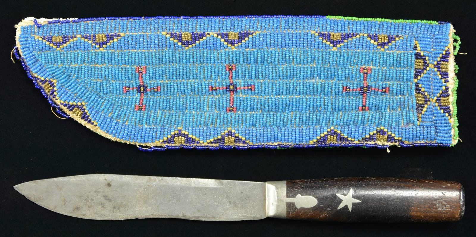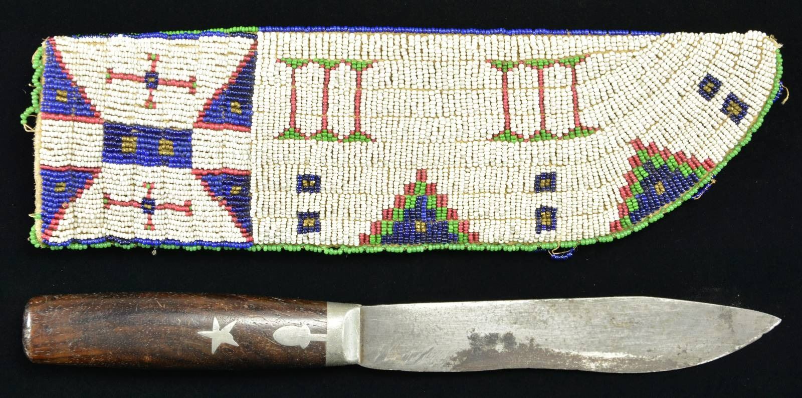 KNIFE SHEATH & KNIFE. 10" x 3", sinew & thread sewn sheath, full coverage on both sides, blue ground one side and white other. Pewter mounted hunter/skinner knife 10.5" overall, 6" blade with etched maker: "GOODELL'S STAR HUNTER, PAT. OCT. 6 1869". This knife & sheath from the Floyd Ritter collection & pictured on page 3 of John Baldwin's 1997 text "EARLY KNIVES & BEADED SCABBARDS OF THE AMERICAN FRONTIER". Condition: good overall, scattered loss of beads on edges PROVENANCE: From the Lifelong Collection of Glen E. Mattox. (02-18361/JS). $600-800.