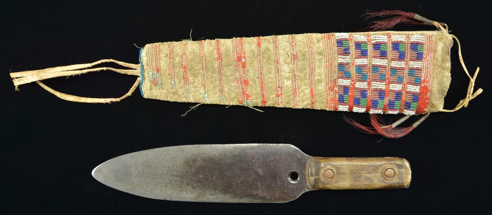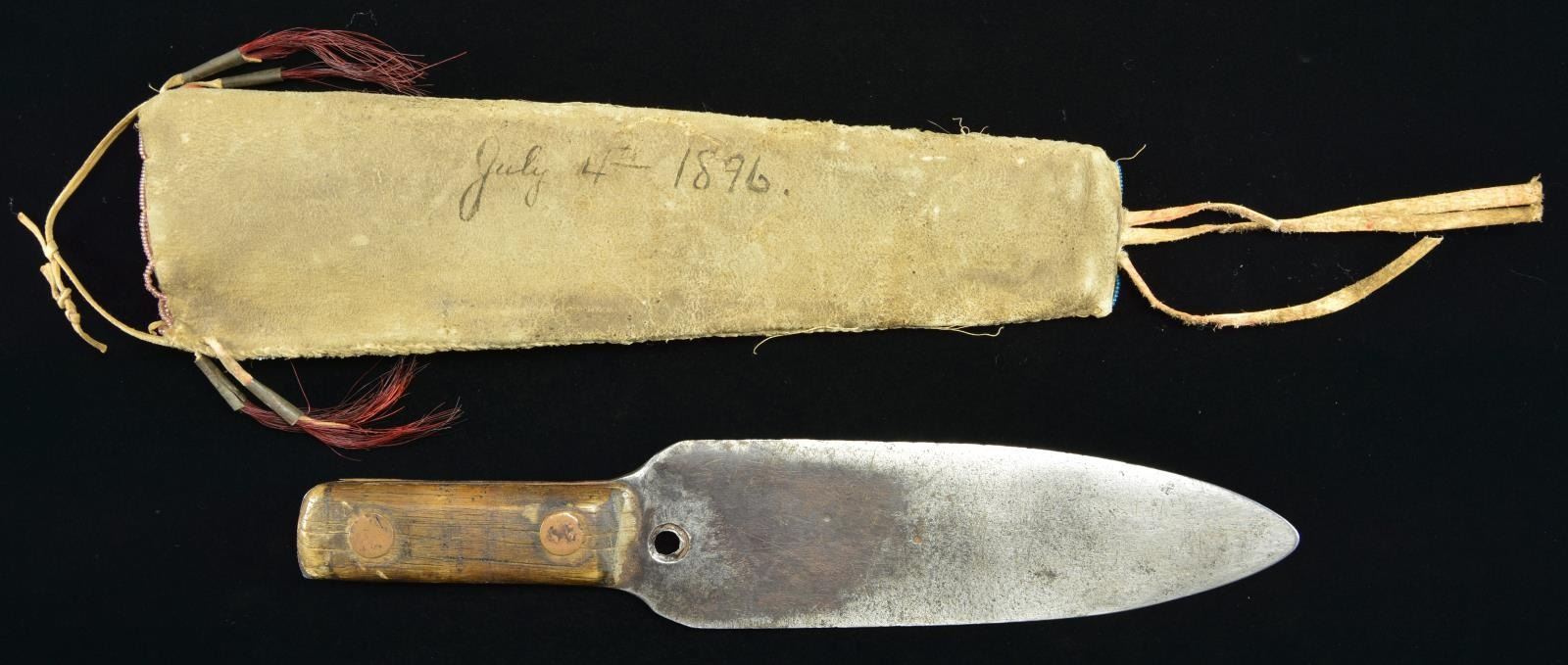 KNIFE, DATED 1896. 11" x 3", sinew & thread sewn, 3" x 3" beaded geometric panel at top with quilled design above & below. White-heart red, navy blue, green, transparent pink, & white beads; red and blue dyed porcupine quill. "July 4th 1896" is written an old brown ink, when this sheath was collected most likely at unknown rendezvous. 12" utility knife with 8" long, 2" wide blade is different knife than it is pictured in center of page 3 of John Baldwin's 1997 text "EARLY KNIVES & BEADED SCABBARDS OF THE AMERICAN FRONTIER". Page 3 is Floyd Ritter collection. Rarely are these artifacts dated. CONDITION: good overall, sound, all beads intact, delicate quill work has large losses. PROVENANCE: From the Lifelong Collection of Glen E. Mattox. (02-18362/JS). $800-1,200.