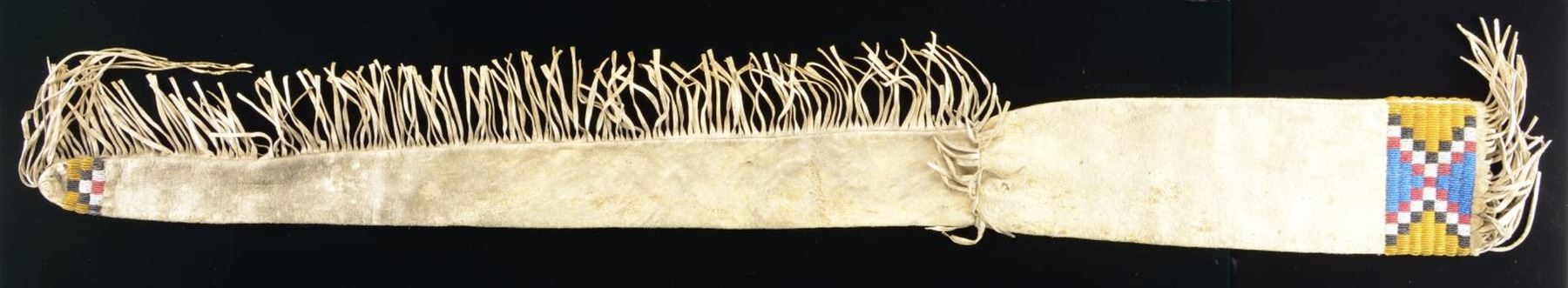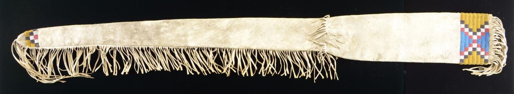 55" x 6" leather sleeve with beaded design at mouth & tip in blue, whiteheart red, white, black, and yellows. Mr. Mattox's tag states circa 1880s. Should fit a long barrel Winchester model 1873 rifle. CONDITION: good overall, beads & fringe appear all intact, soiled & stained. PROVENANCE: From the Lifelong Collection of Glen E. Mattox. (02-18798/JS). $800-1,200.