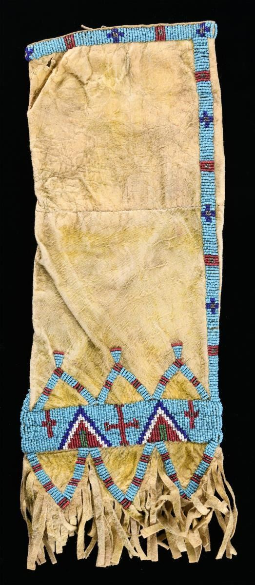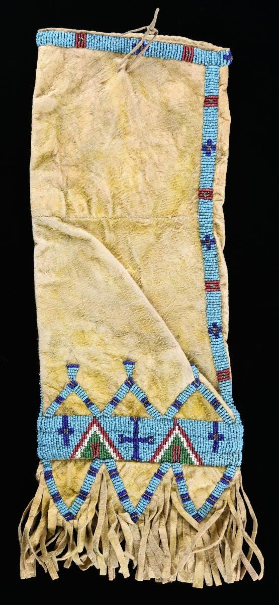 TOBACCO BAG. 17" x 6.25" overall including rawhide fringe, whiteheart red, dark blue, sky blue, white, & metallic silver sinew sewn beads, ocher paint. Mr. Mattox's tag identifies this bag as circa 1890 Sioux. CONDITION: good overall, beads & rawhide fringe appear complete. PROVENANCE: From the Lifelong Collection of Glen E. Mattox. (02-18911/JS). $500-800.