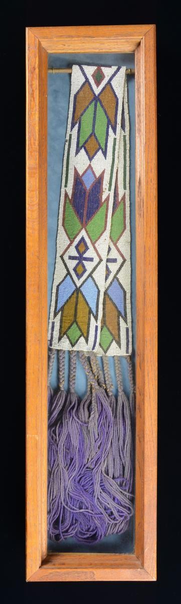 34" x 3.25" beaded panel with 20" woven purple fringed ends. All thread sewn beads mounted in shadowbox. Beads are whiteheart red, black, light blue, dark blue, green, & gold yellow on a white ground. Finely sewn so beaded panel is reversible. CONDITION: beaded panels are mostly intact with small losses, the purple tassels are light faded next to glass. Shadow box is simply stapled together. The sash could be removed as it is only attached to backboard by a few whip stitches for much easier shipping. (02-19340/JS). $800-1,200.