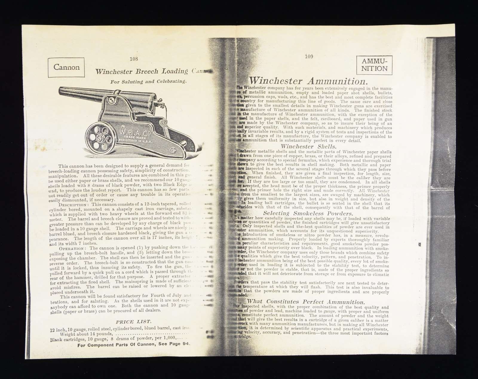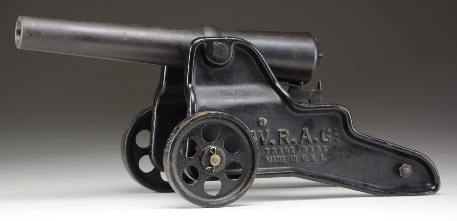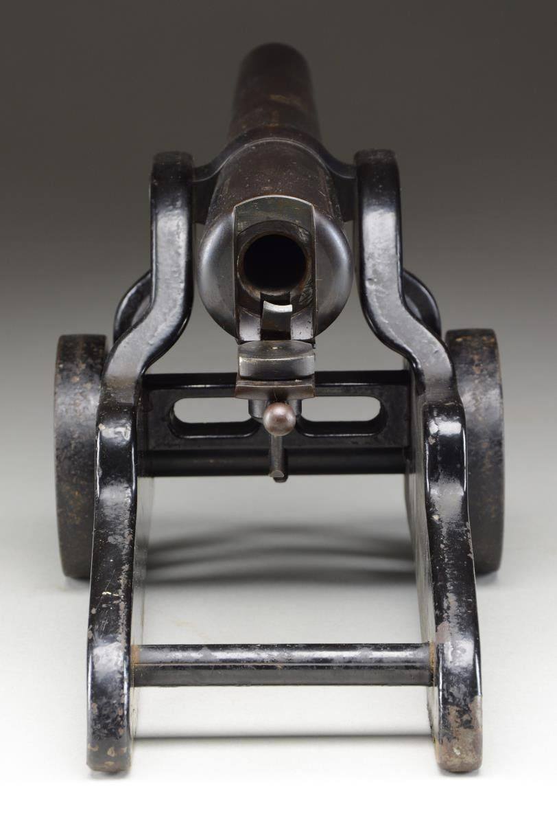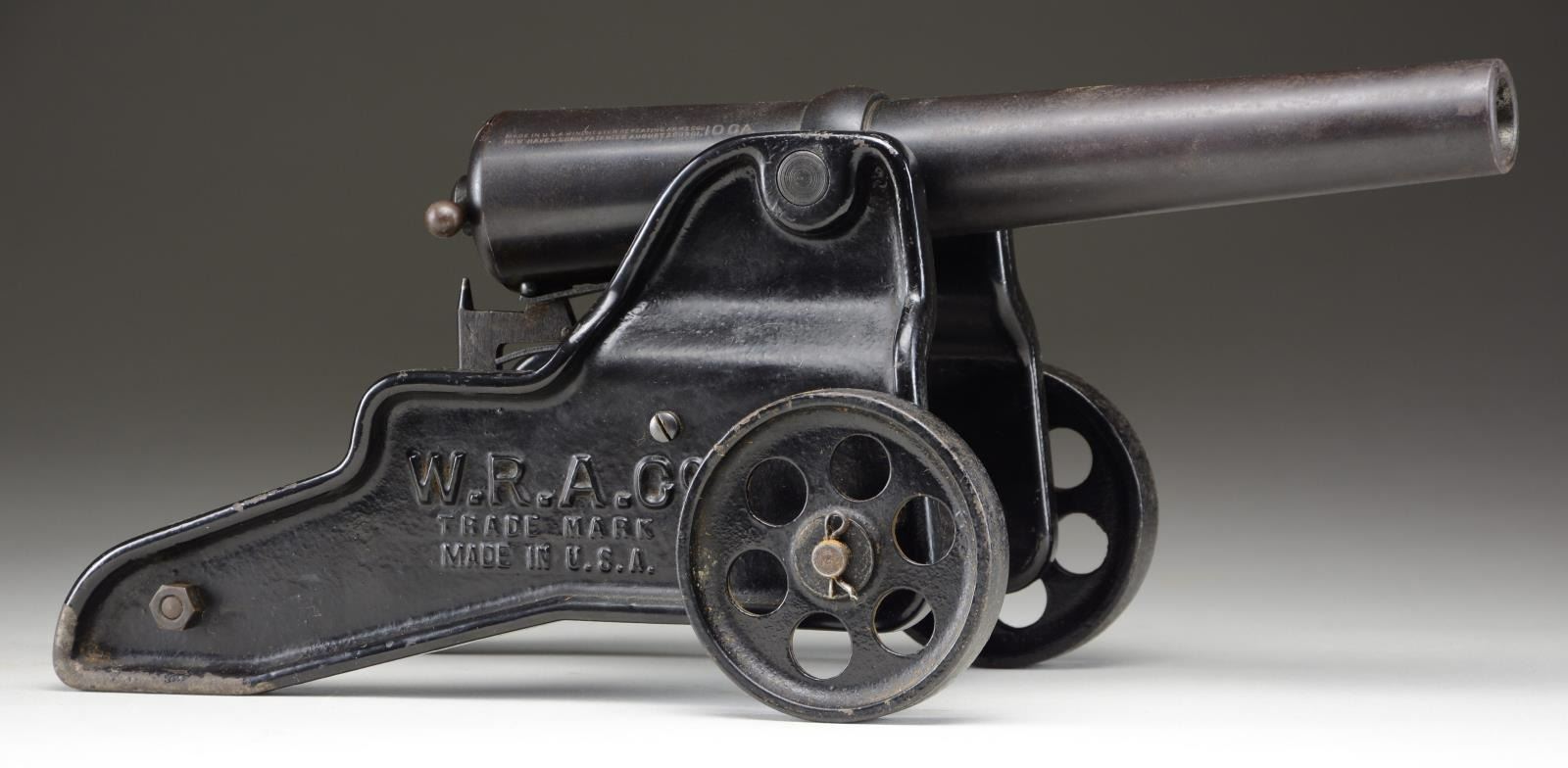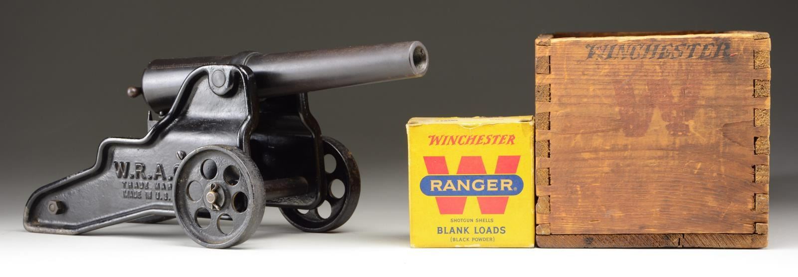 Cal. 10 Ga., 2 7/8" blank loads. NSN. Bbl. 12". Bbl. & breech are blued. Cast iron carriage & wheels have Japan black finish. Nearly 19,000 were made before they were discontinued in 1958. UNATTACHED ACCESSORIES: original wooden crate. Crate has age darkened finish w/ large chip missing on one side of bottom. Yellow Winchester Ranger box containing 18 loaded shells. Photo copied instruction & price list. CONDITION: very good, retaining 90% finish. Good bore shows no significant pitting. (02-20988/DS). NON GUN. $1,500-2,000.