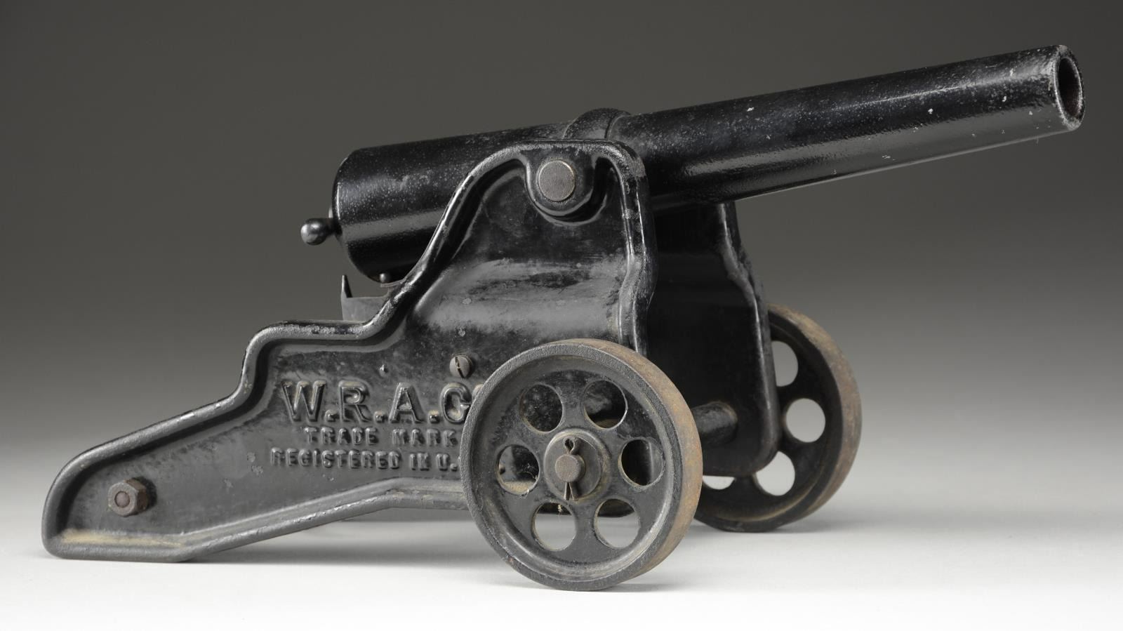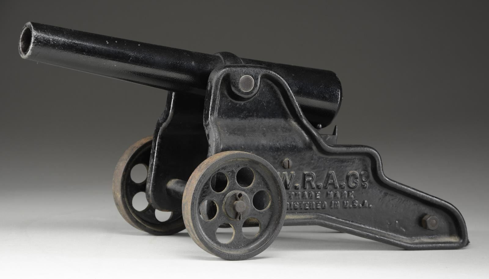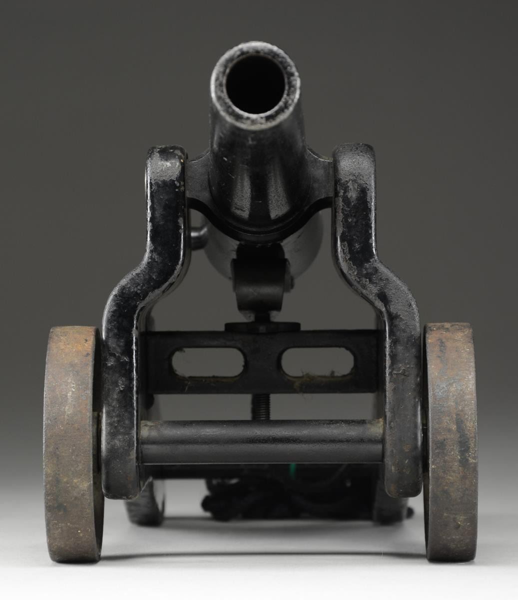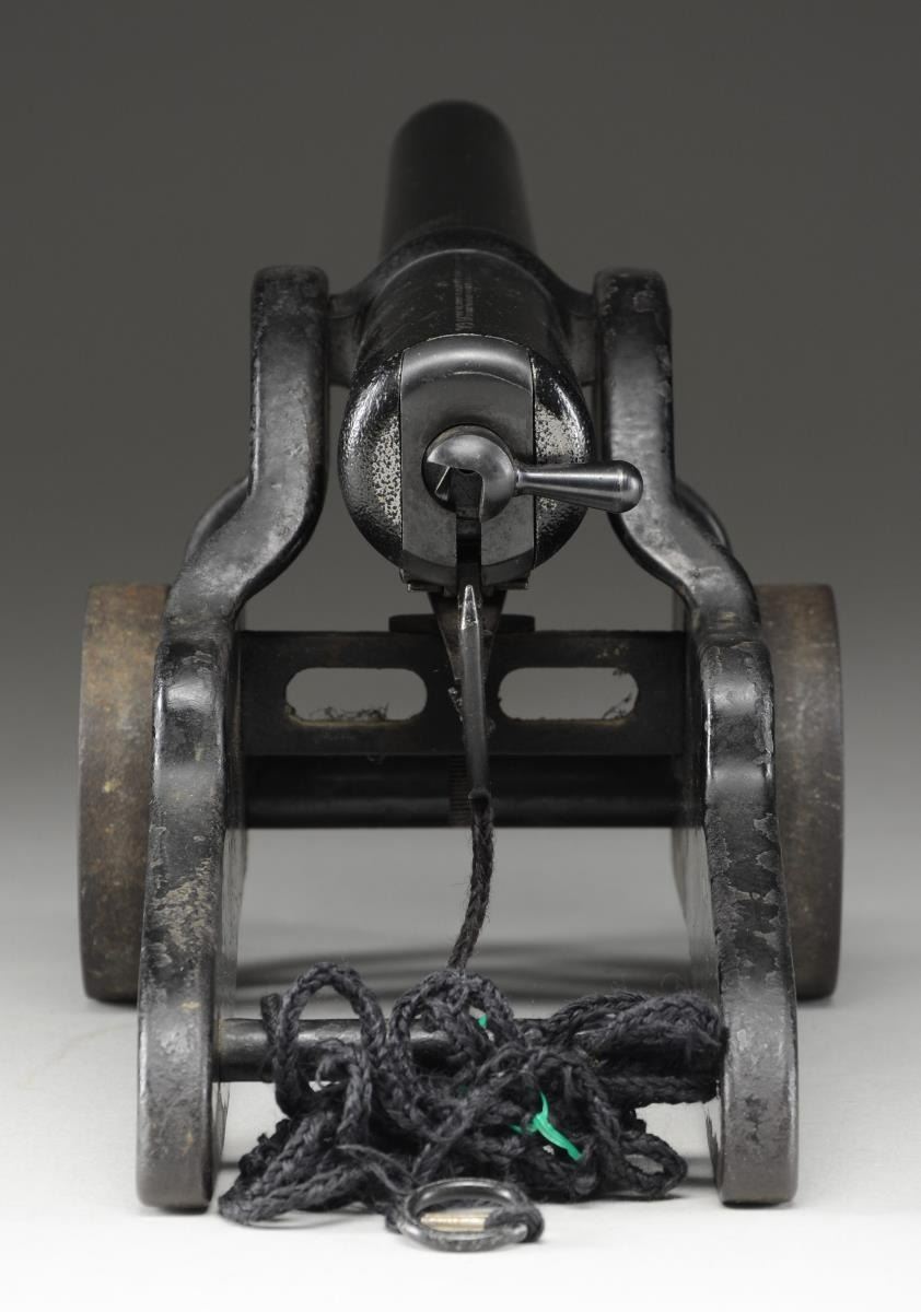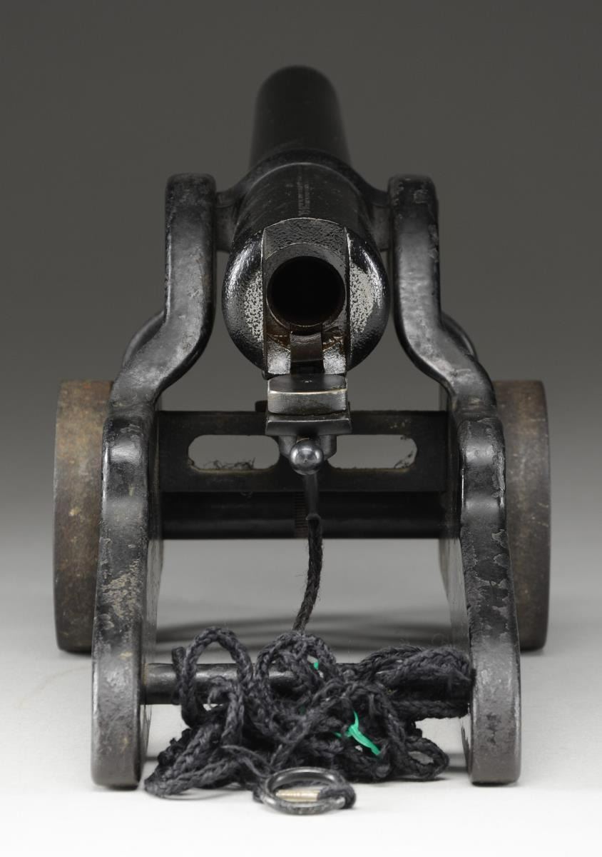 Cal. 10 Ga. Blanks. Assembly S# 396A. Bbl. 12" w/ 1 1/4" diameter at muzzle. Black painted iron carriage & wheels. Black nylon cord Mfg. 1908-1958. CONDITION: good overall. cannon & carriage have been repainted black over pitting throughout, noticeable peeling of paint on carriage. Pitted bore. Cord shows fraying. (02-19924/MD). $700-1,000.