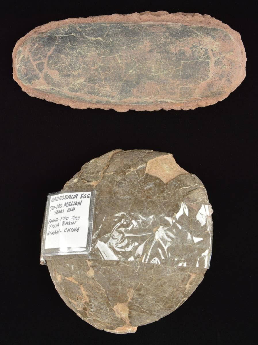 Both apparently excavated from the same site in China. One is elongated Raptor egg, the other identified by tag as "Hadrosaur 70 to 100 million years old, found in Kao Guo Basin, Hinan, China. Eggs measure about: 5" x 6" x 3" plus inch of hard rock each was chipped from and 7.5" x 2" for the raptor. CONDITION: fair to good overall and typical of other fossilized eggs, some chipping and a piece glued on the Hadrosaur. PROVENANCE: From the Lifelong Collection of Glen E. Mattox. (02-18972/JS). $600-1,200.
