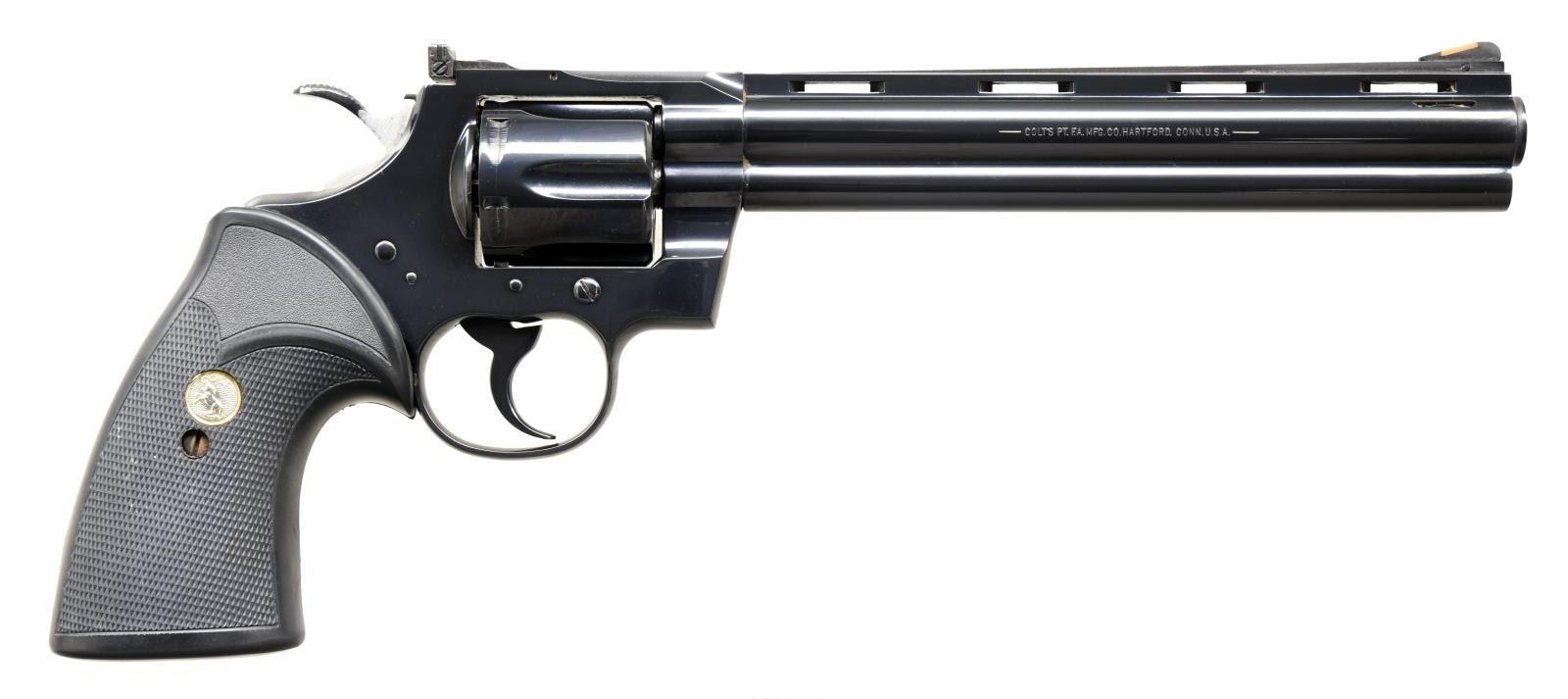 Cal. 357 Mag. S# PN05380. Bbl. 8" VR. Ramped serrated front sight w/ orange insert. Adjustable rear sight w/ white outline. Mfg. 1995. Blue finish. Pachmayr Presentation grips w/ gold Rampant Colt Medallions. UNATTACHED ACCESSORIES: blued Leupold FX-II 2x20mm handgun scope w/ rings & Burris mount. Scope has duplex crosshair reticle w/ very good optics. Also included is an unnumbered blue factory hardcase w/ foam inserts. CONDITION: grips show light handling wear. Metal retains 98% original blue w/ light drag line on cyl. & scattered dried preservative grease. Very good bore w/ dried grease. (23-4950/MJC). MODERN. $2,500-3,500.