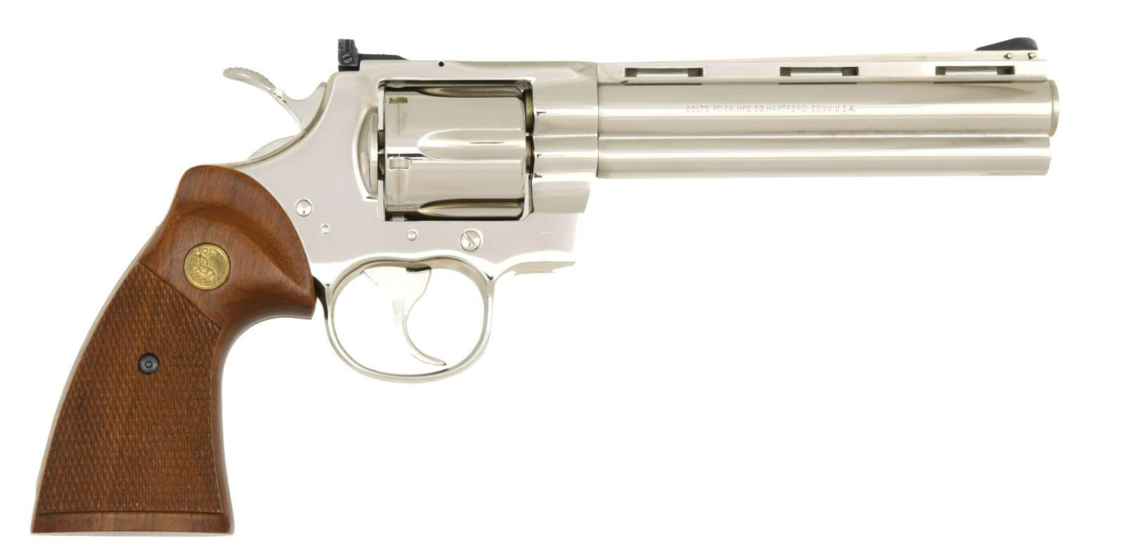 WITH CASE. Cal. 357 Mag. S# K82284. Bbl 6". Python double action revolver manufactured by Colt in 1982. The left side of the barrel is stamped "PYTHON 357/ * 357 MAGNUM CTG. *", with Colt's single line address across the right. Left side of frame bears the Rampant Colt logo and "VP" proof. Metal components exhibit a nickel plated finish, with the frame being mounted with 2 piece Colt gold medallion checkered wood grips. Blued serrated ramp front sight with blued adjustable square notch rear sight. UNATTACHED ACCESSORIES: Colt Custom Shop wood display case featuring a red felt interior. CONDITION: extremely fine, with metal components retaining bountiful amounts of their original factory nickel plated finish, exhibiting few minute superficial marks from handling and storage overall. Cylinder bears a light dragline. Mirror bore, exhibiting well defined rifling throughout, with a few traces of what appears to be factory grease. Grips show some light smoothing from handling, but are otherwise excellent. Case shows some mild exterior wear, but is otherwise very good overall. A very nice example of an always desirable Colt Python revolver. (23-4676/MLW). MODERN. $2,000-3,000.