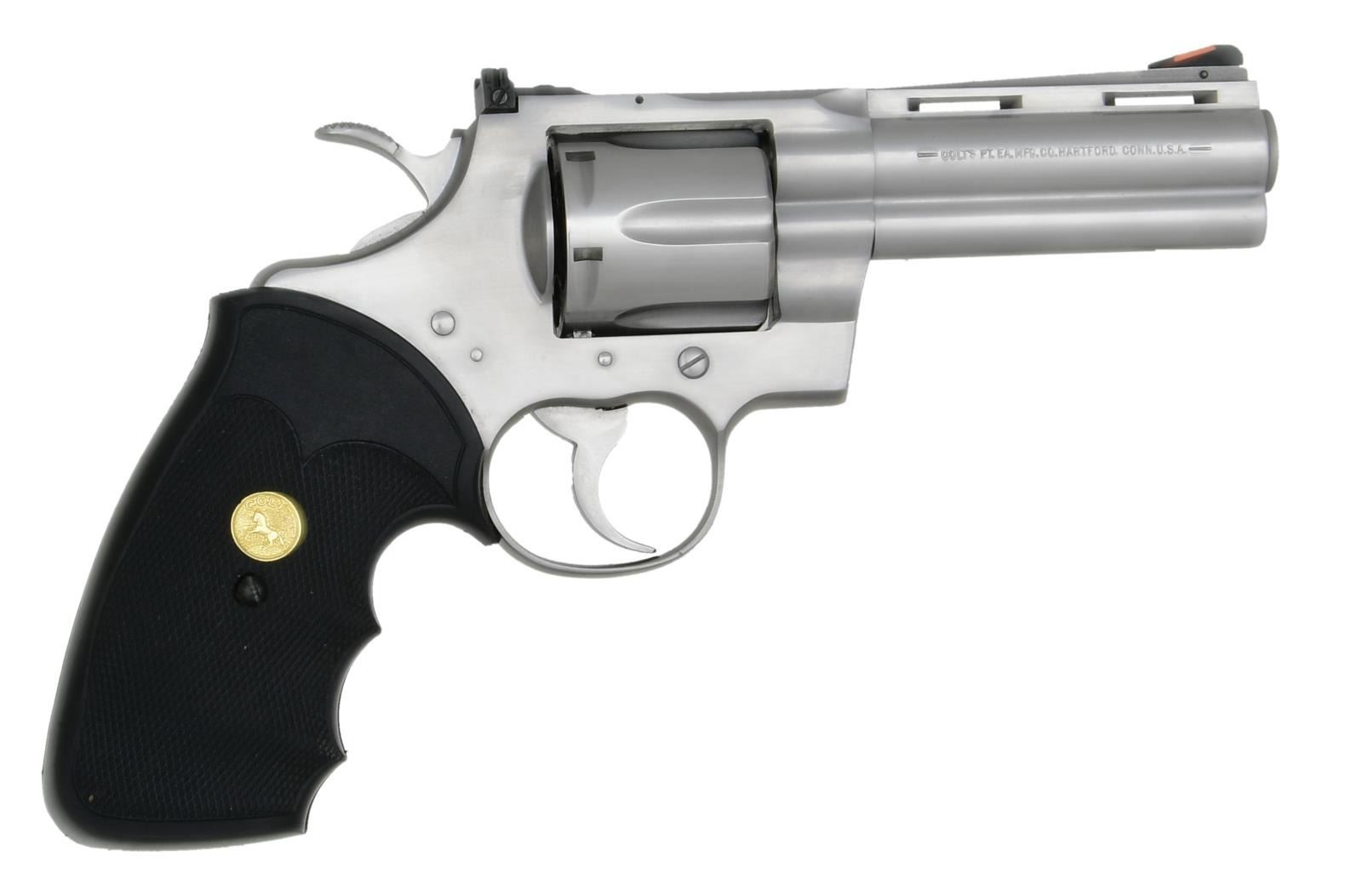 Cal. 357 Mag. S# PY2648. Bbl 4". Python double action revolver manufactured by Colt in 1993. The left side of the barrel is stamped "PYTHON .357/ * .357 MAGNUM CTG. *", with Colt's single line address stamped across the right. Left side of frame bears the Rampant Colt logo and "VP" proof. Metal components exhibit a polished stainless steel finish, with the frame being mounted with 2 piece Colt gold medallion checkered black rubber Pachmayr "Gripper" grips. Vent rib with ramp front sight and adjustable square notch rear sight. CONDITION: metal components are very good overall, exhibiting some mild superficial marks from handling and storage. Mirror bore, exhibiting well defined rifling throughout. Grips are very good overall. (23-1014/M LW). MODERN. $1,500-2,500.