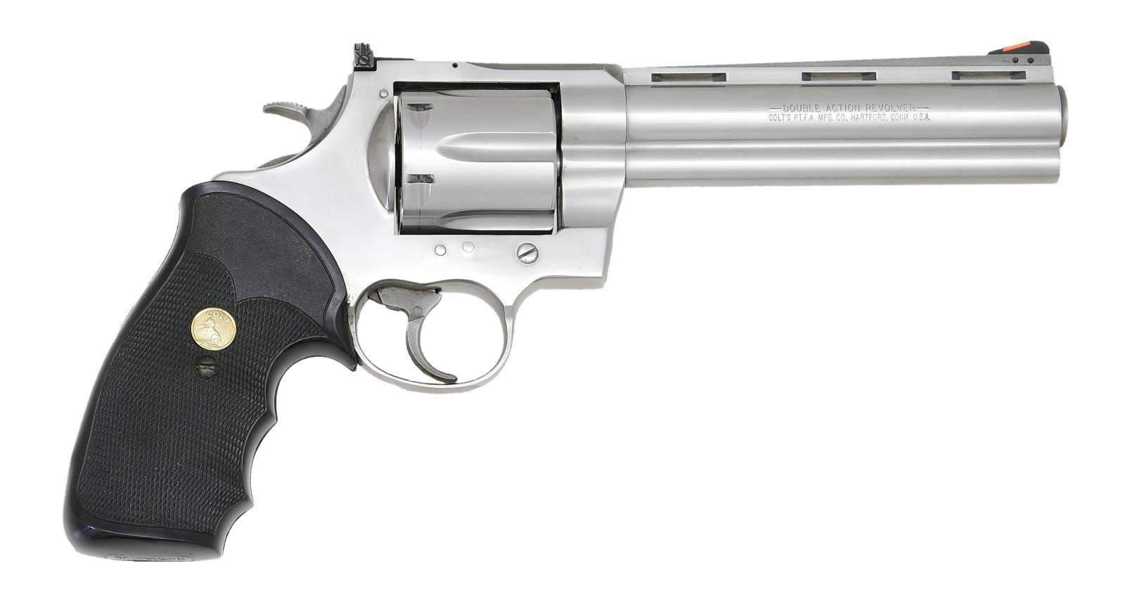 Cal. 44 Mag. S# MM18169. Bbl. 6" VR w/ full lug. Mfg. 1992. White outline Accro rear sight. Ramped blade front sight w/ orange insert. Stainless finish. Rubber finger groove grips w/ gold rampant Colt medallions. CONDITION: grips show light handling wear. Cyl. has a drag line, metal otherwise shows some light scratches & handling wear. Bright near excellent bore. (23-1026/MJC). MODERN. $1500-2250.