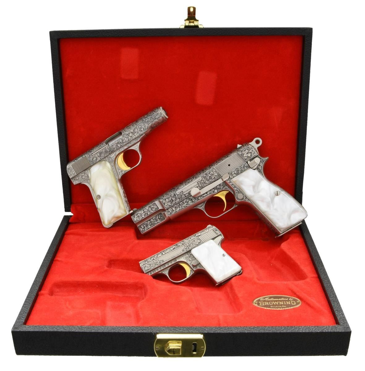 3) BABY BROWNING SEMI-AUTOMATIC PISTOL. Cal. 6.35mm. S# 384726. Bbl 2 1/8". Left side of slide is engraved "BROWNING ARMS COMPANY/ MADE IN BELGIUM". Frame and slide exhibit full coverage deep cut vine and floral engraving. French gray finish with gold plated trigger. Frame is mounted with 2 piece smooth synthetic pearl grips. UNATTACHED ACCESSORIES: factory black leatherette display case featuring a red velvet lining, as well as a photo board from the Virginia Plak Company of New York, NY. CONDITION: excellent, with metal components exhibiting few light superficial marks from storage and handling. Brilliant mirror bore, exhibiting well defined rifling throughout. Grips are excellent overall. Case is near excellent, with a few superficial marks from handlinga nd storage. Picture board exhibits some scattered marks from handling and storage, some separation of the protective filament over the photo, some mild staining on the rear, but otherwise present nicely overall. An extremely fine set of beautiful renaissance engraved Belgian Browning pistols. PROVENANCE: From the Estate of Jon Thomas. (23-1633/MLW). ALL CURIO. $7,500-10,000.